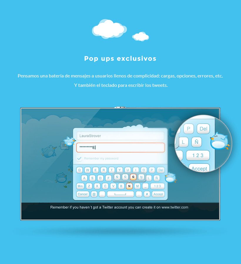 Nuestro equipo en Telefónica adaptó lo que era Twitter para su propia plataforma de Smart TV. El objetivo era crear, rediseñar y llevar a la tele esta red social. Al tener un solo mando a distancia para tener todas las funcionalidades que Twitter ofrecía en ordenador teníamos muchas limitaciones de usabilidad que salvar. Queríamos crear una App más atractiva que la versión web y móvil en su momento.