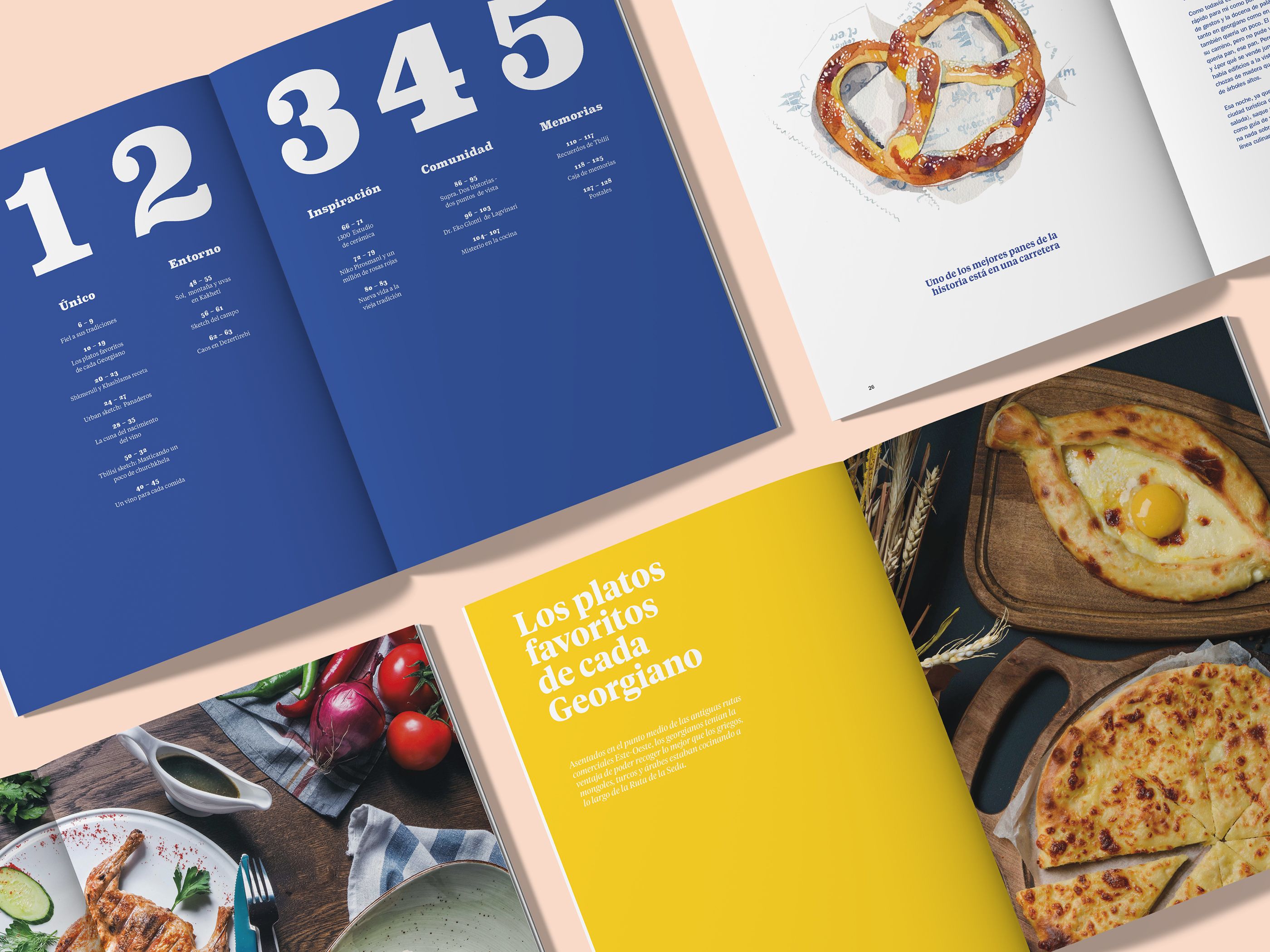 El tema del primer número de la publicación es Georgia. Es un buen ejemplo de las regiones con una oferta gastronómica espectacular y muy propia pero que pasa desapercibida. Dependiendo de la oferta gastronómica de cada lugar los temas de los artículos se pueden variar pero la publicación sigue una estructura base. Esta partida en 5 capítulos: