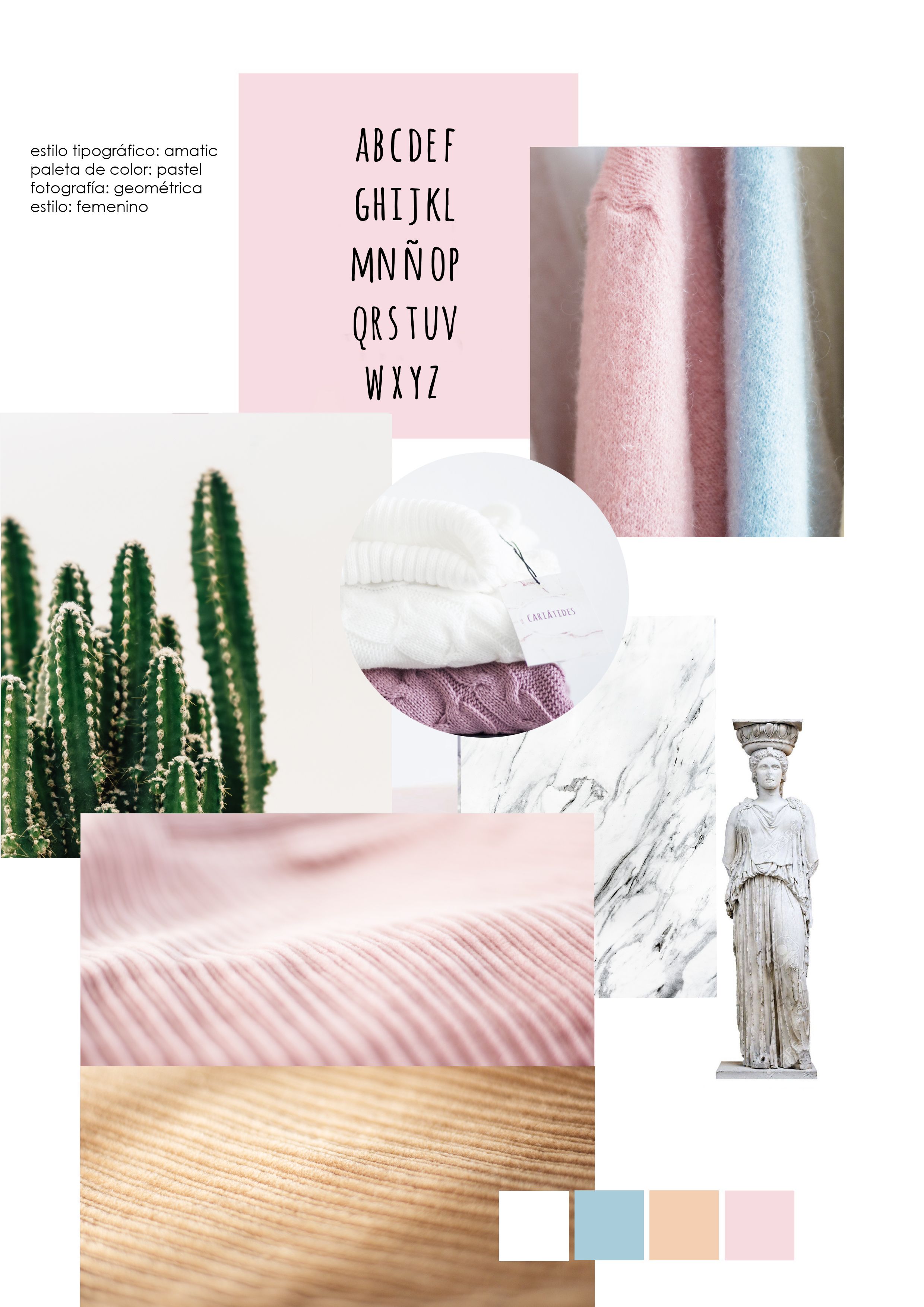 Mi proyecto es Cariátides, una tienda de ropa femenina. Los valores que quiero transmitir son juventud y vitalidad. La paleta de colores de tonos pastel. La tipografía es AMATIC y el estilo fotográfico es geométrico