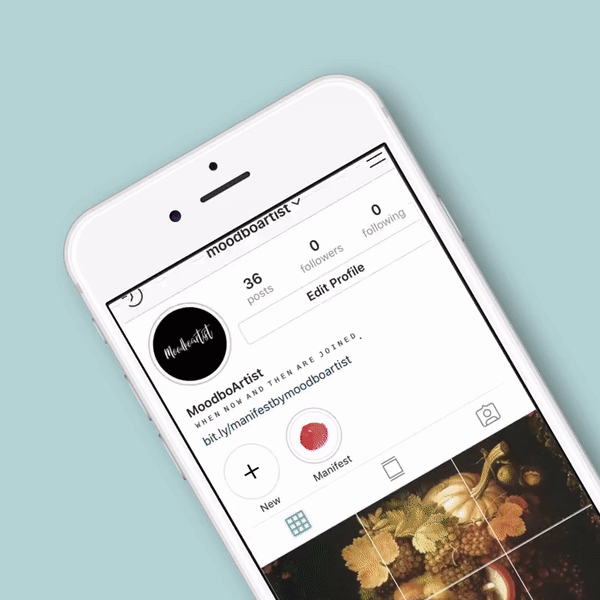 Usaría la propia grilla de Instagram como Moodboard y luego mostría la obra terminada.