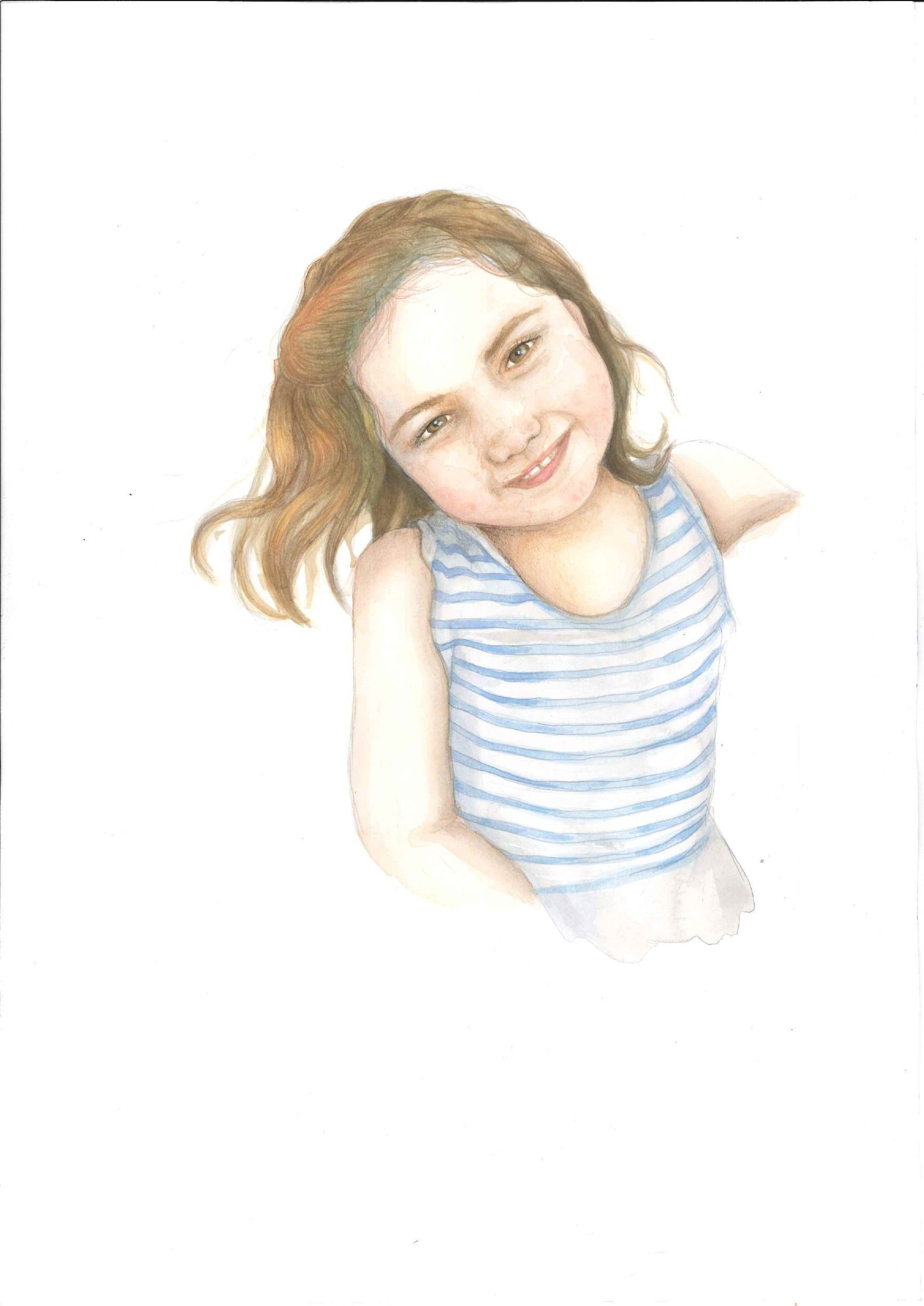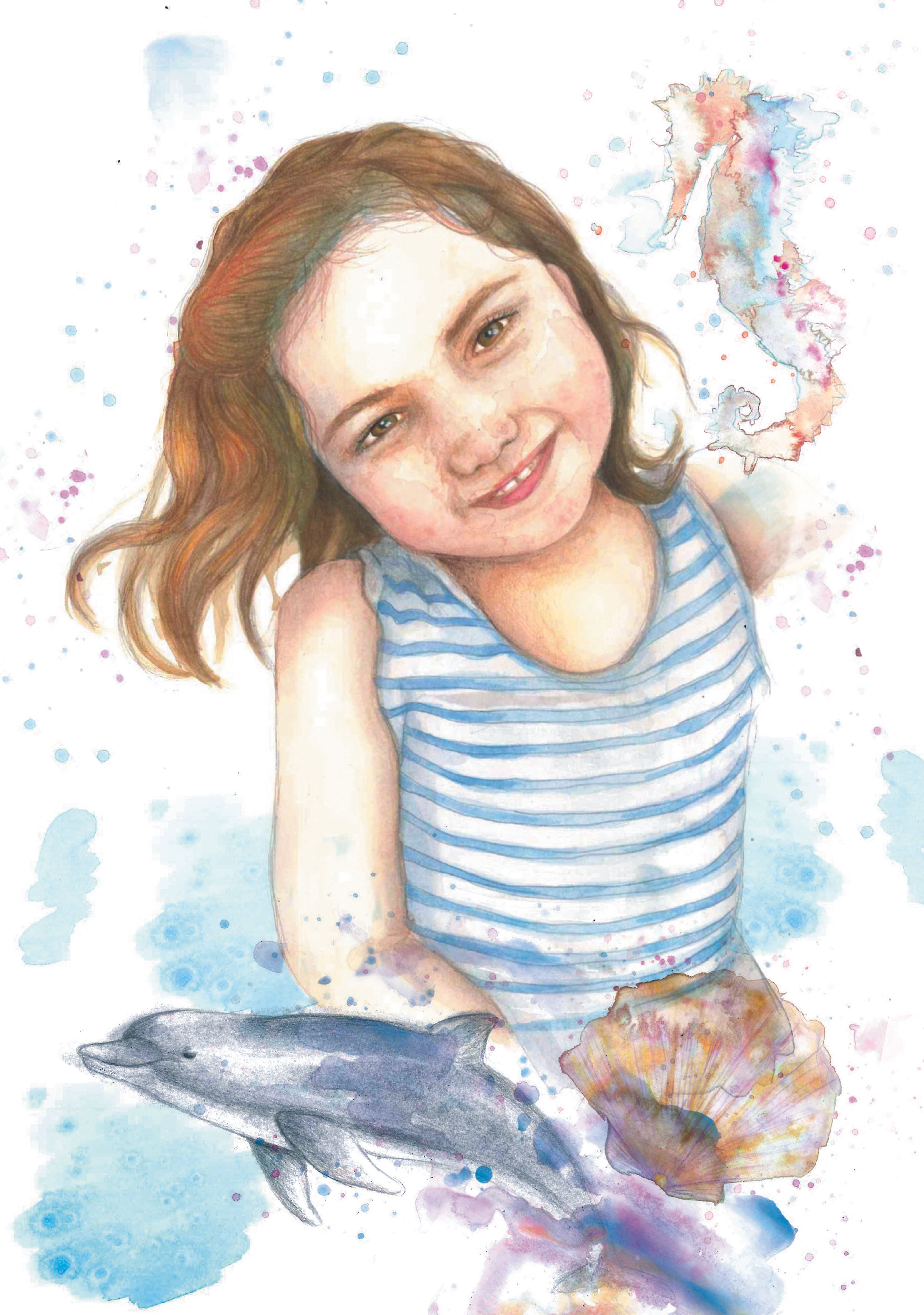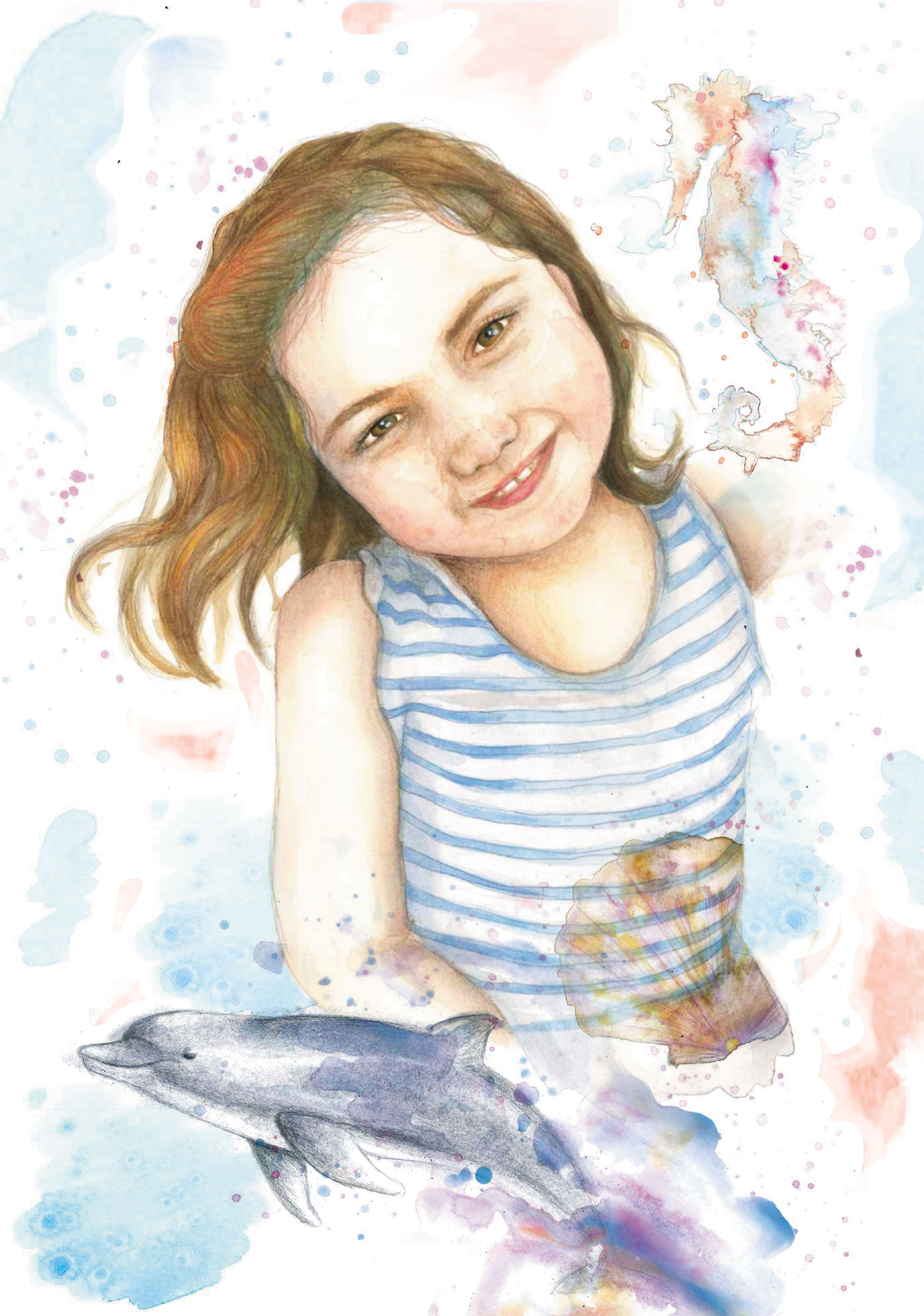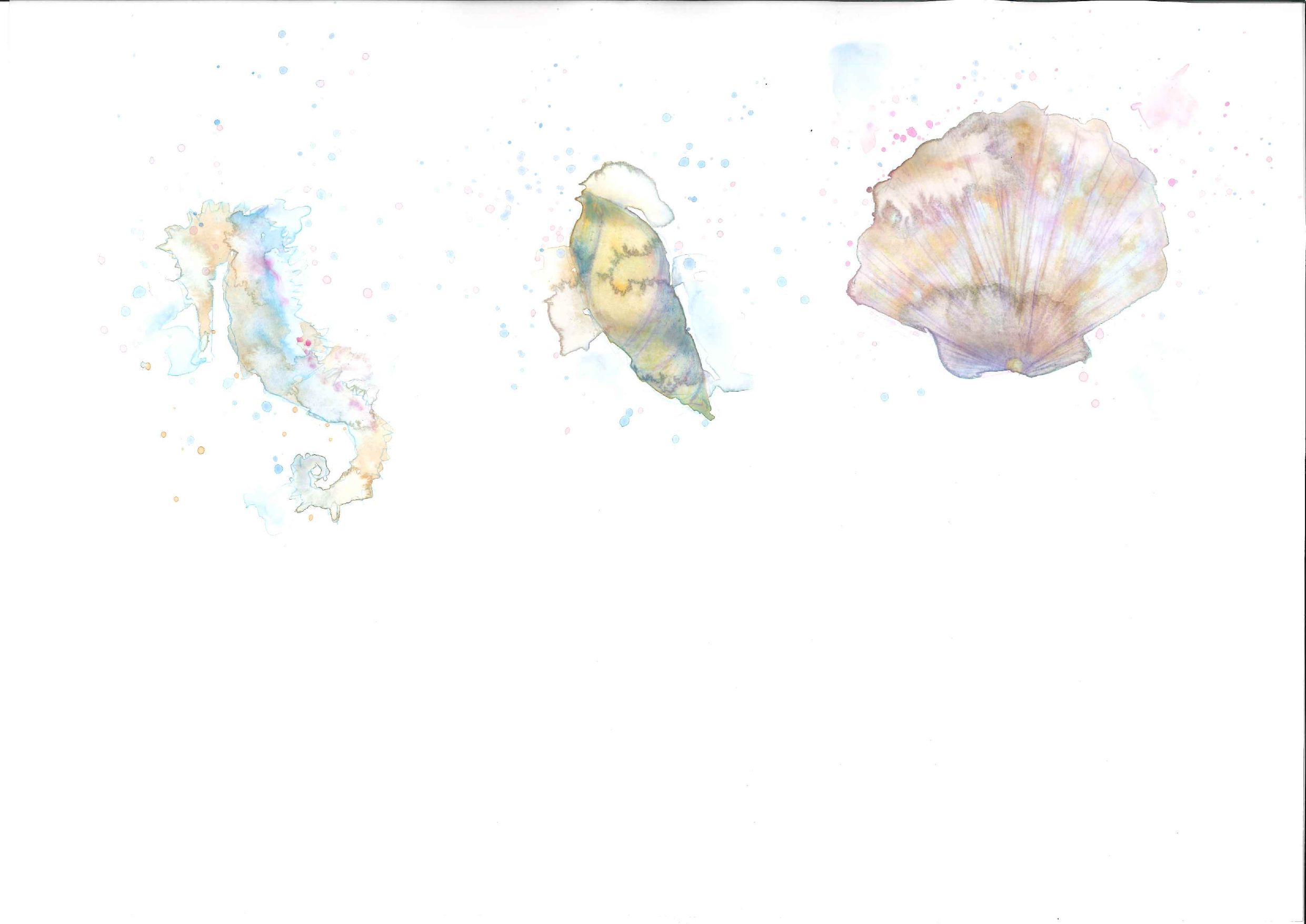 Este es el resultado final que más me ha convencido.Este es el retrato escaneado en acuarela y técnicas secas.Este es el otro protagonista :POtros elementos marinos, aunque en la composición la caracola no me acabó de convencer para este retrato.Manchas intuitivasEste fue casi el resultado final, pero le cogí manía y lo pude arreglar.