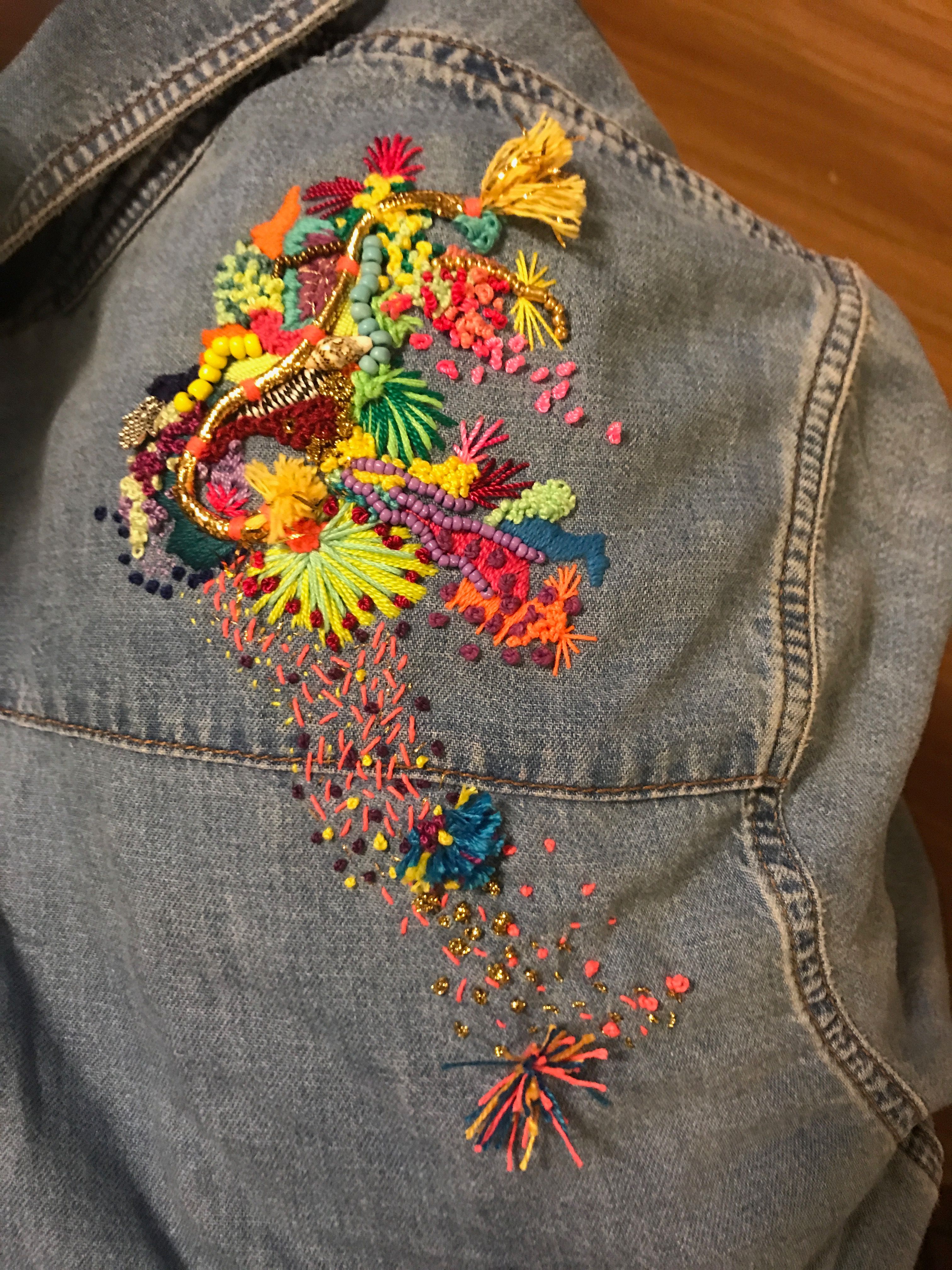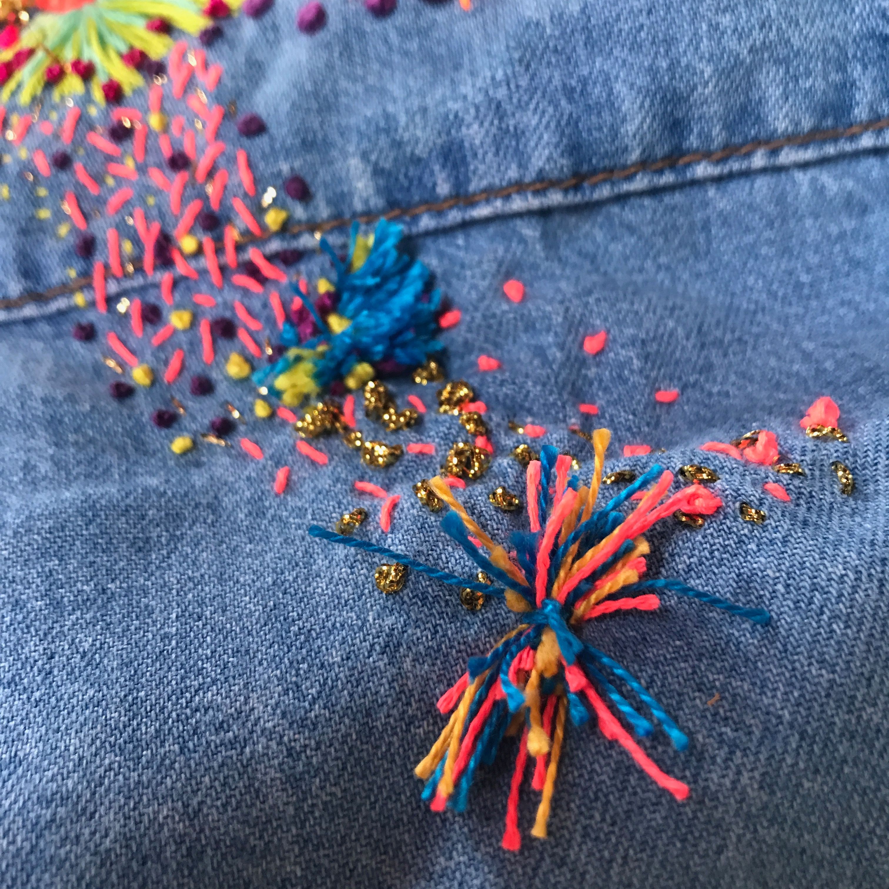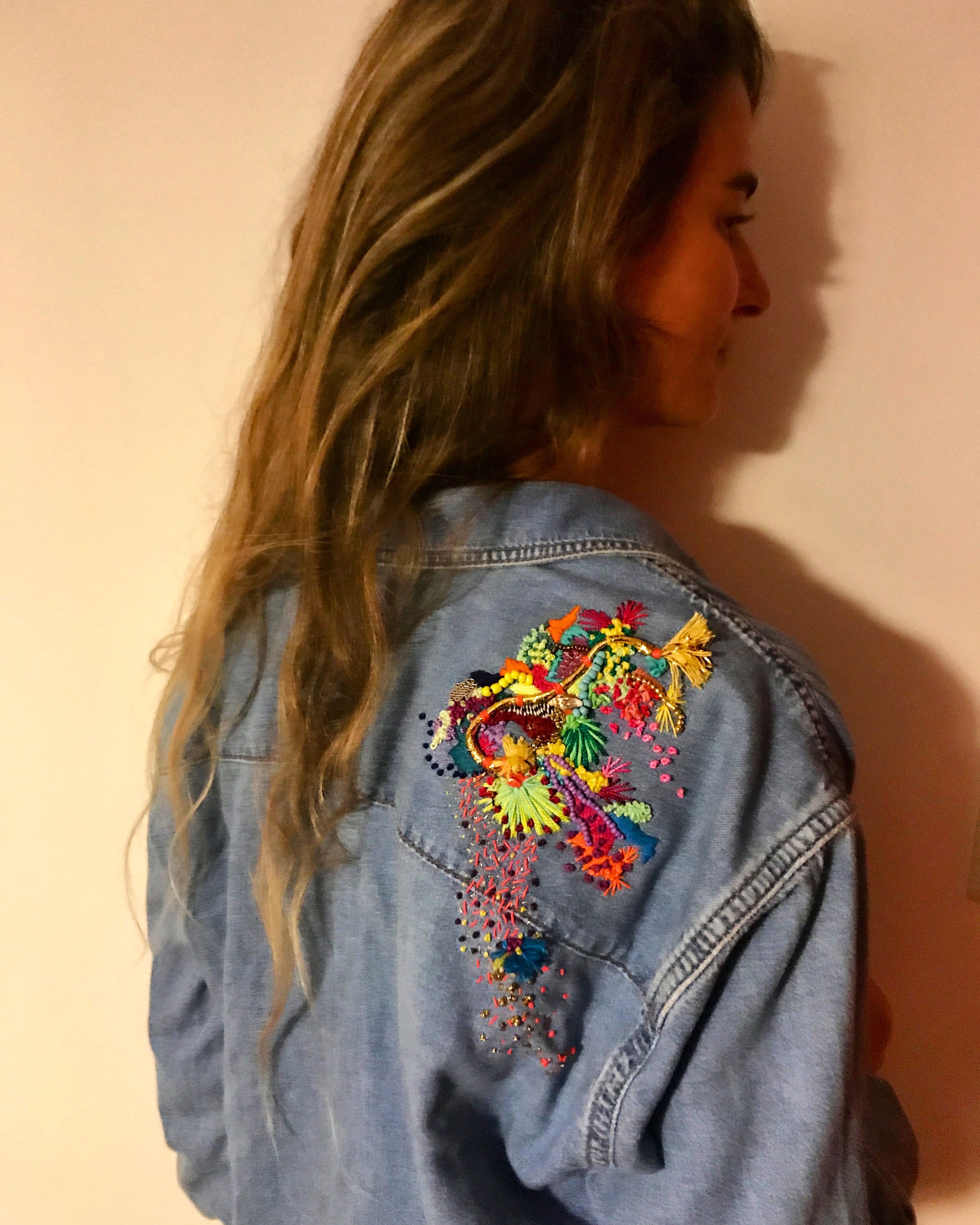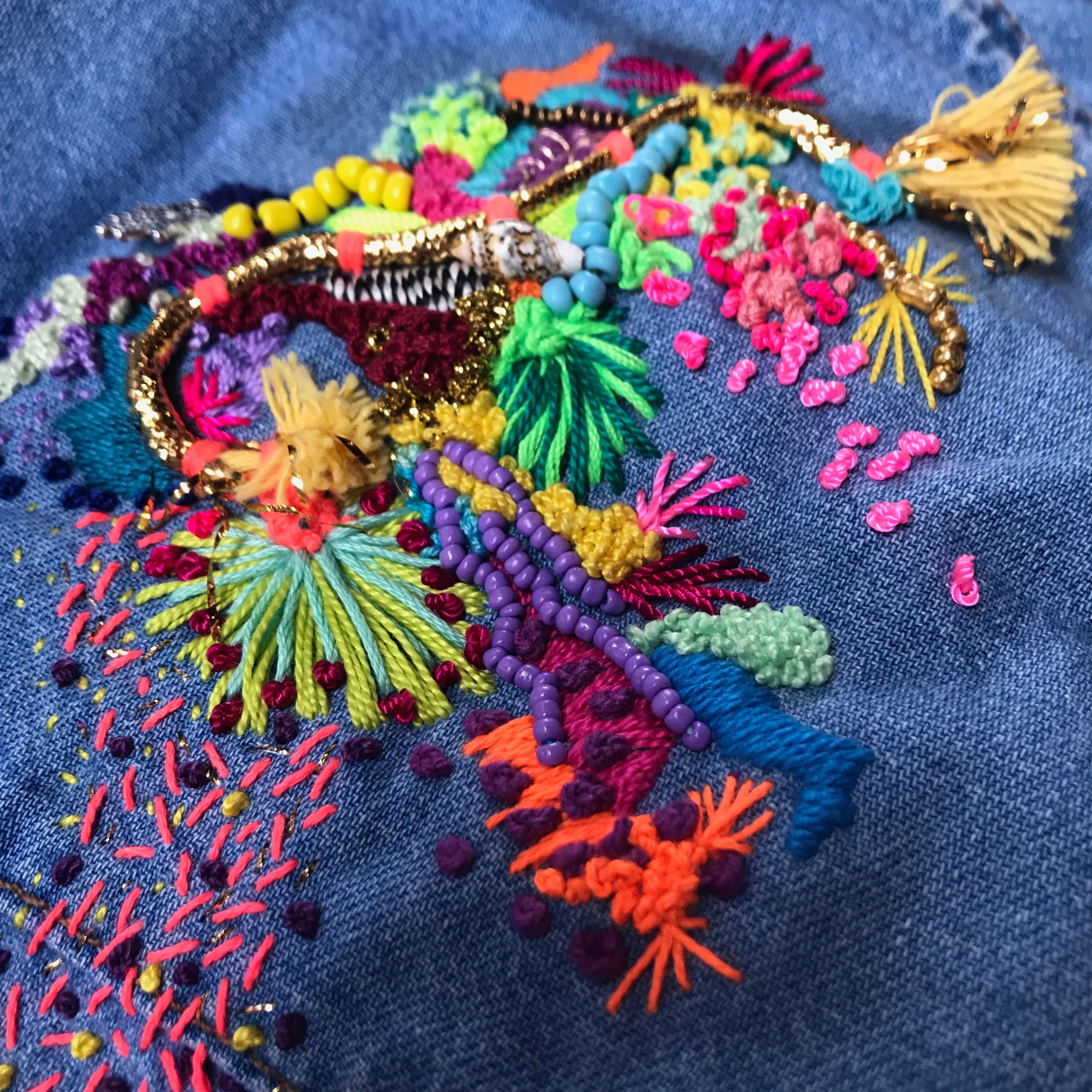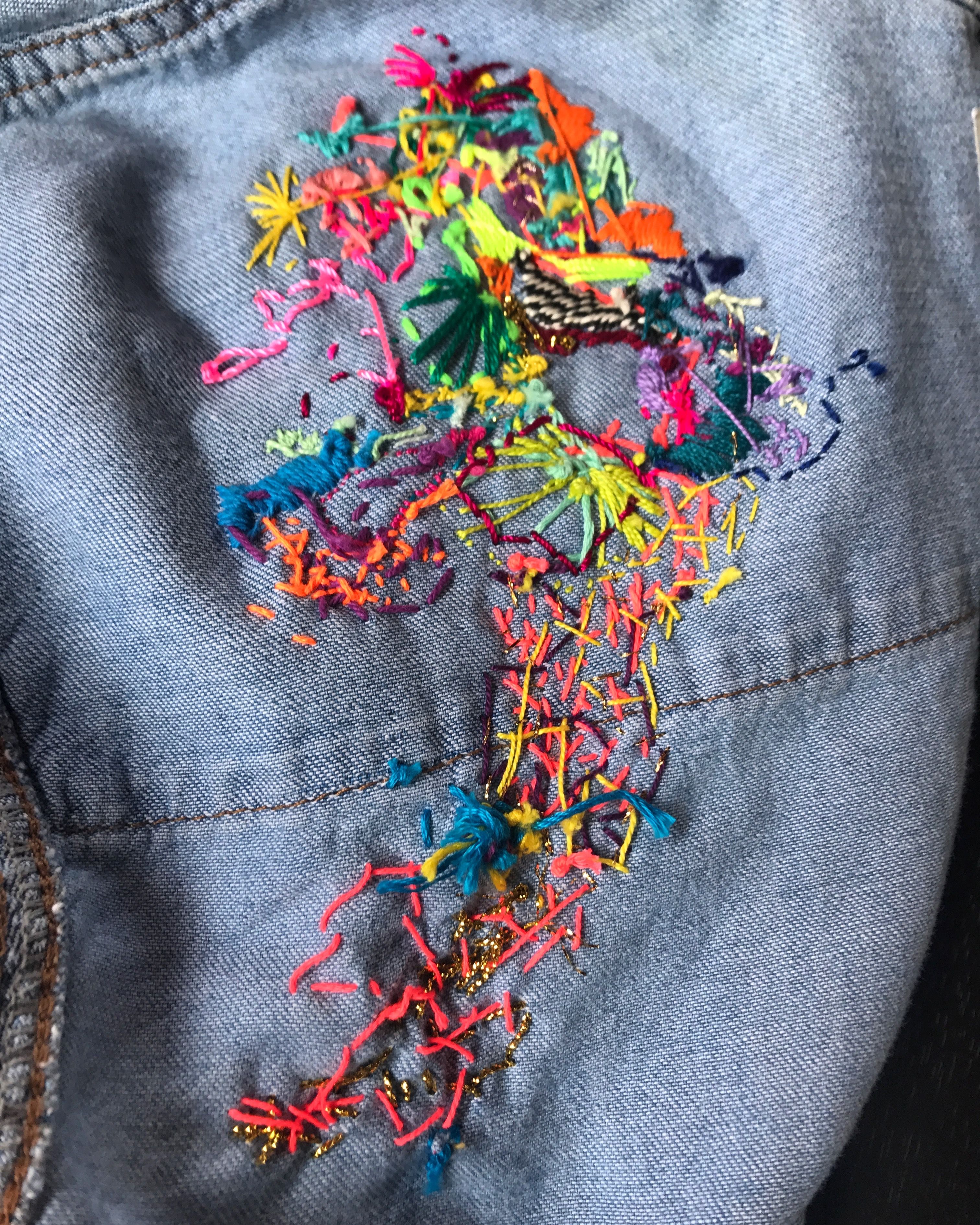 Blusa Denim con intervención de bordado en hombro y espalda.