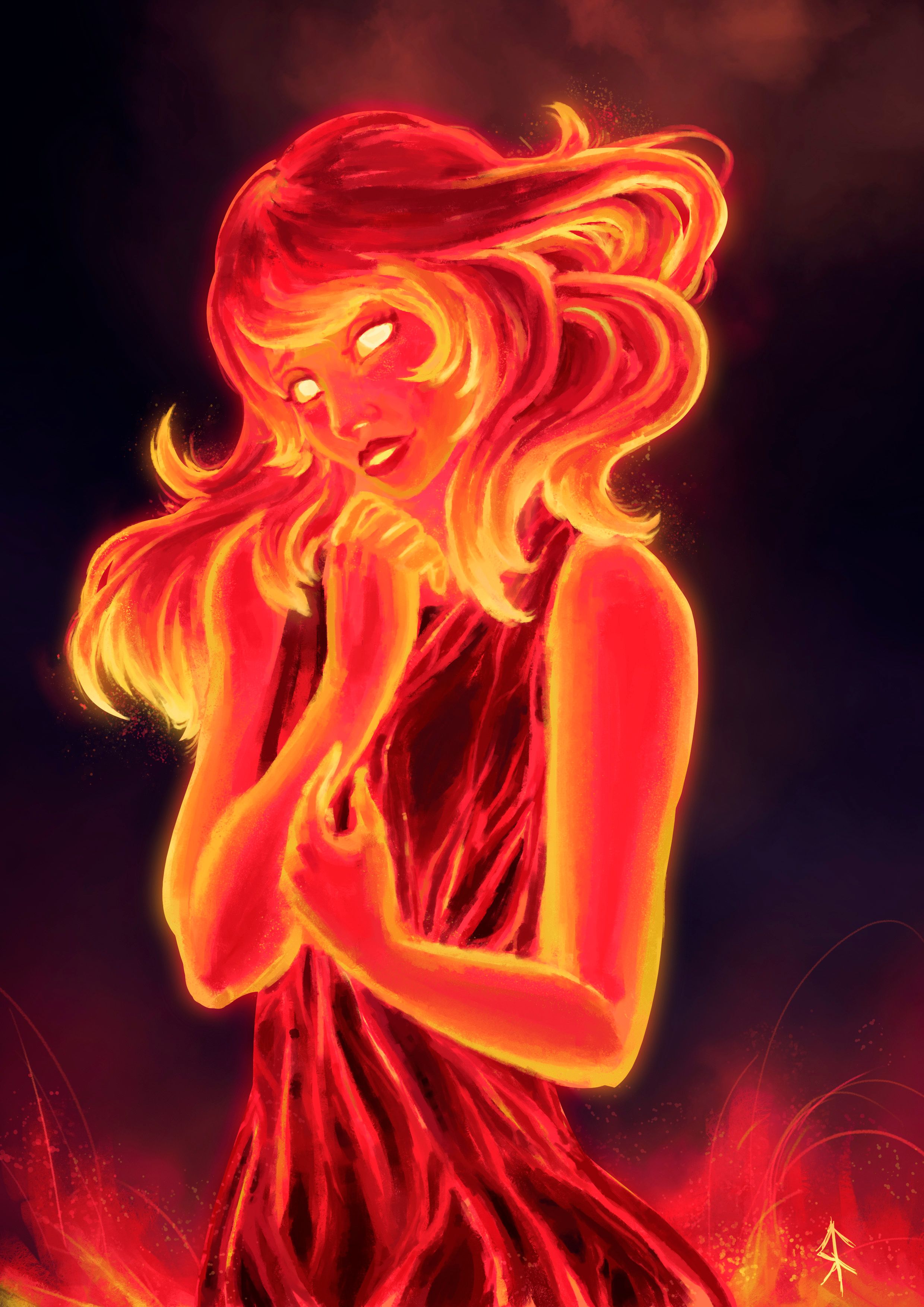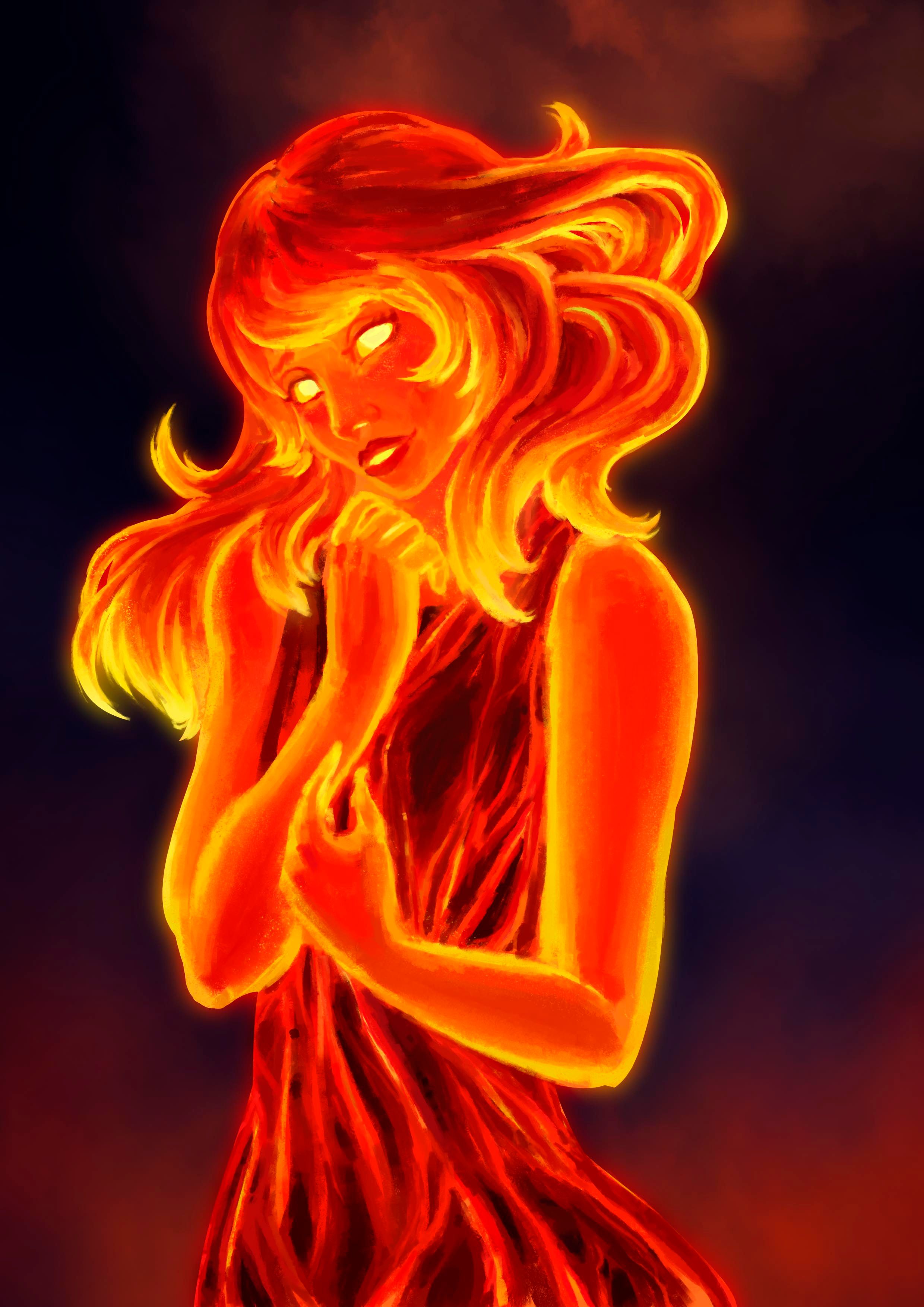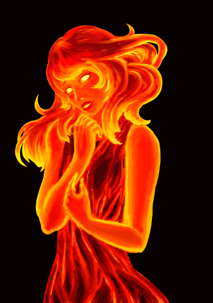 Esta parte fue muy divertida pues tube que basarme en varias referencias de lava volcanica para poder entender los diferentes valores tonales de este material. Así mismo, use diferentes tipos o fases de la lava para las diferentes partes de la chica. Lava fluida para el pelo, un material más solido e invandecente para el cuerpo y rostro; y un material más solido y oscuro para su vestido.