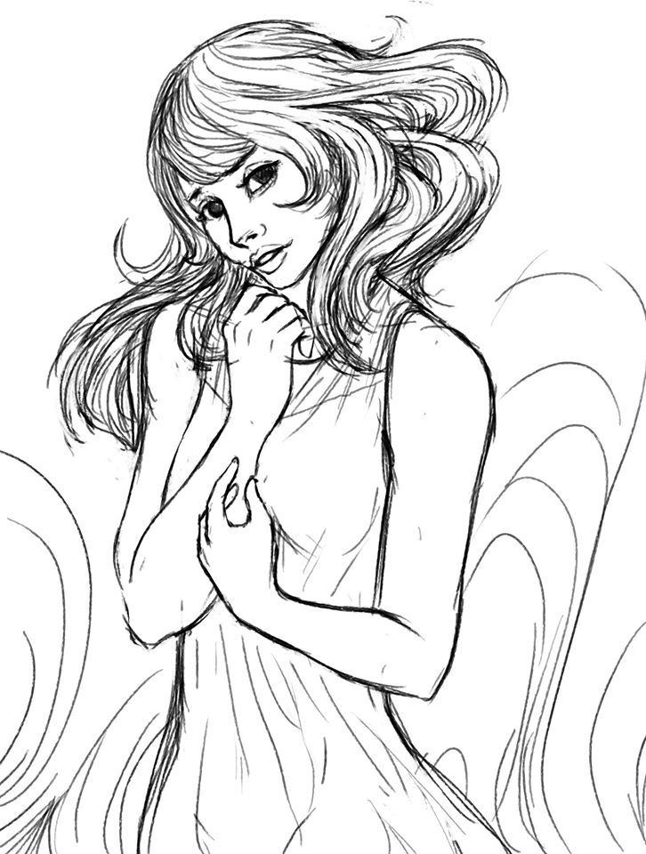Este sketch más avanzado sirvio para concretar de talles como el restro, el vestuario y la linea de flujo en la ilustración.
