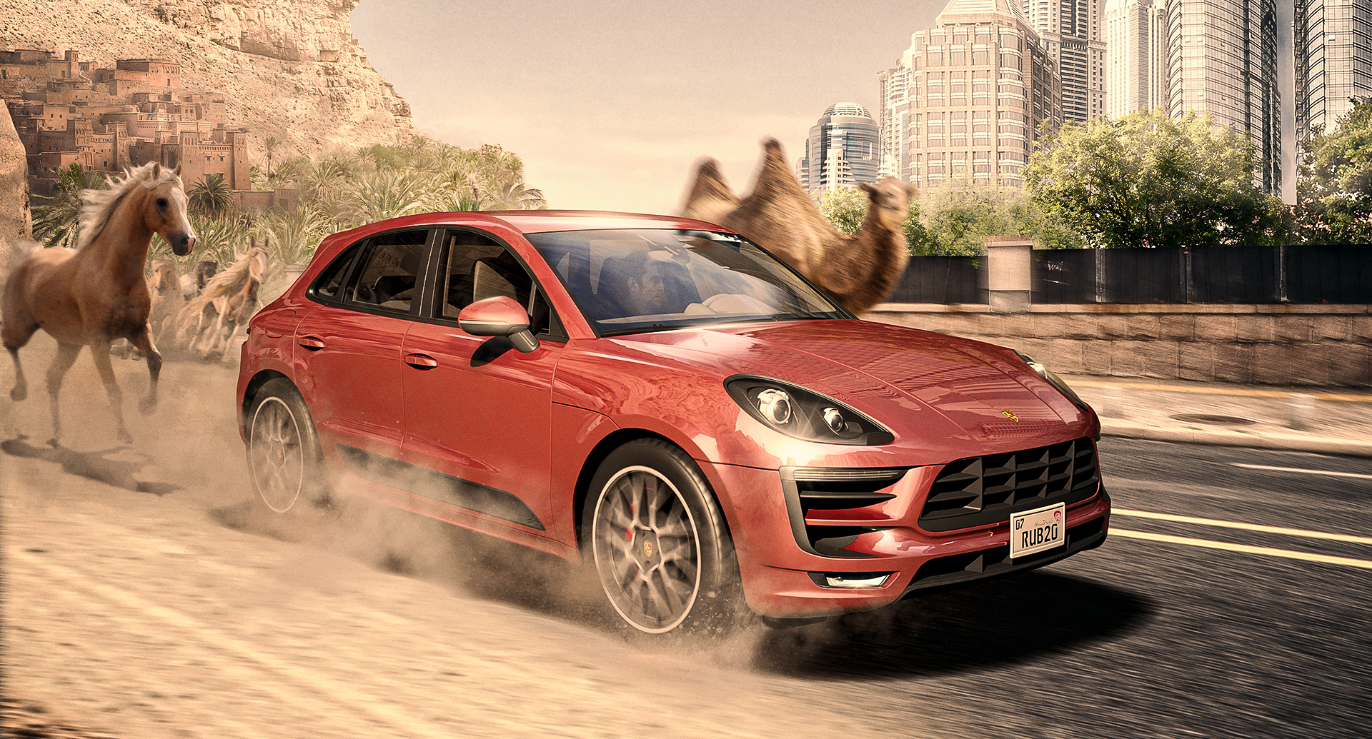 Merci beaucoup d'avoir partagé votre projet. Je pense que les flous sont mal relevés. Cela n'a pas de sens que le chameau soit flou et que l'arrière-plan avec les bâtiments ne le soit pas. La composition entière est chaude, mais le pare-brise est froid et sursaturé. À votre santé!