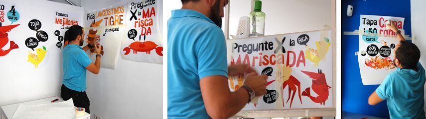 Nos contrataron para cambiar la imagen de una abacería del Arenal de Sevilla y transformarla en marisquería. Creamos una mascota como símbolo para la marca. Como estaba muy solito diseñamos toda una pandilla de mariscos, moluscos y crustáceos.
