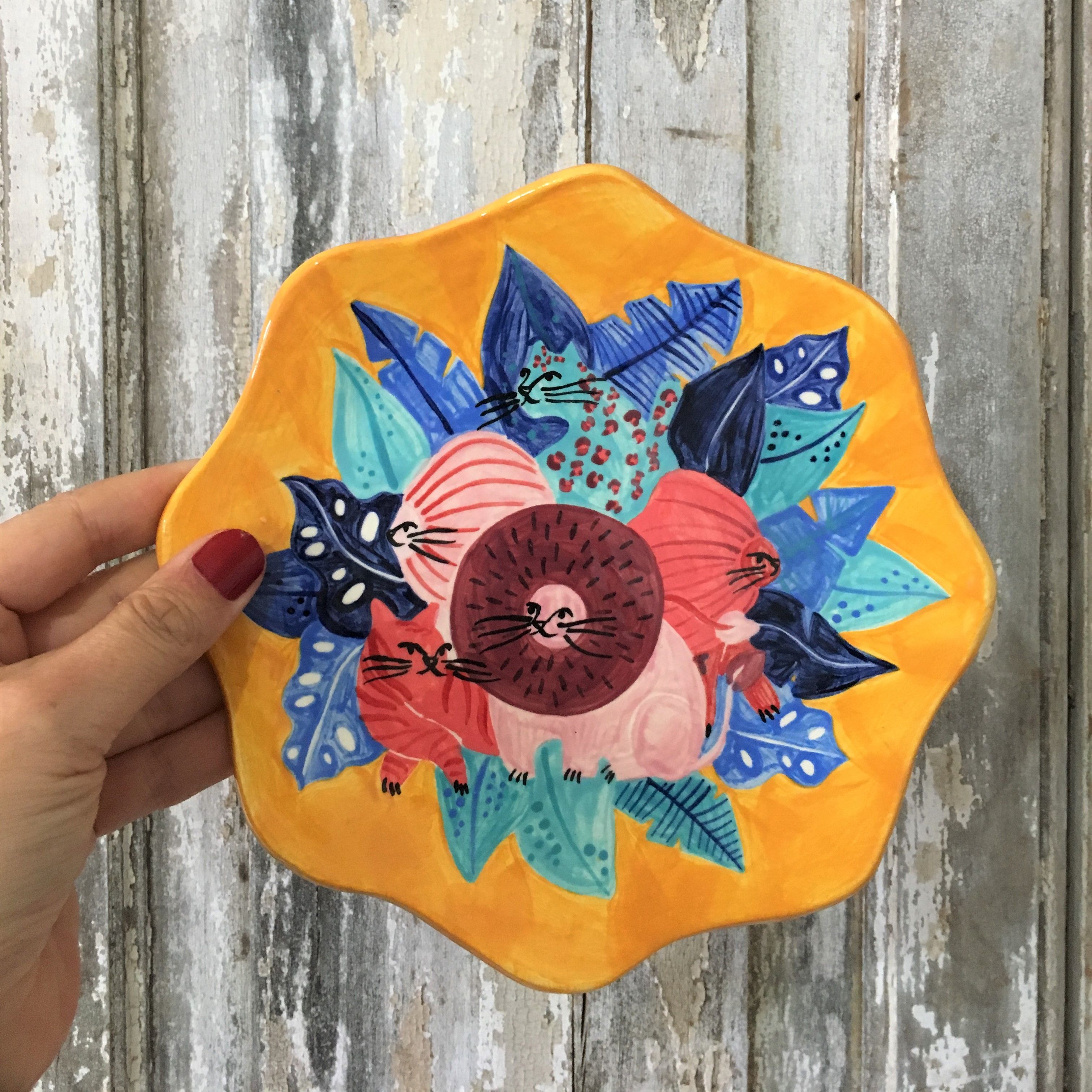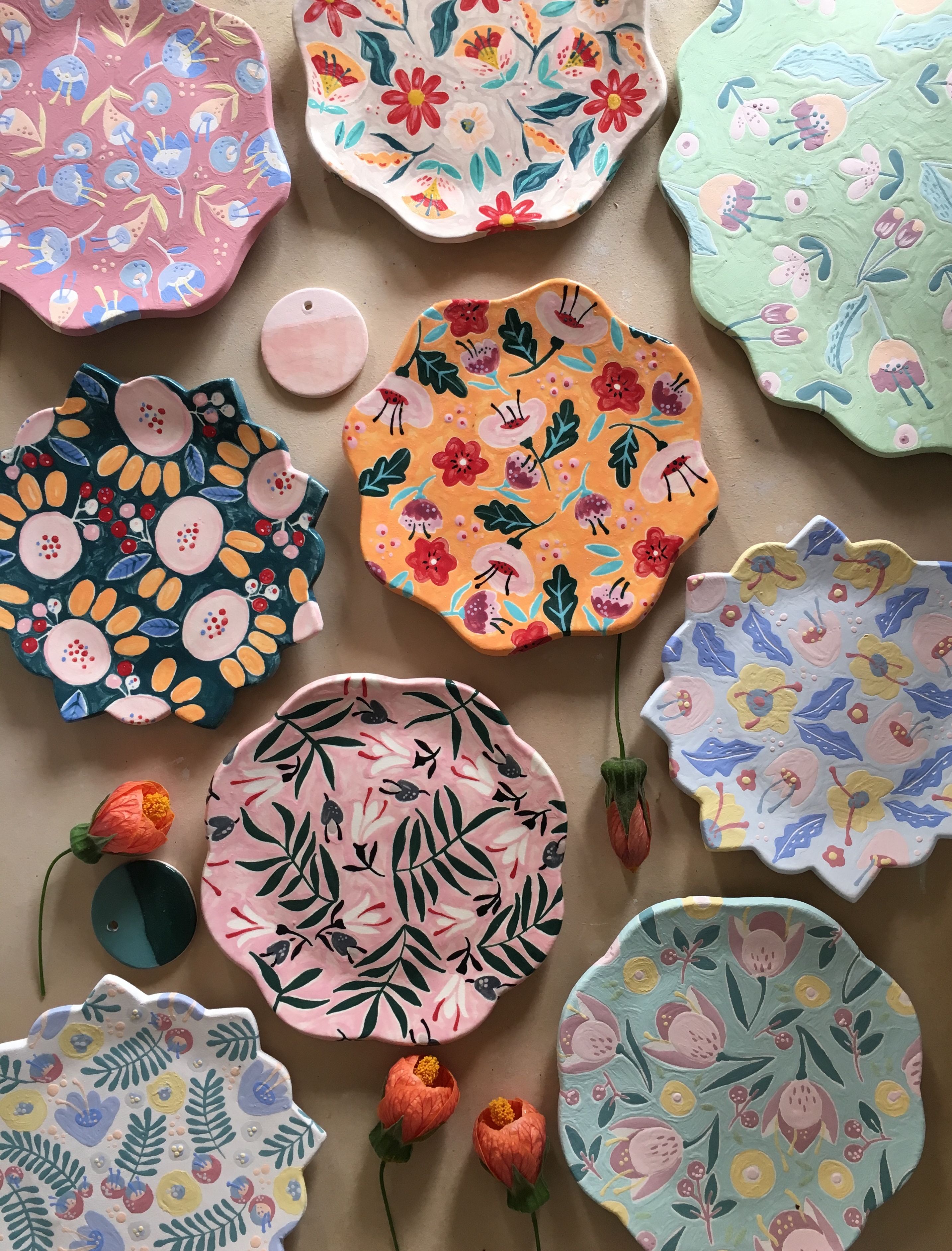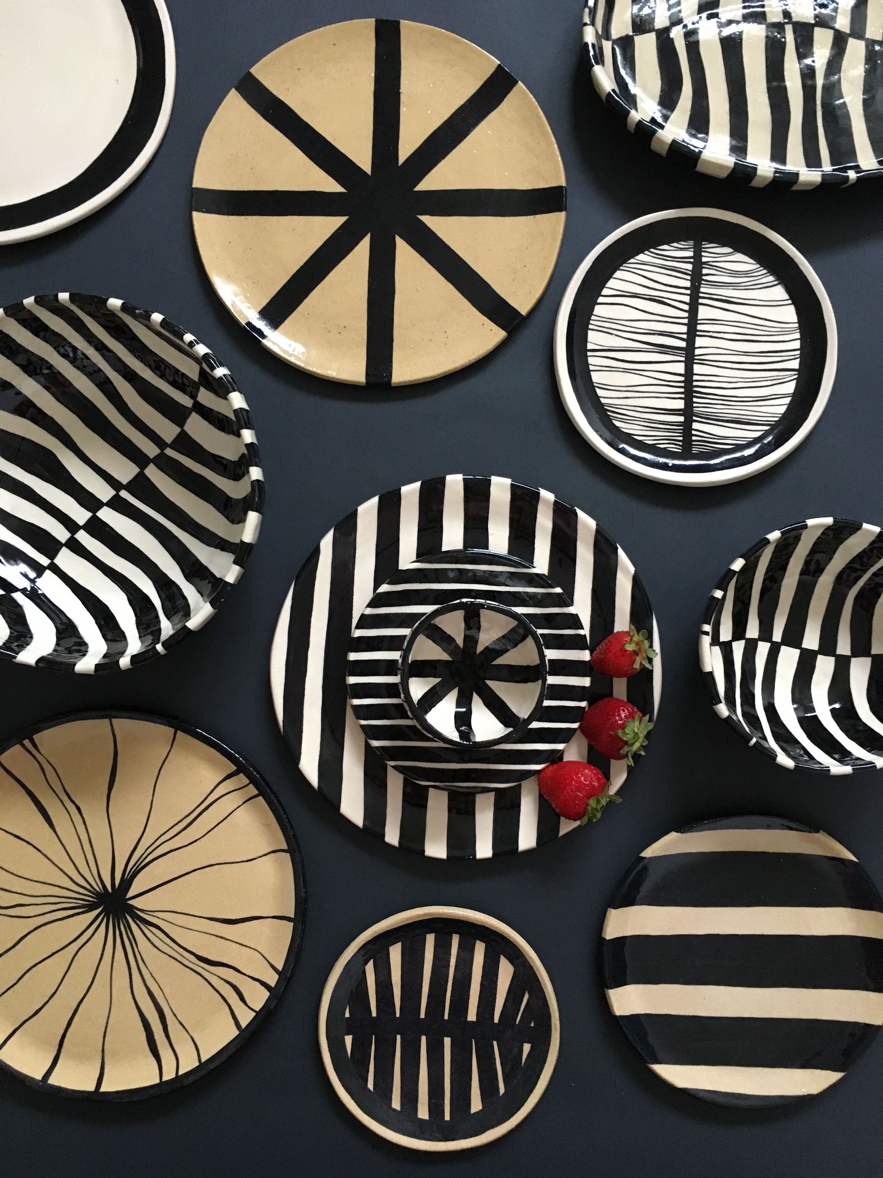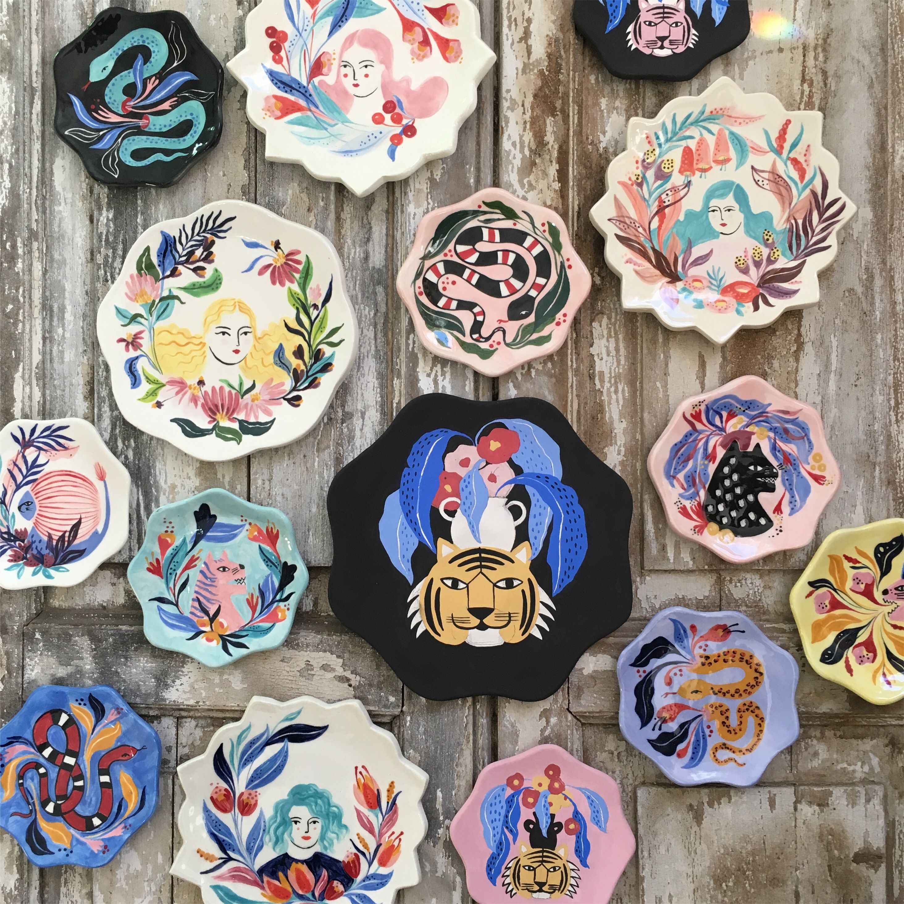 Platos de diferentes tamaño y formas, modelados a mano con la técnica de placas (slab technique) e ilustrados con diferentes técnicas. Principalmente engobes y pigmentos bajo cubierta (underglazes)