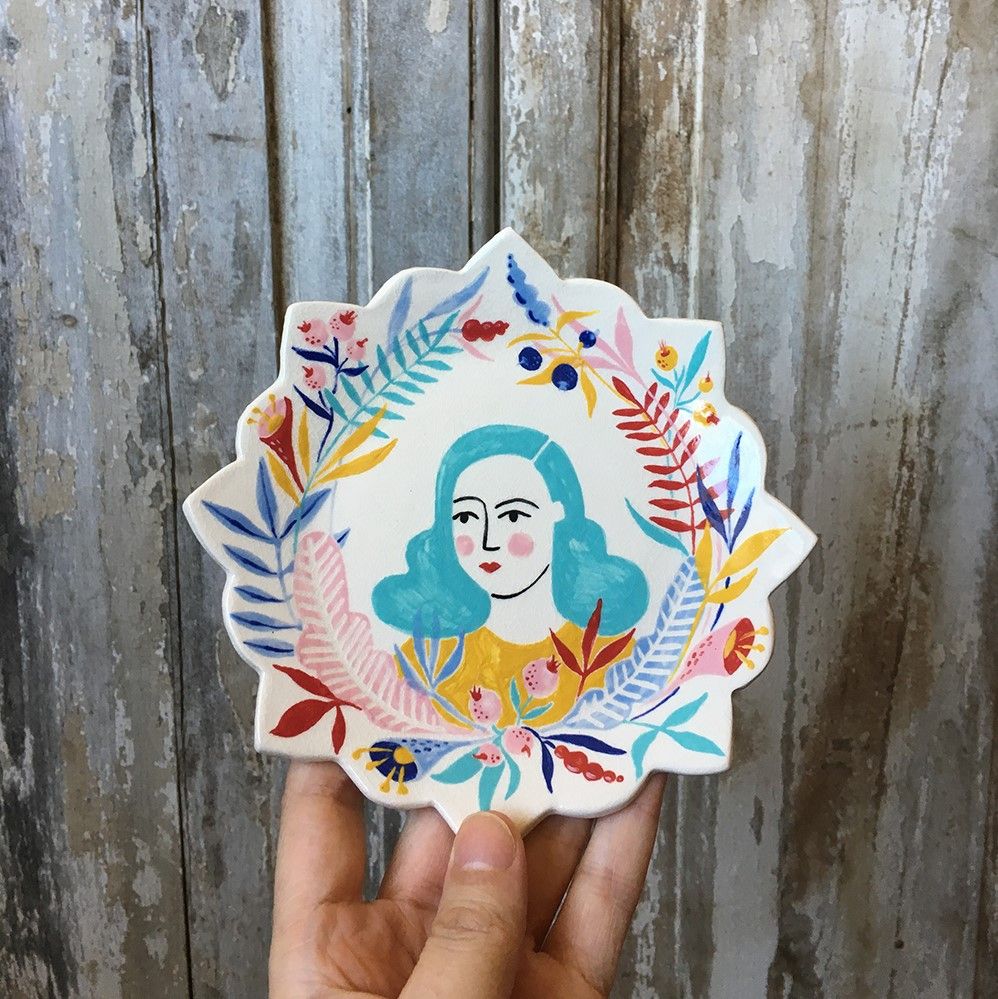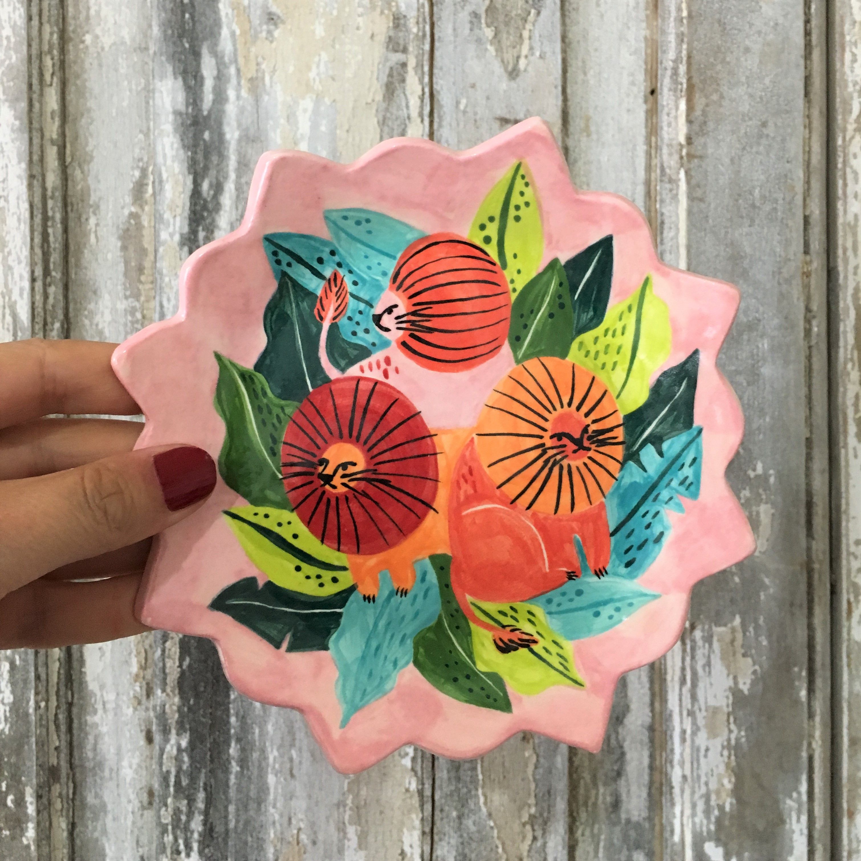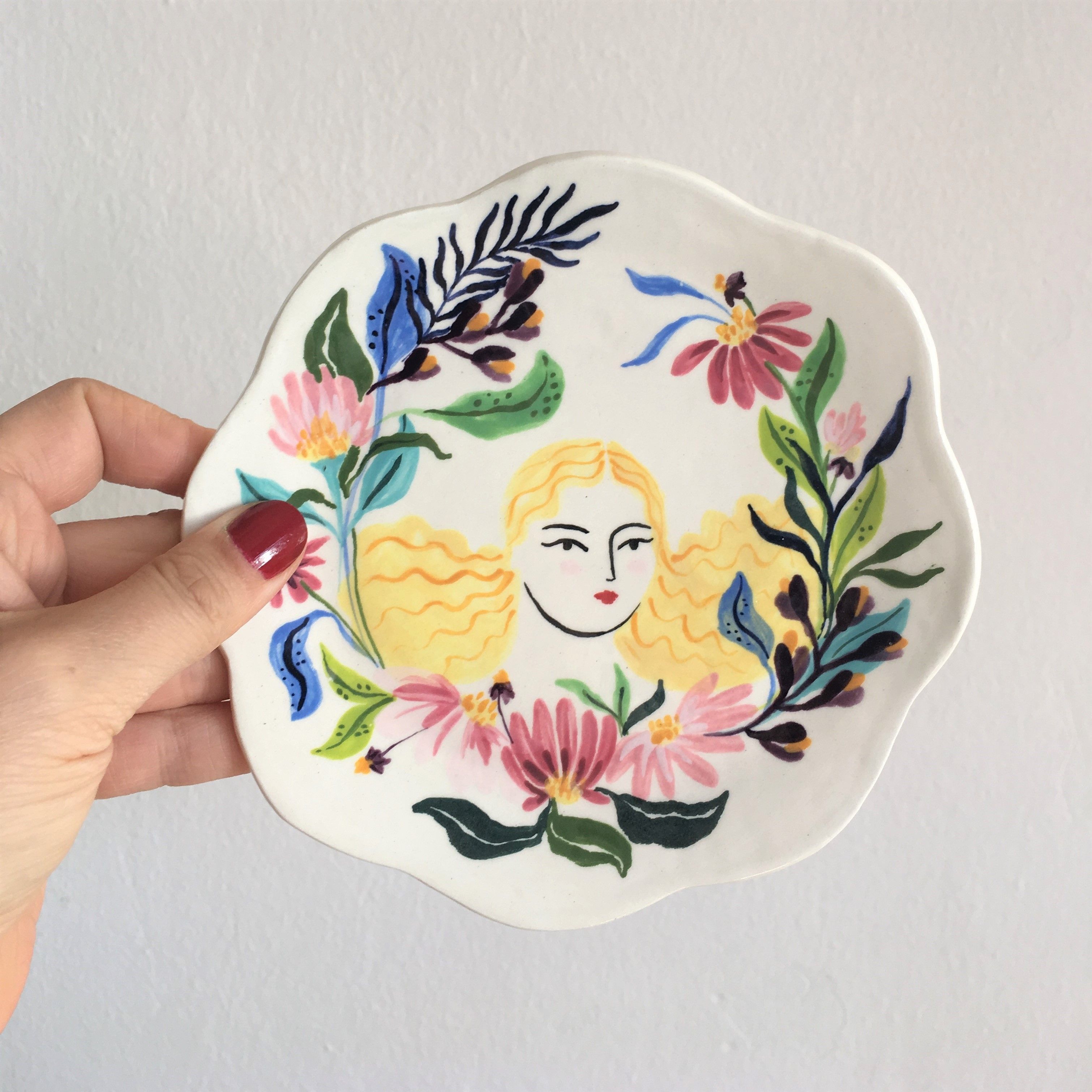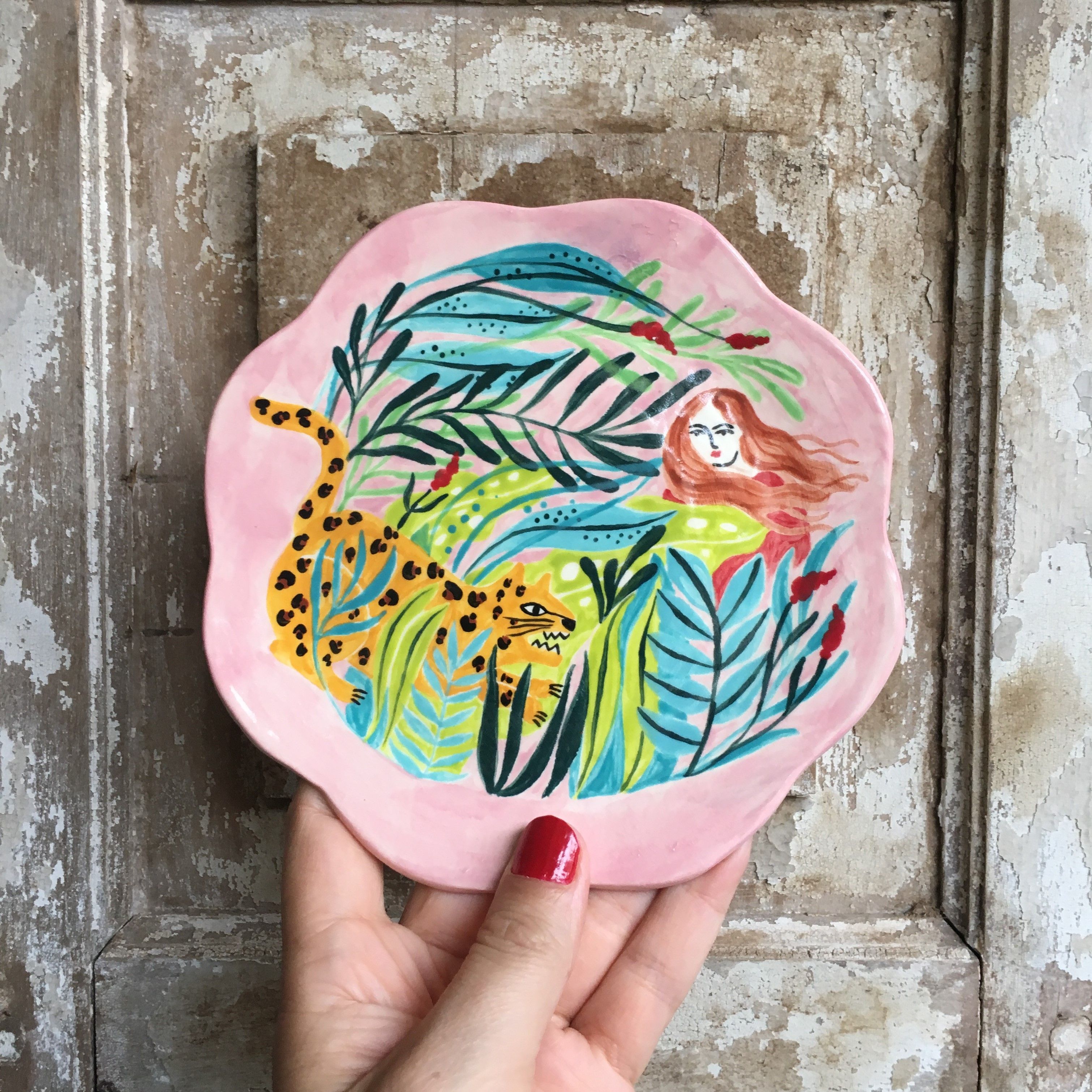 Platos de diferentes tamaño y formas, modelados a mano con la técnica de placas (slab technique) e ilustrados con diferentes técnicas. Principalmente engobes y pigmentos bajo cubierta (underglazes)