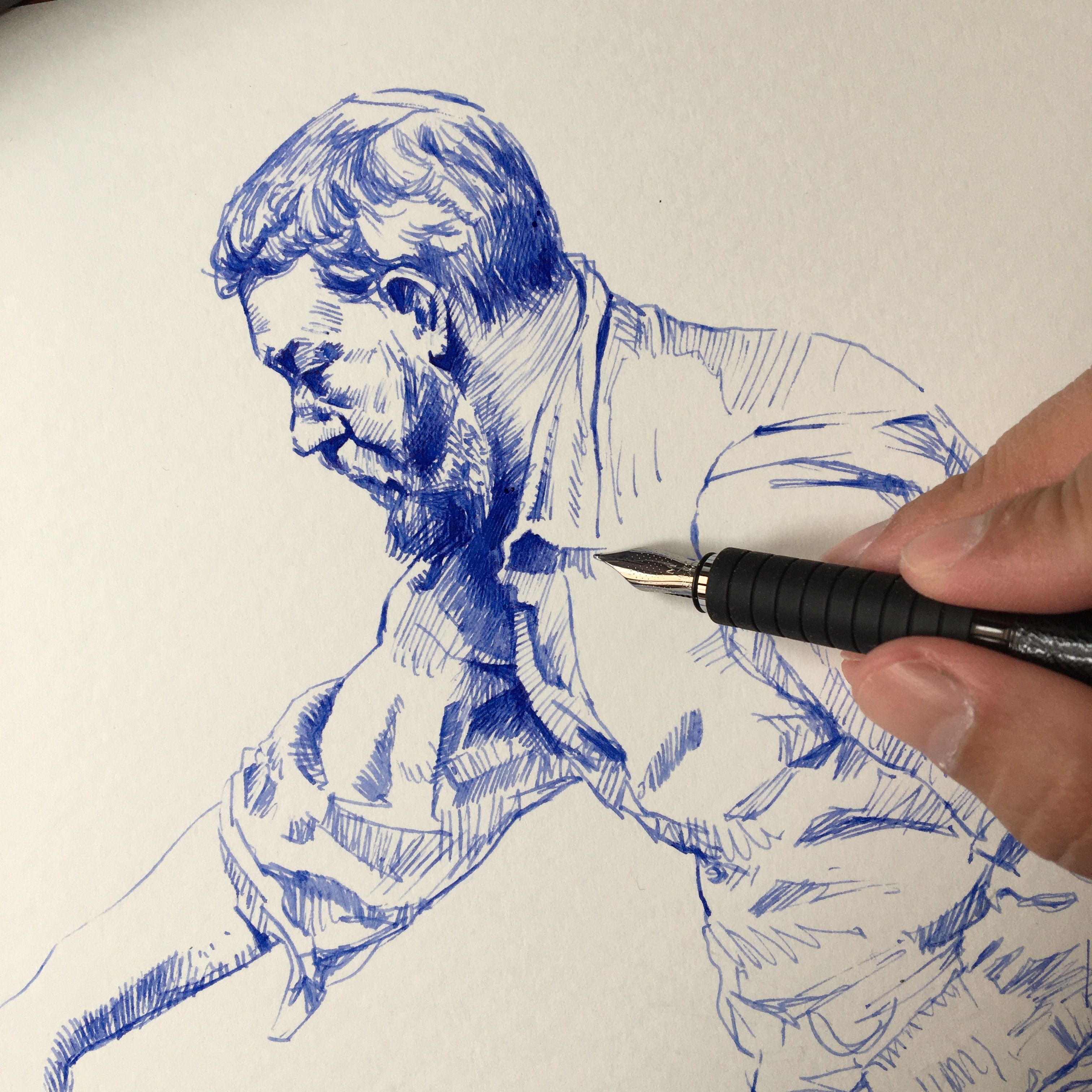 Dibujo realizado con tinta azul y pluma fuente sobre papel para acuarela de 220g/m2 El retratado es el excelentísimo pintor español Joaquín Sorolla (1863-1923)