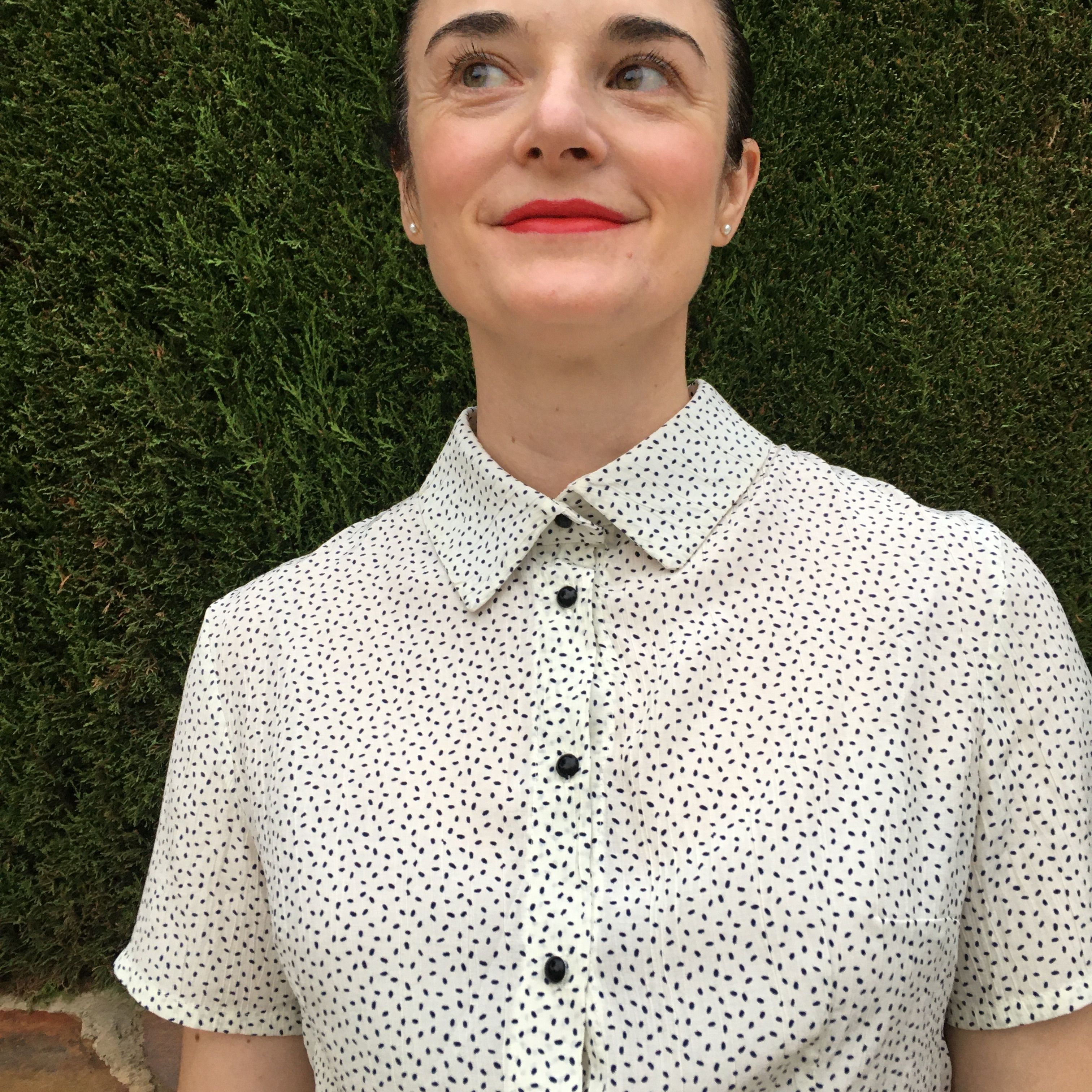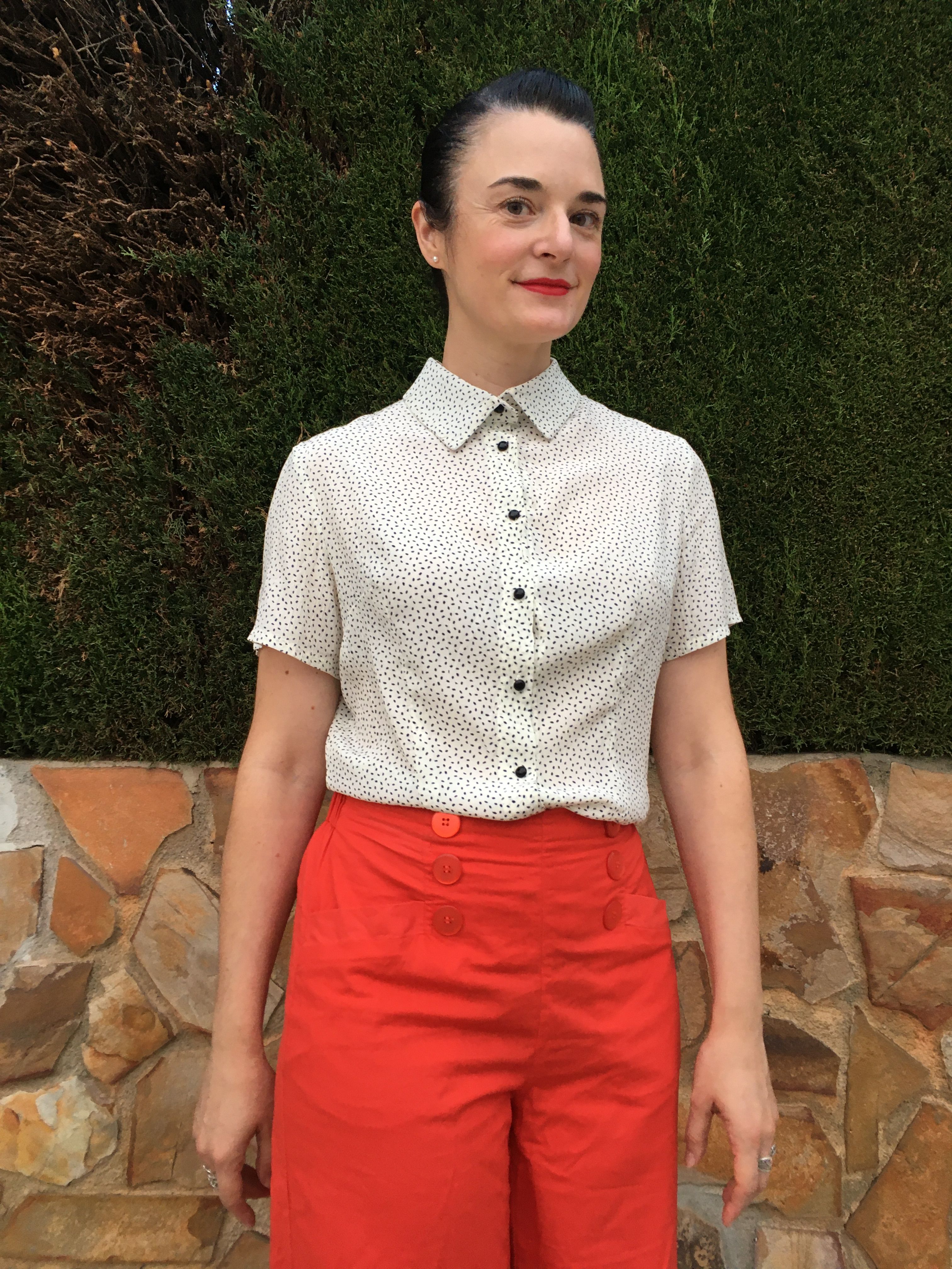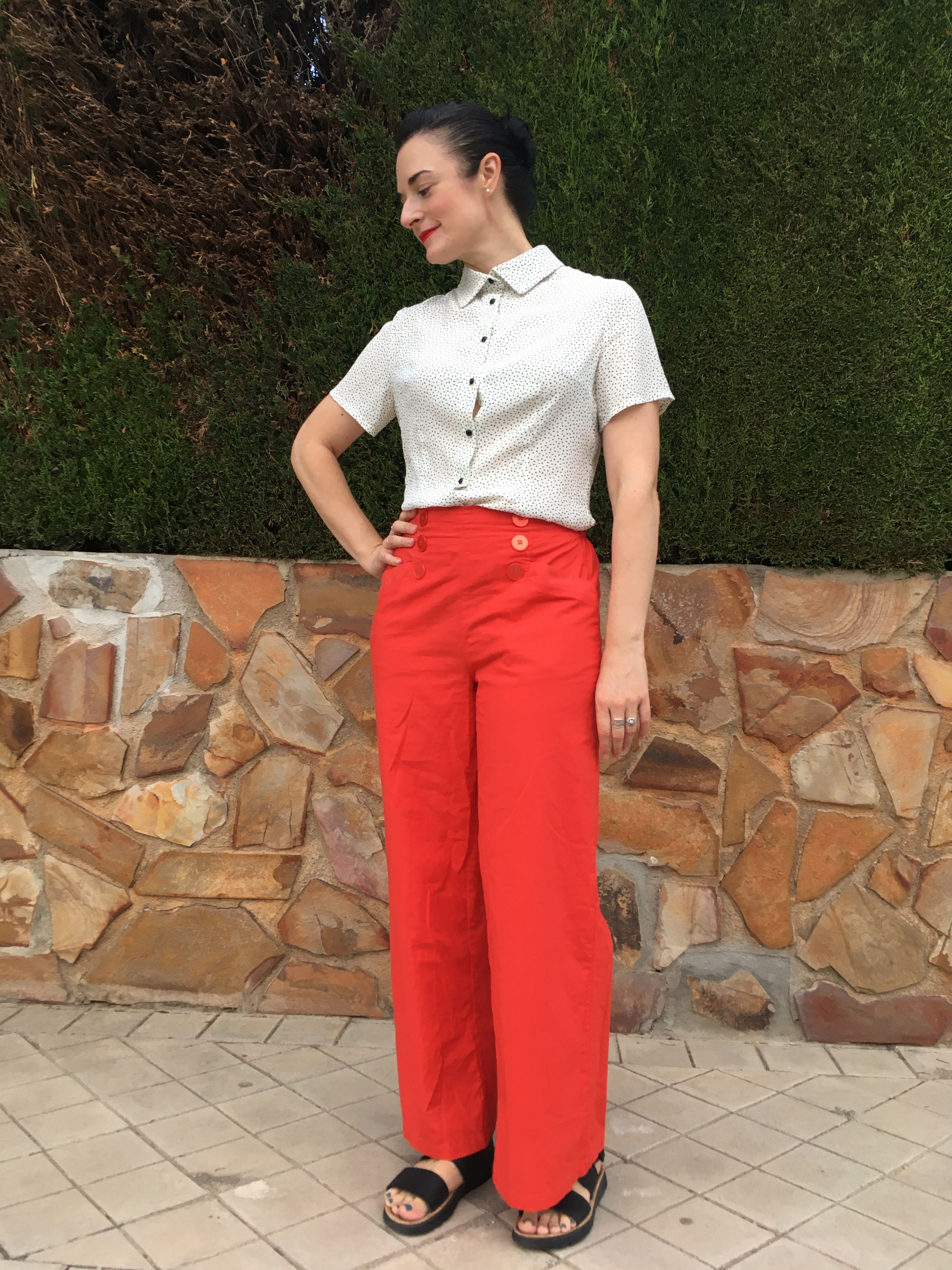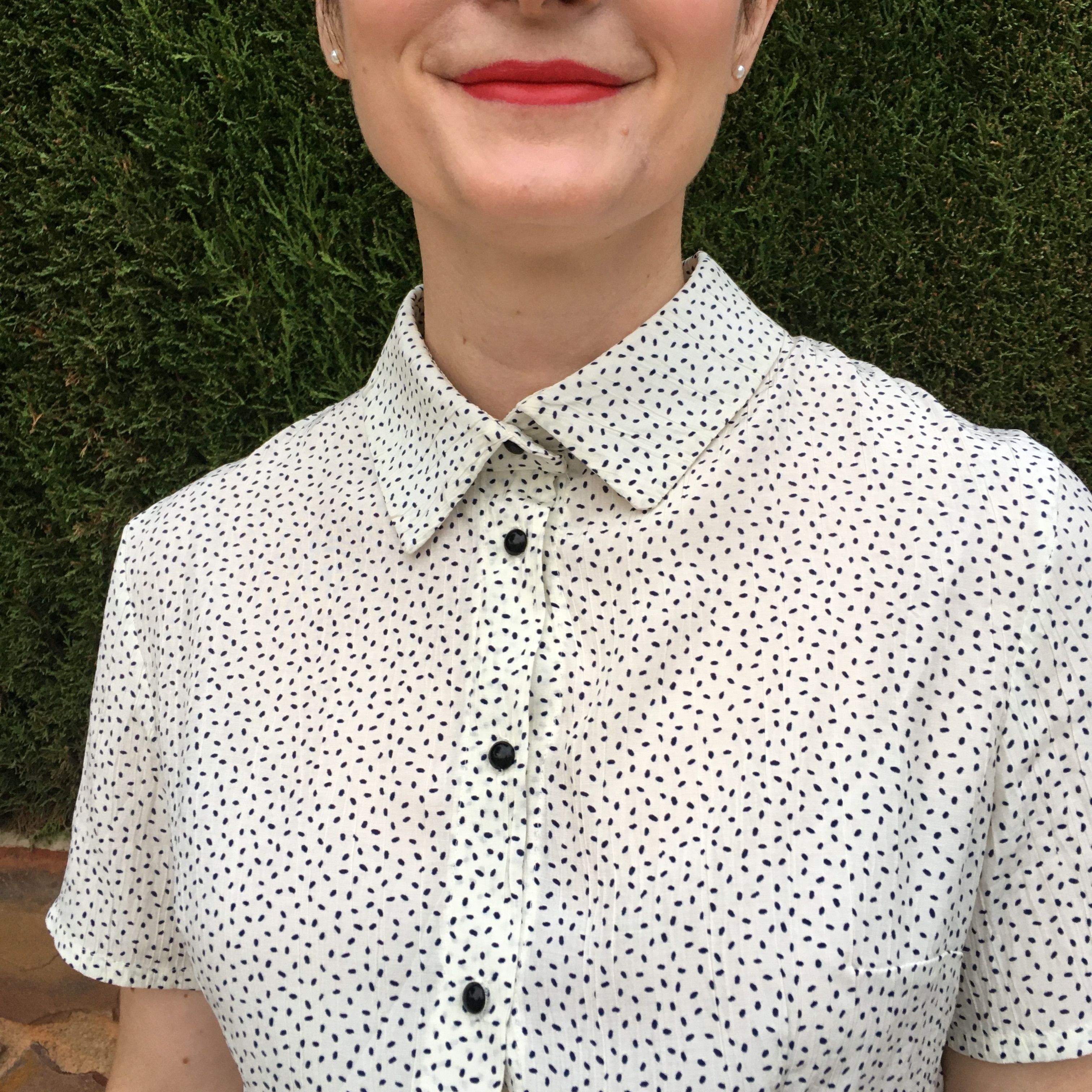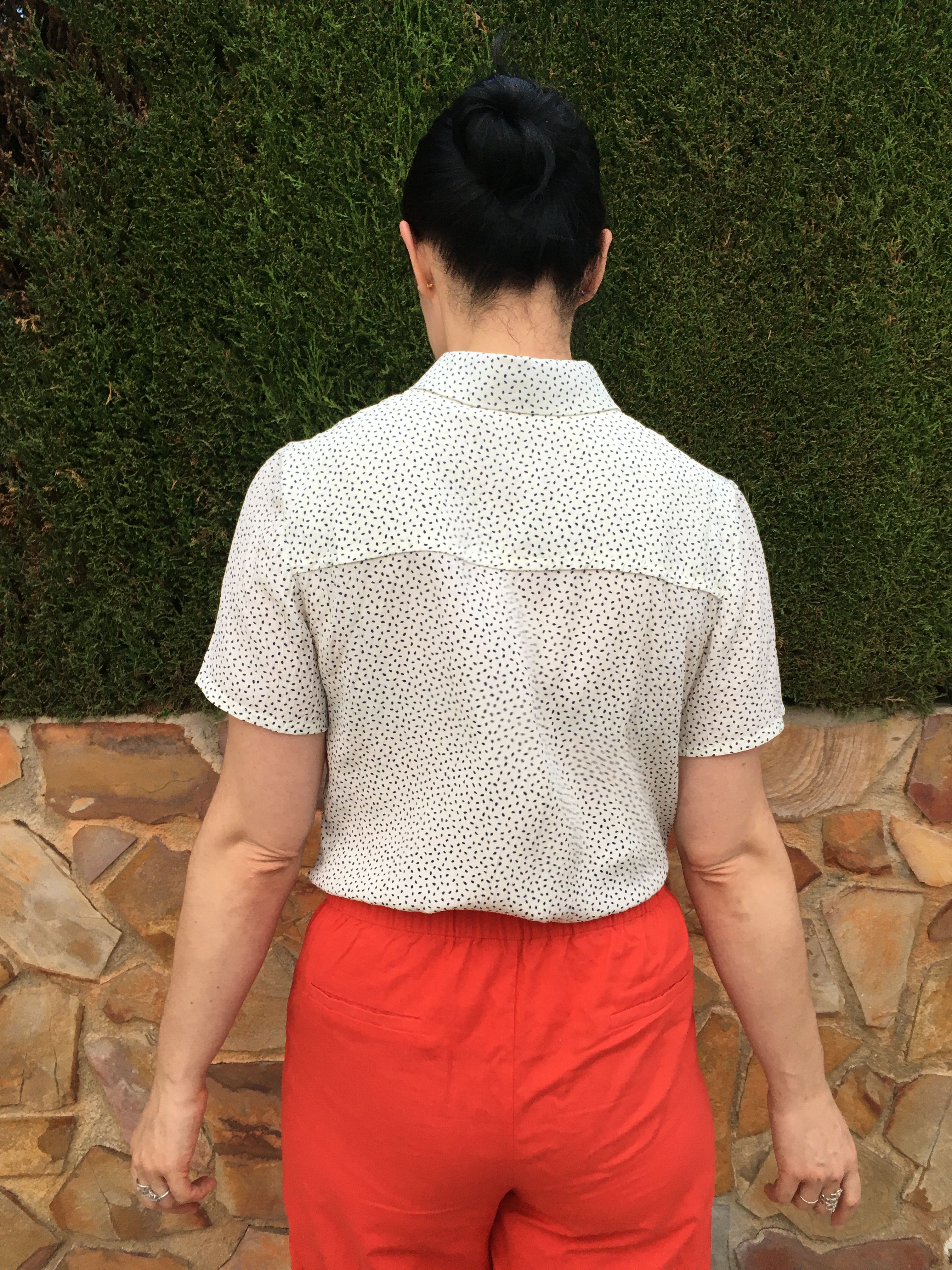 ¡Mi primera camisa! Estoy que no me lo puedo creer todavía... Me tomé mi tiempo para hacerla. Hice primero un prototipo con retor para intentar cometer los fallos antes de pasarme a la verdadera tela. Lo hice también para ver si la talla M era la adecuada, ya que con mis medidas oscilaba entre la M y la L. Ví que podía hacer la talla M, incluso entallada y con pinzas. Elegí una tela viscosa (que no recomiendo para principiantes) porque es complicada de cortar y manipular. Algo que me ayudó mucho fue hilvanar para coserla. Los alfileres me dificultaban coser la viscosa (con el retor, ya que es una tela más tiesa y tiene menos caída) e hilvanar lo simplificó todo y me permitió no tener que descoser! Necesité una semana entera para terminarla. ¡Ahora, tengo muchas ganas de hacer una camisa con mangas largas y lo haré!