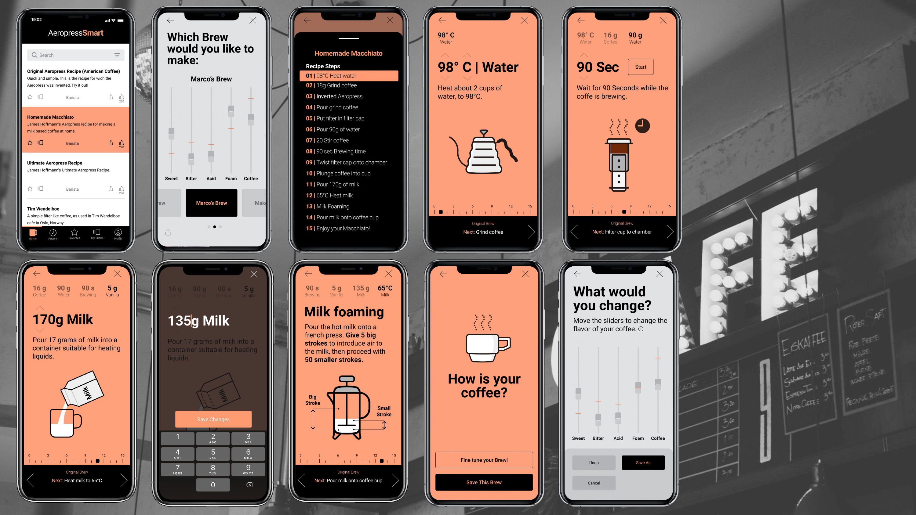 A recipe app with integrated timers and parameters that users can modify at the beginning of the brewing process, in real-time, or after they just had the first sip of their coffee. Users have no need to keep track of their modifications on a separate post-it note. Their input is retro feedback to the recipe's parameters, so they are saved and ready for the next brew.