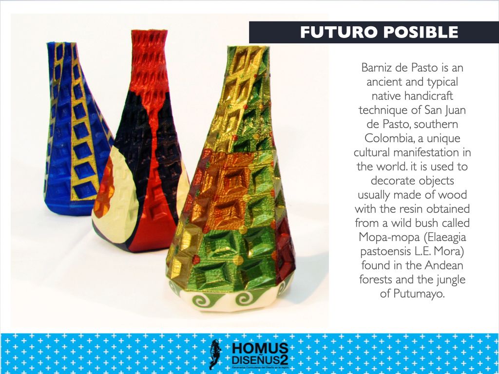 Latihan ini dikembangkan menggunakan desain spekulatif sebagai dasar proyek, untuk membayangkan kemungkinan masa depan bagi wilayah saya dan produk kerajinannya yang dikembangkan dalam perdagangan "Pasto Varnish".