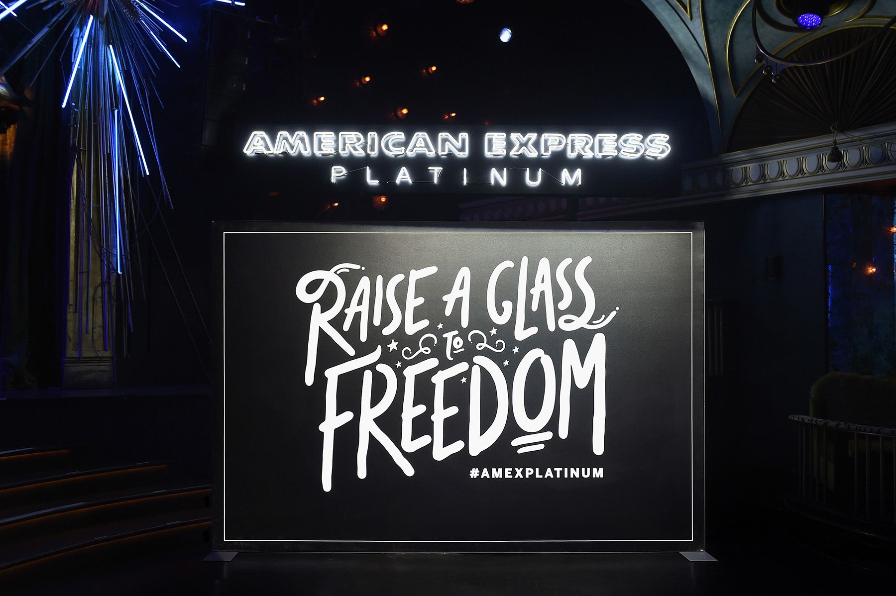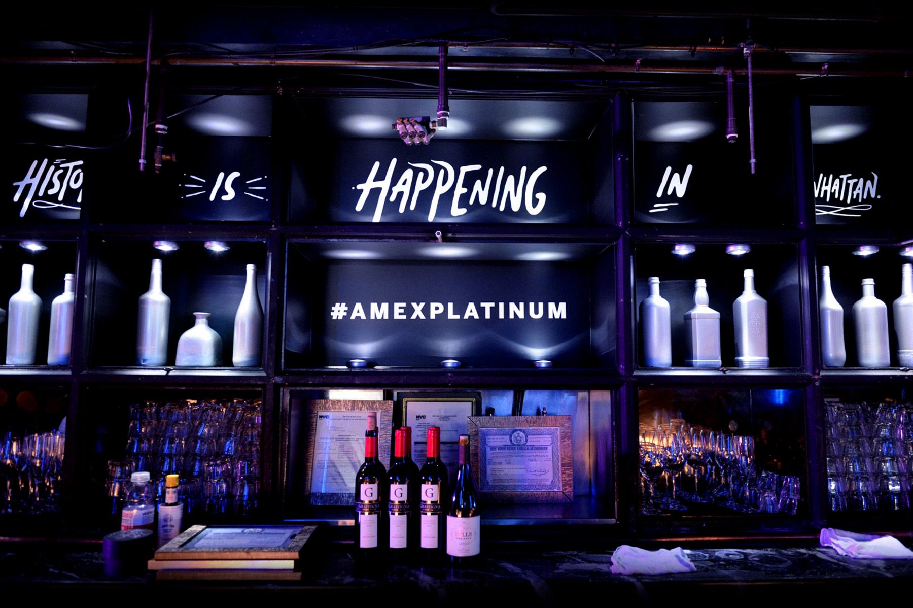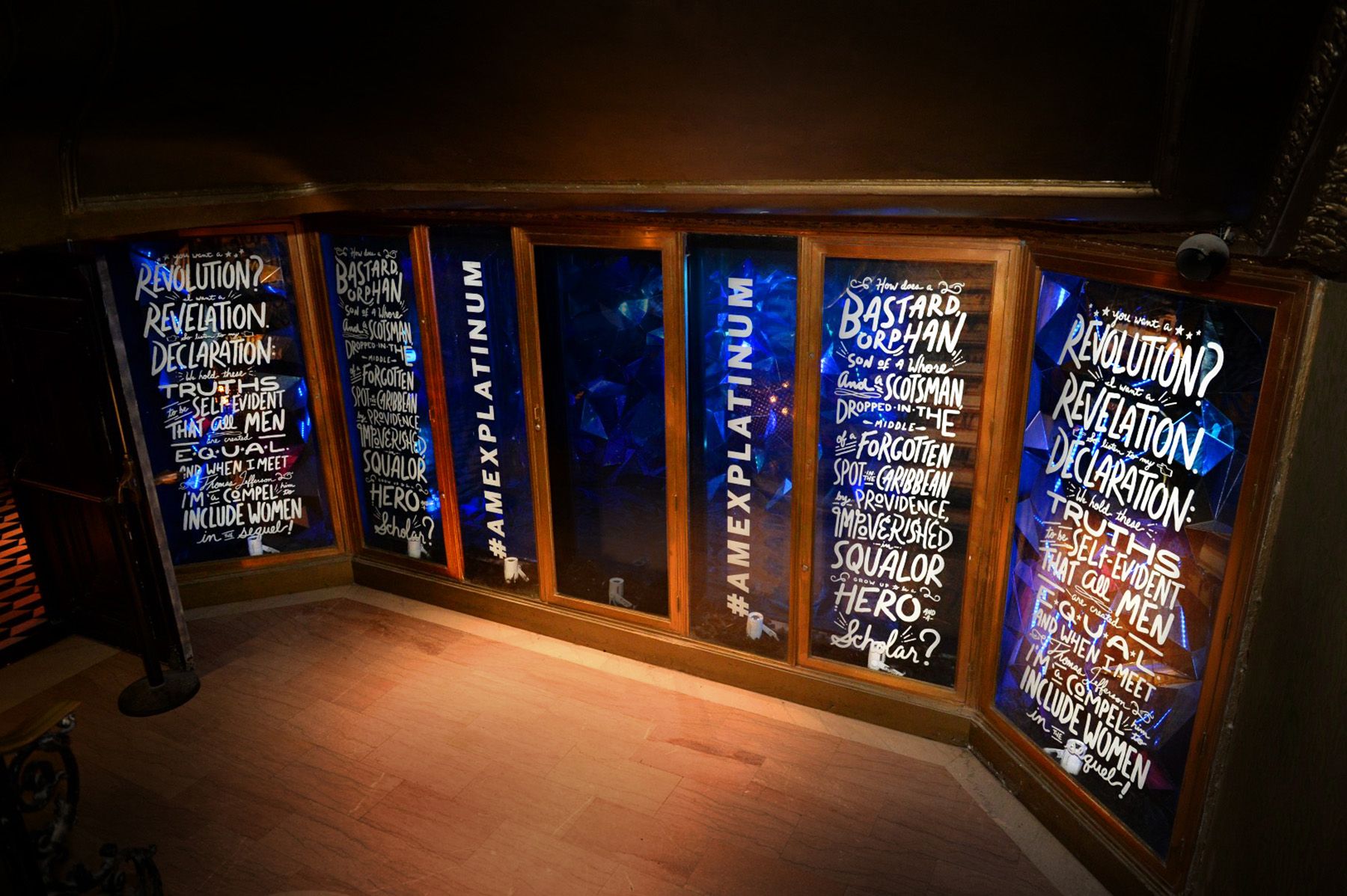 American Express threw a series of parties to celebrate their launch of the Platinum card and they teamed up with Hamilton the musical to create a unique event experience at The Diamond Horseshoe at the Paramount Hotel across from the Richard Rodgers Theatre. The Diamond Horseshoe is a massive and beautiful space and I was tasked with creating custom lettering utilizing the lyrics of Hamilton. Assets included vinyl wrapping on glass, projected lyrics, large-scale photo-op, and bar dressing/assets.