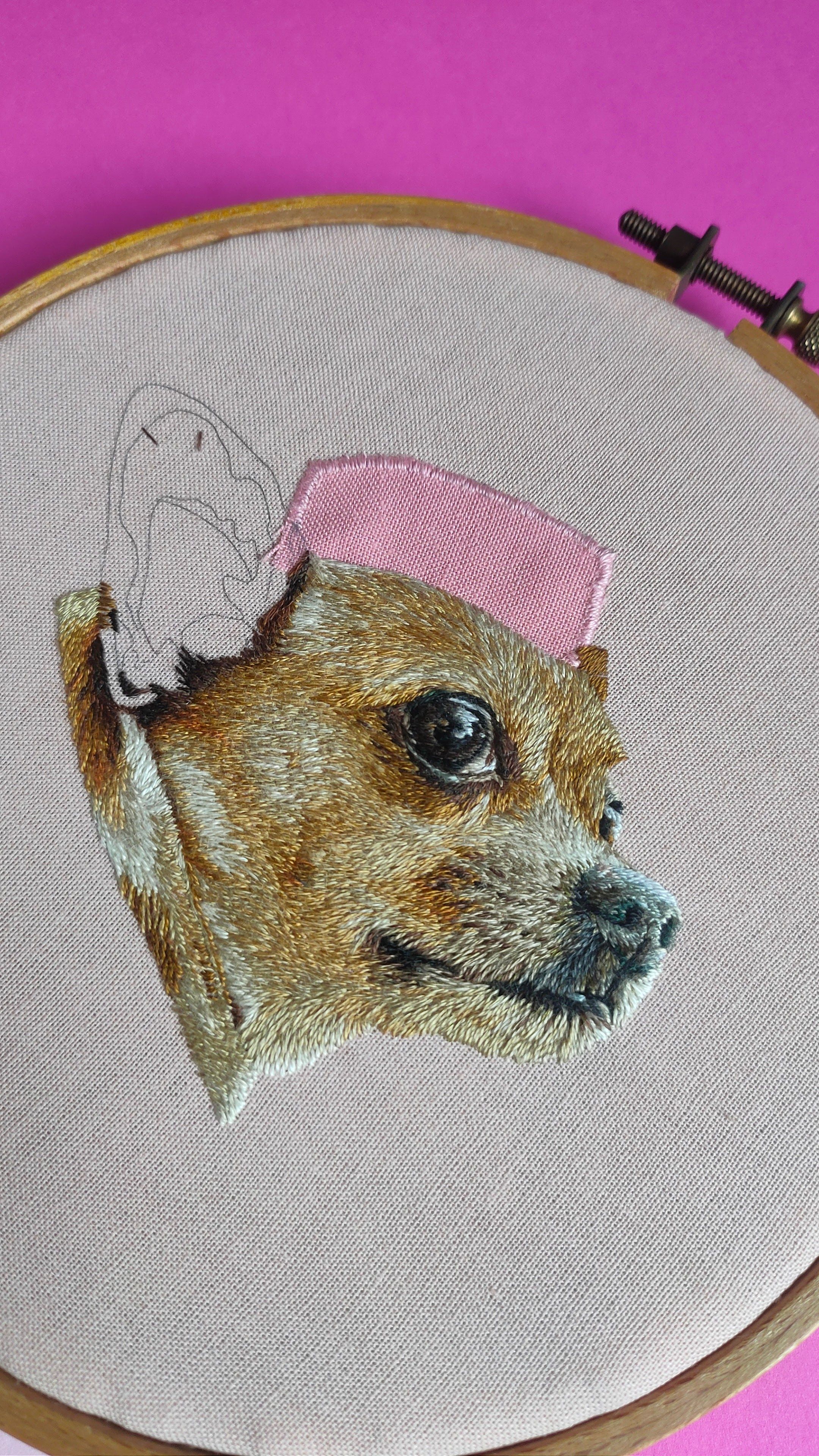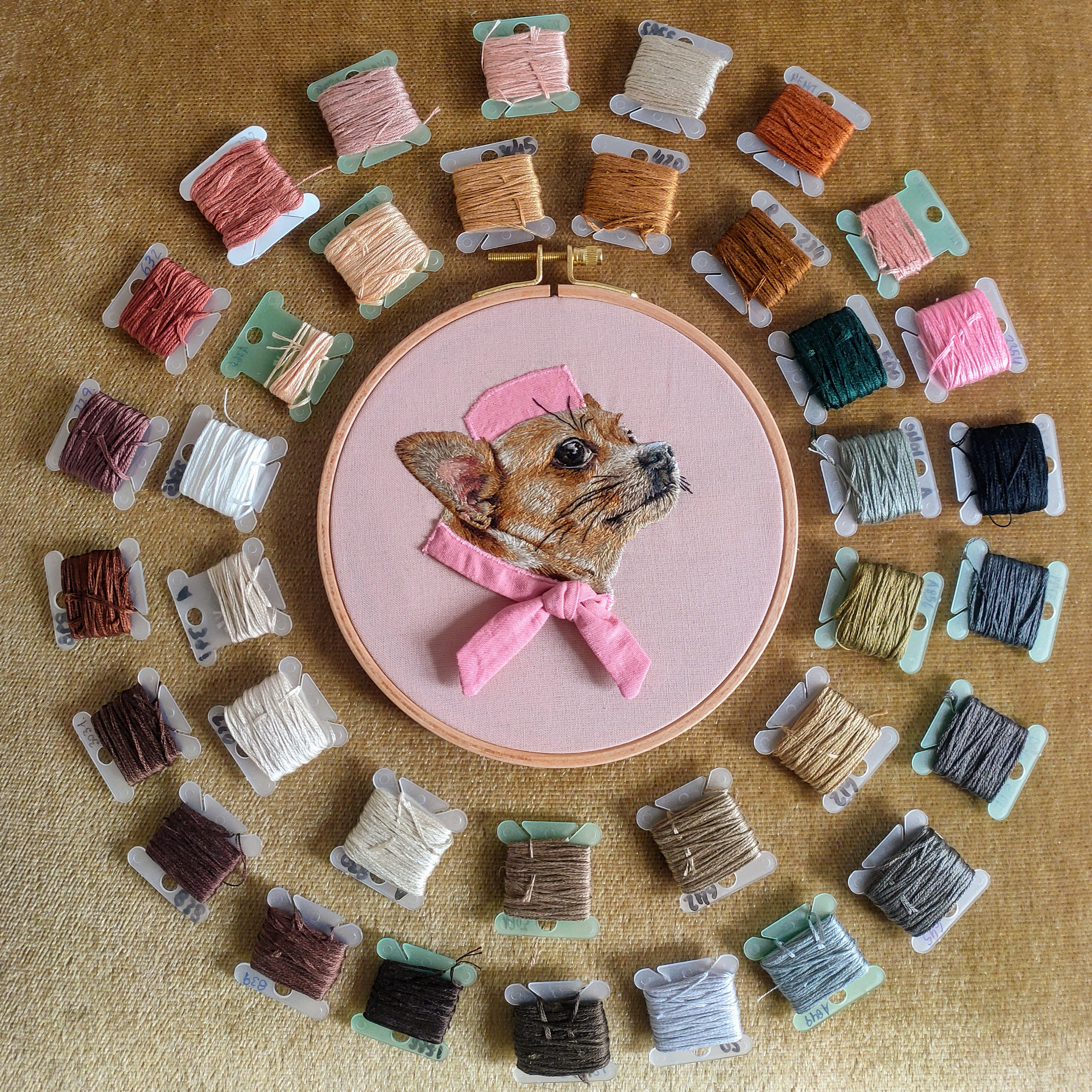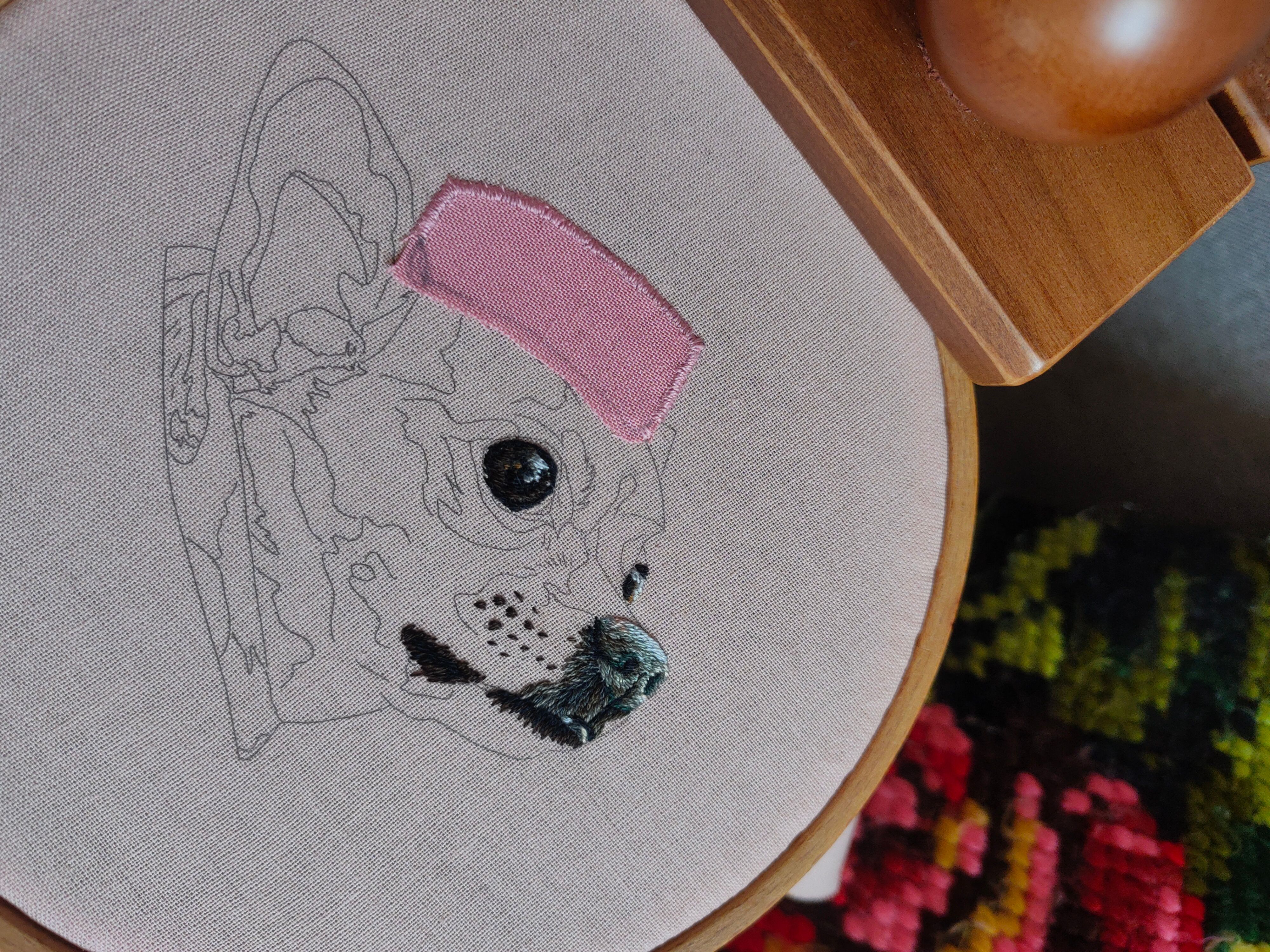 The complete piece is made with cotton threads (DMC & Anchor) on cotton fabric (Bella Solids by Moda Fabrics) with appliqués of the same type of fabric.