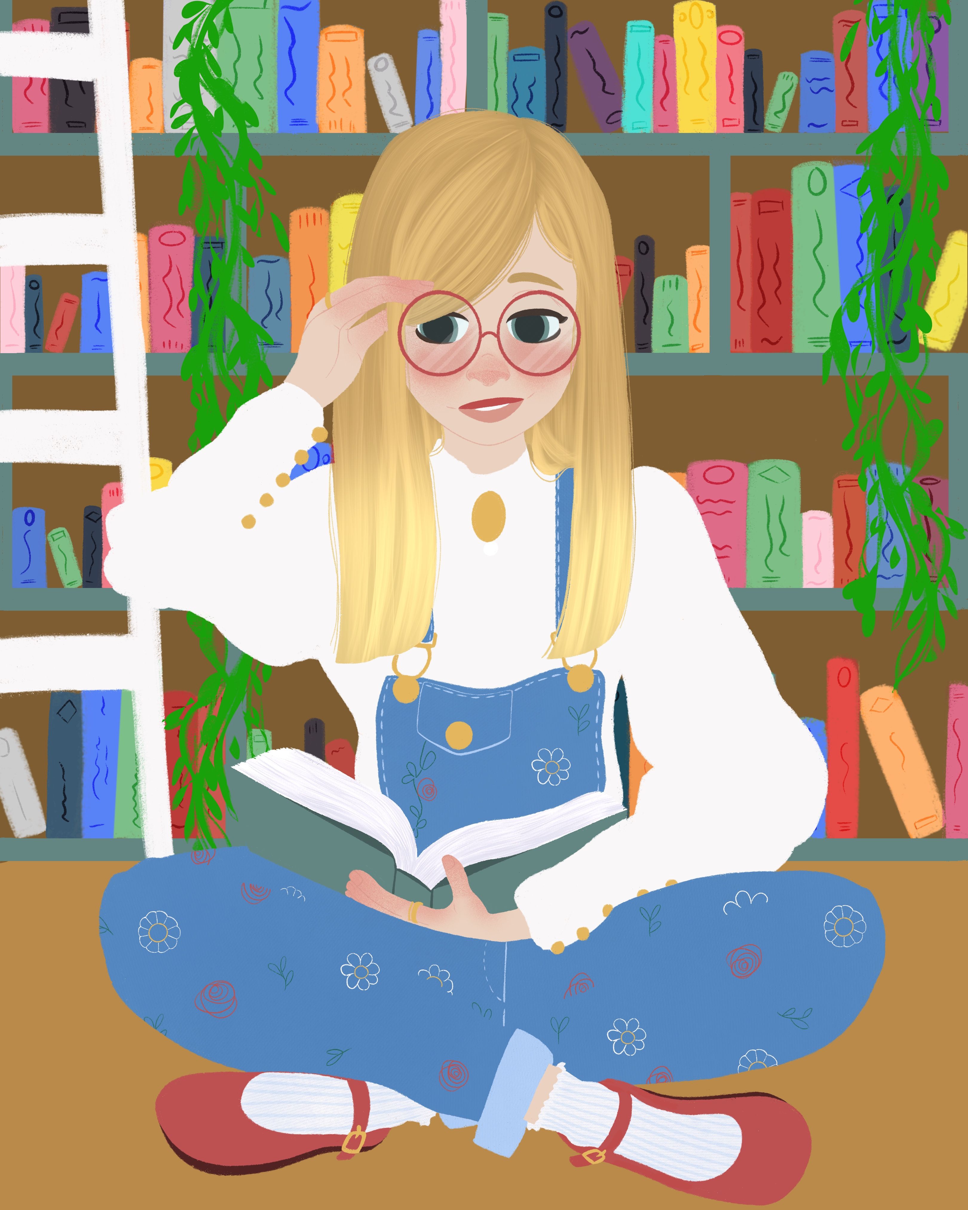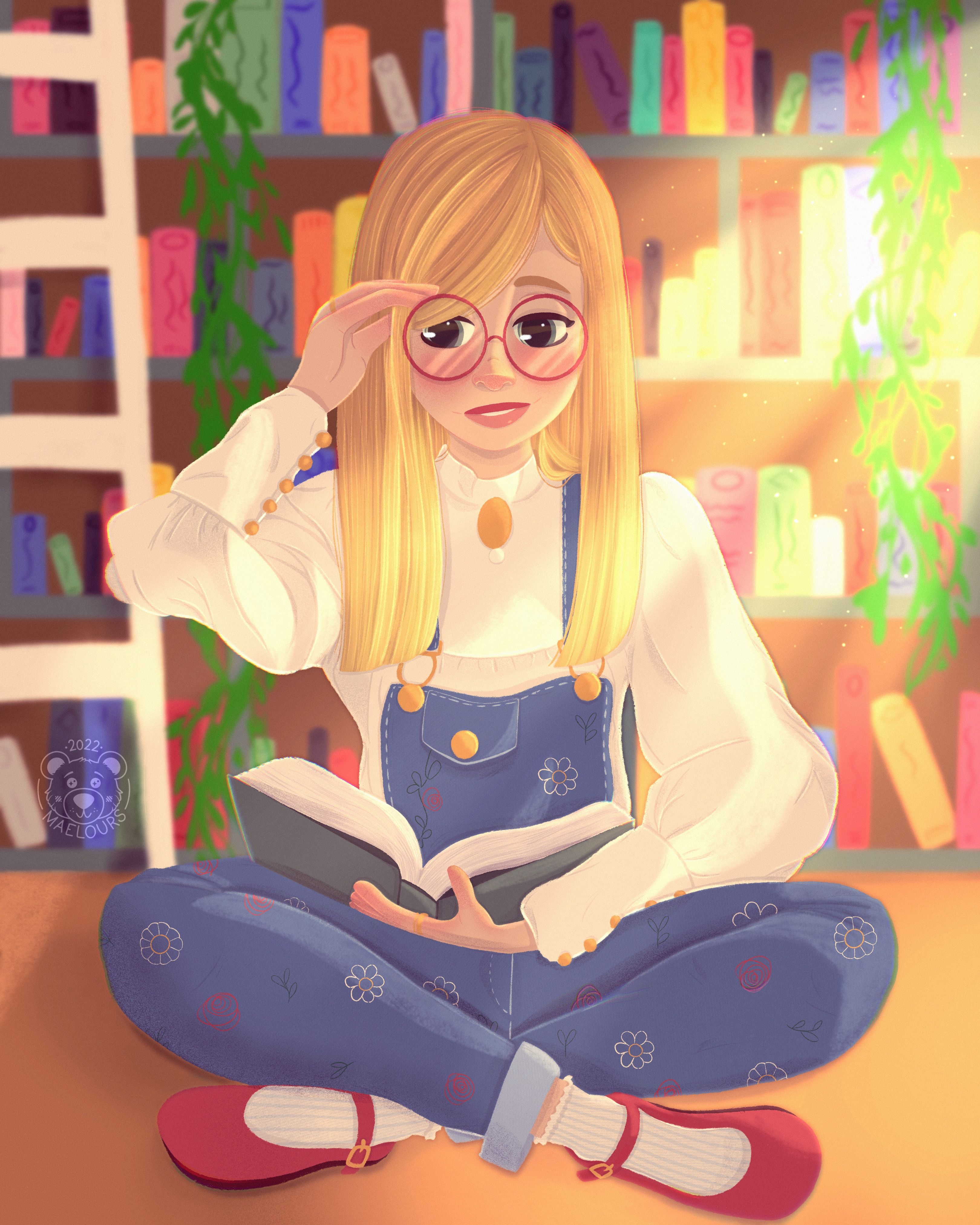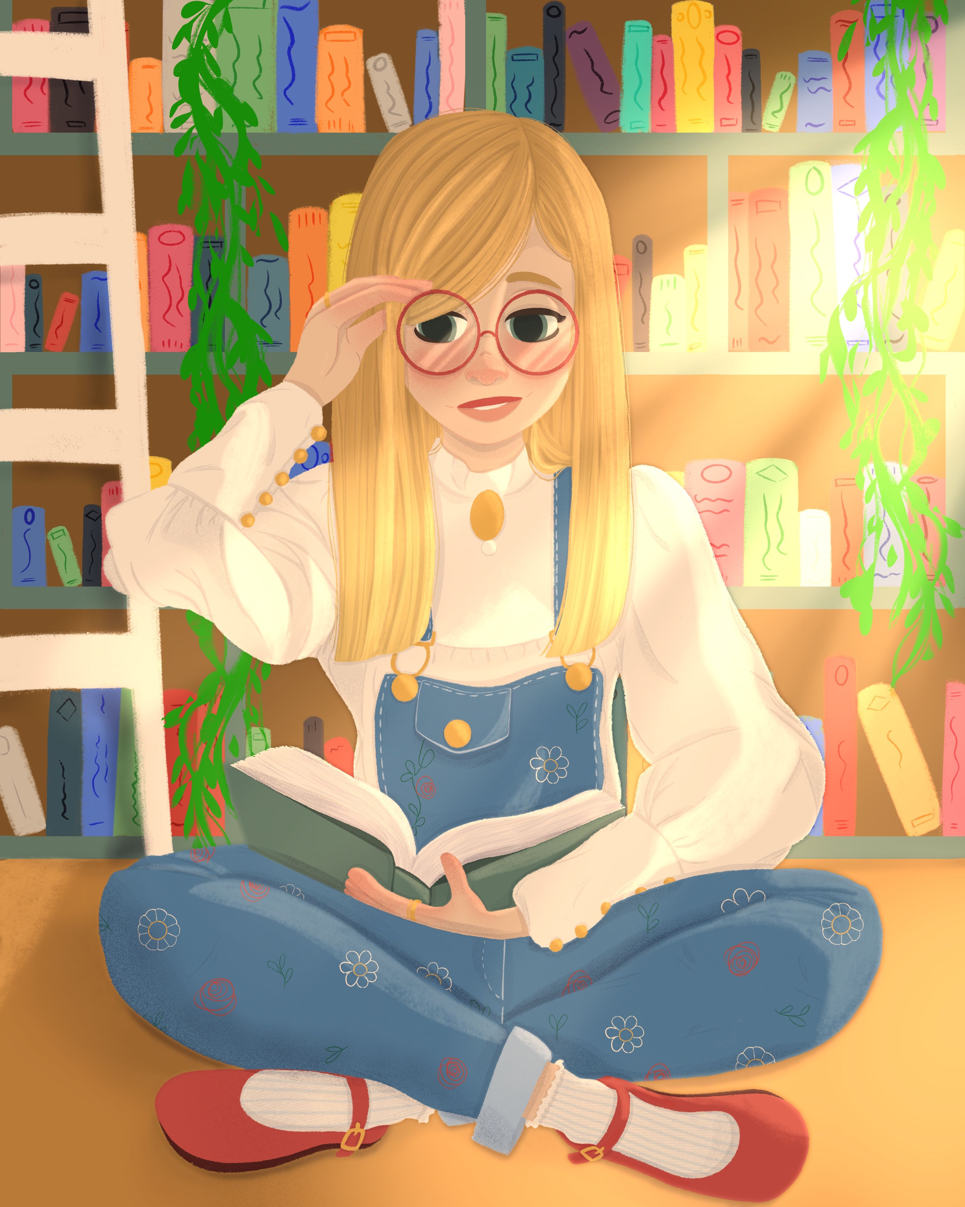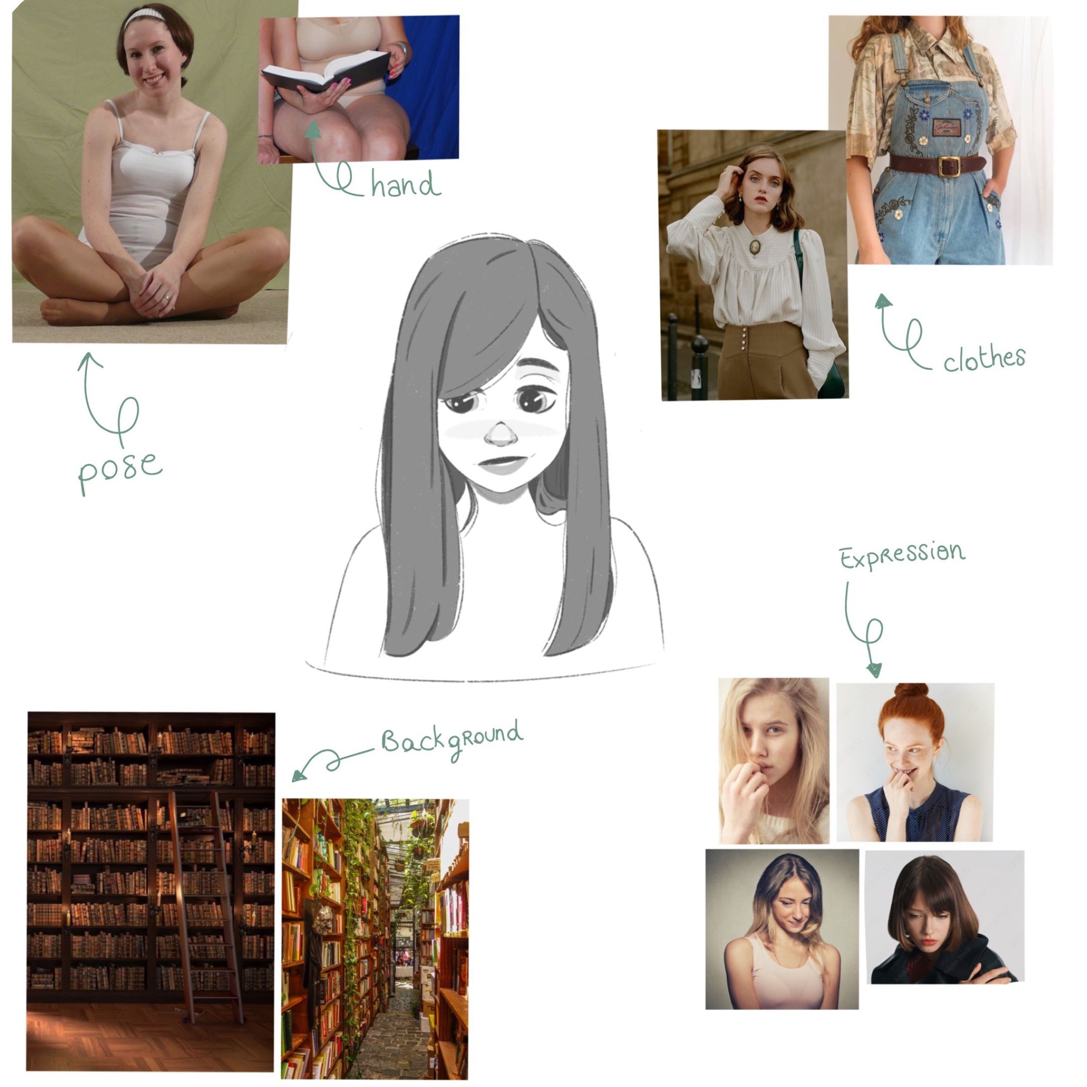 Pour ce projet final, je souhaitais réaliser un personnage féminin introverti, qui aime se réfugier dans les univers fantastiques des livres qu'elle lit plutôt que la vie réelle. J'ai donc choisi de la représenter dans une bibliothèque, avec une expression timide.