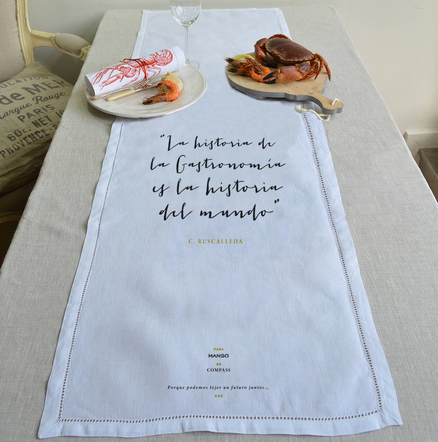 Un evento especial para Mango en el increíble Palau Nacional, sede del MNAC, con un detalle único, unos caminos de mesa bordados a mano especialmente para la ocasión con la frase de Crame Ruscalleda La historia de la gastronomía es la historia del mundo.