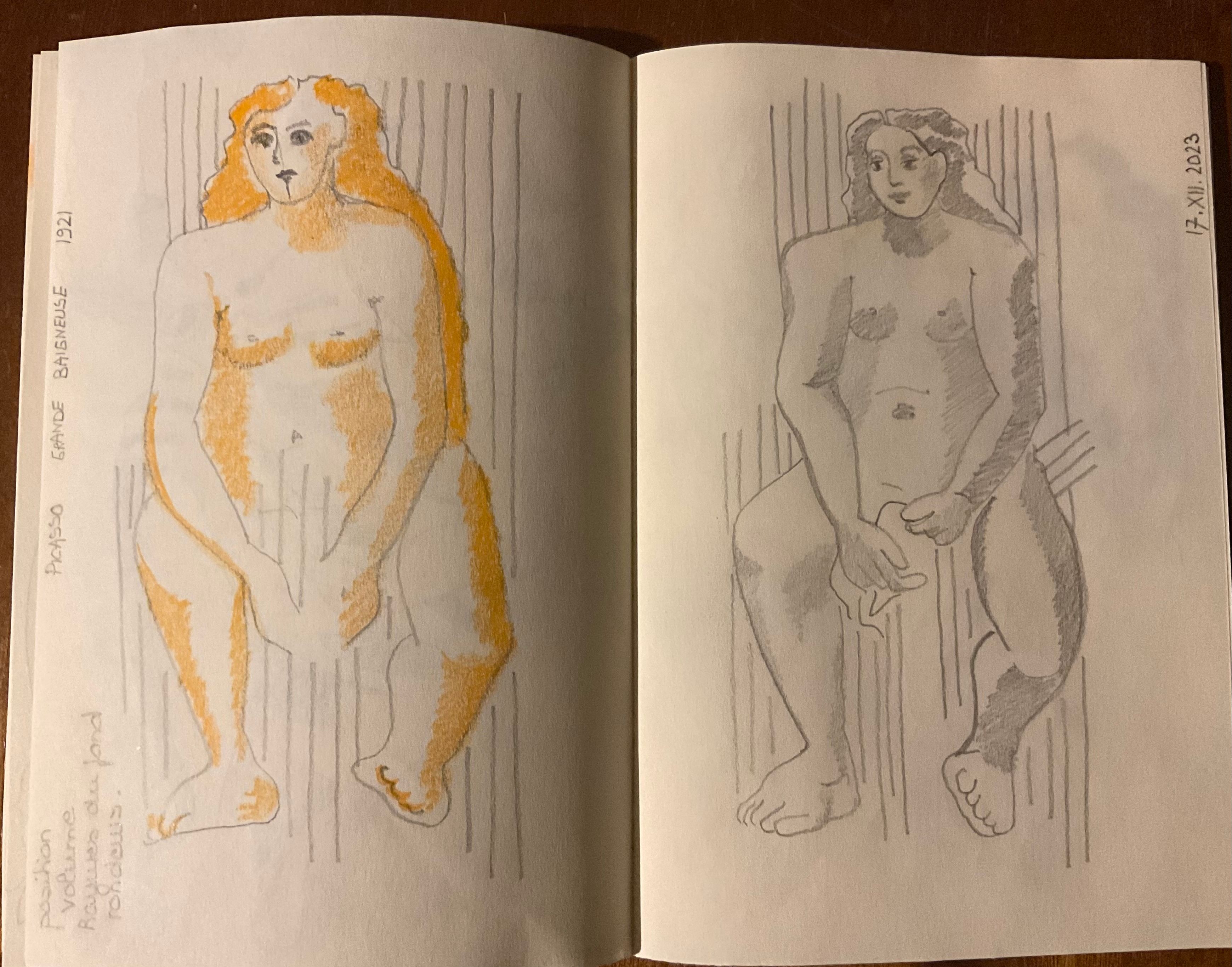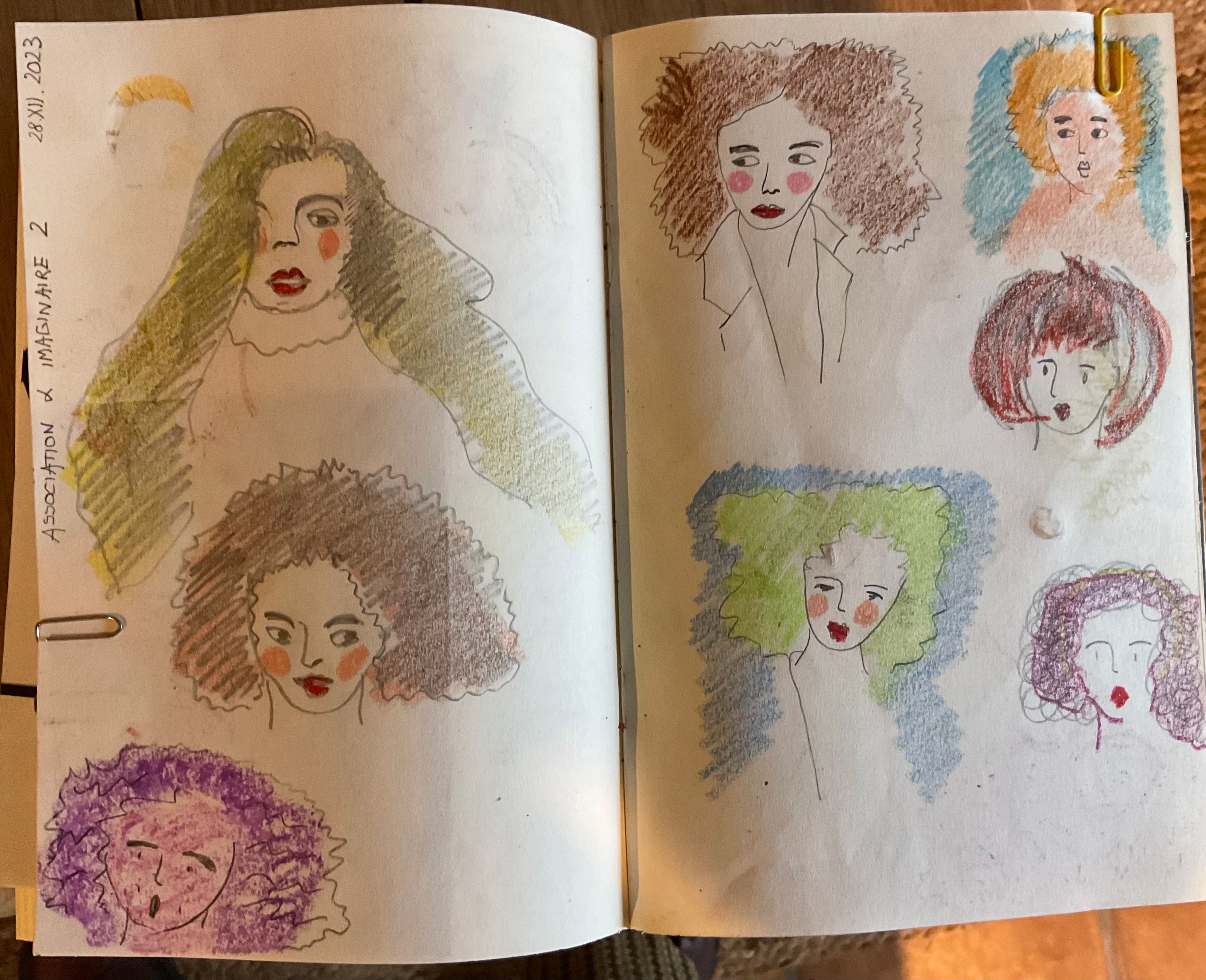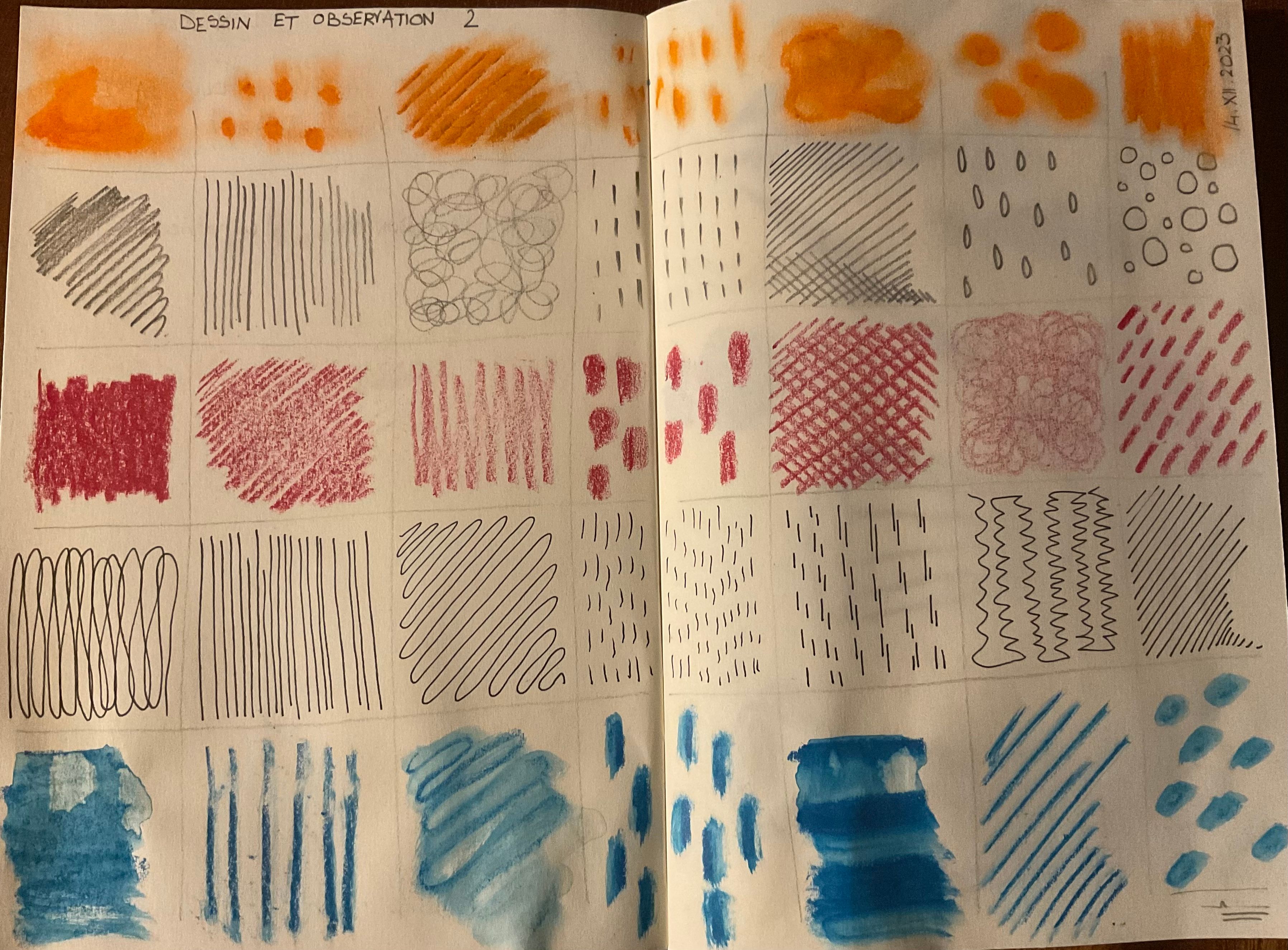 Kamu sudah melakukan banyak hal! Aku sangat suka tanda yang kamu buat di berbagai sketsa wanita itu. Tekstur di halaman eksperimenmu juga sangat menarik!