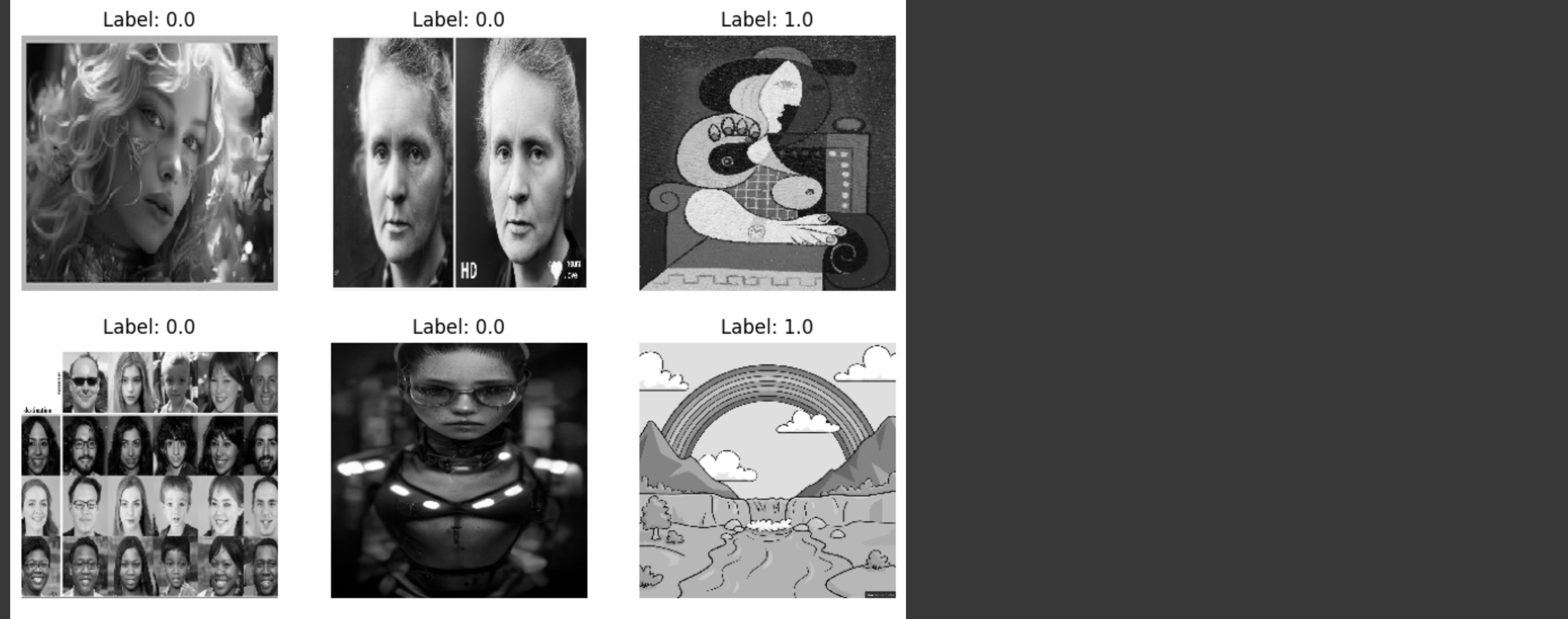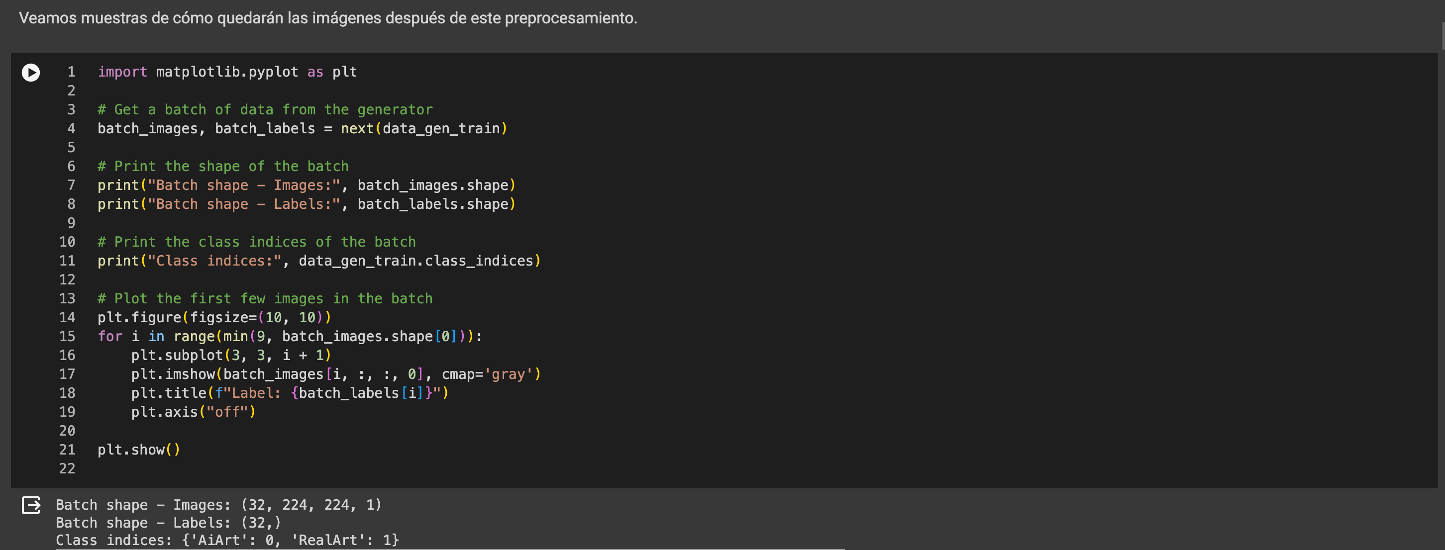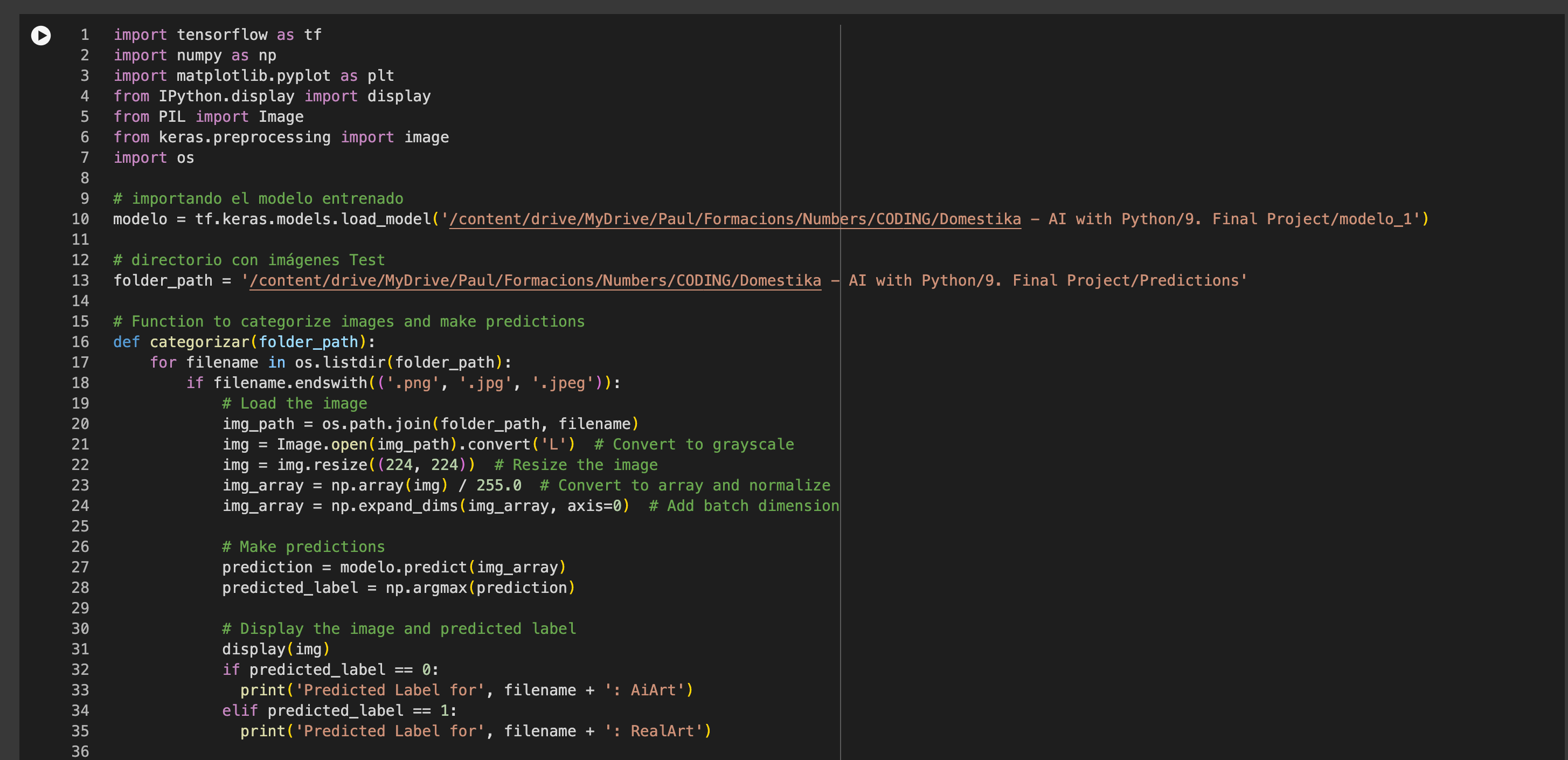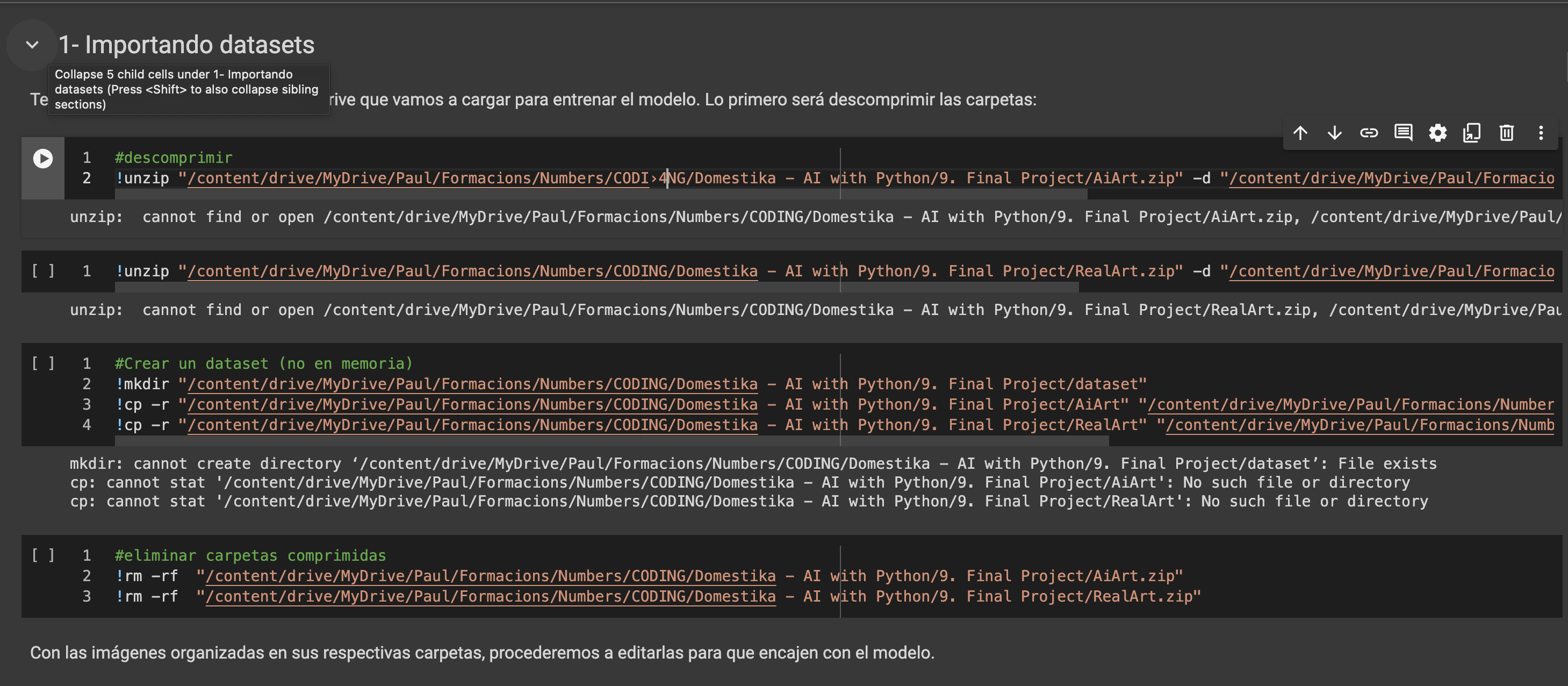 Para entrenar el modelo importaremos dos carpetas con aproximadamente 435 imágenes cada una de dos tipos: arte creado por IA; y arte creado por humanos. Por arte entendemos pinturas, dibujos, fotografías, etc.