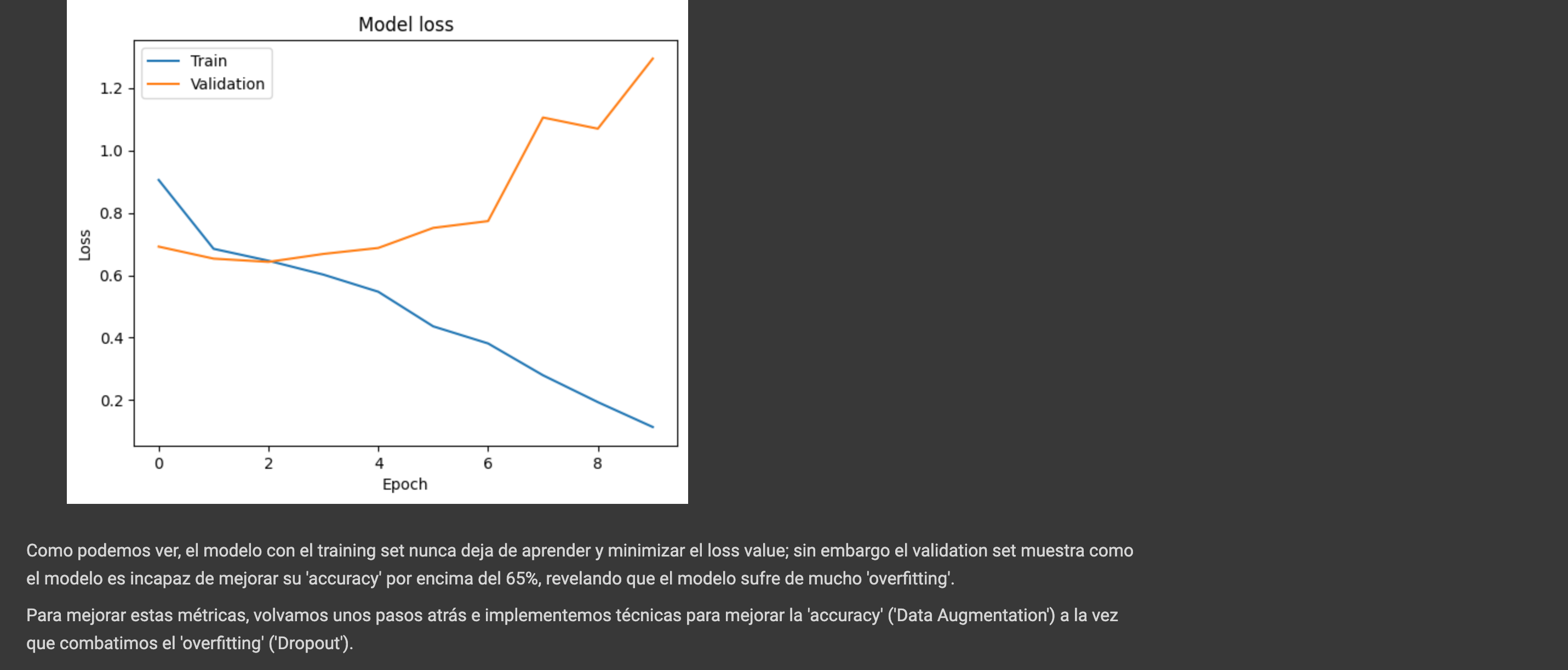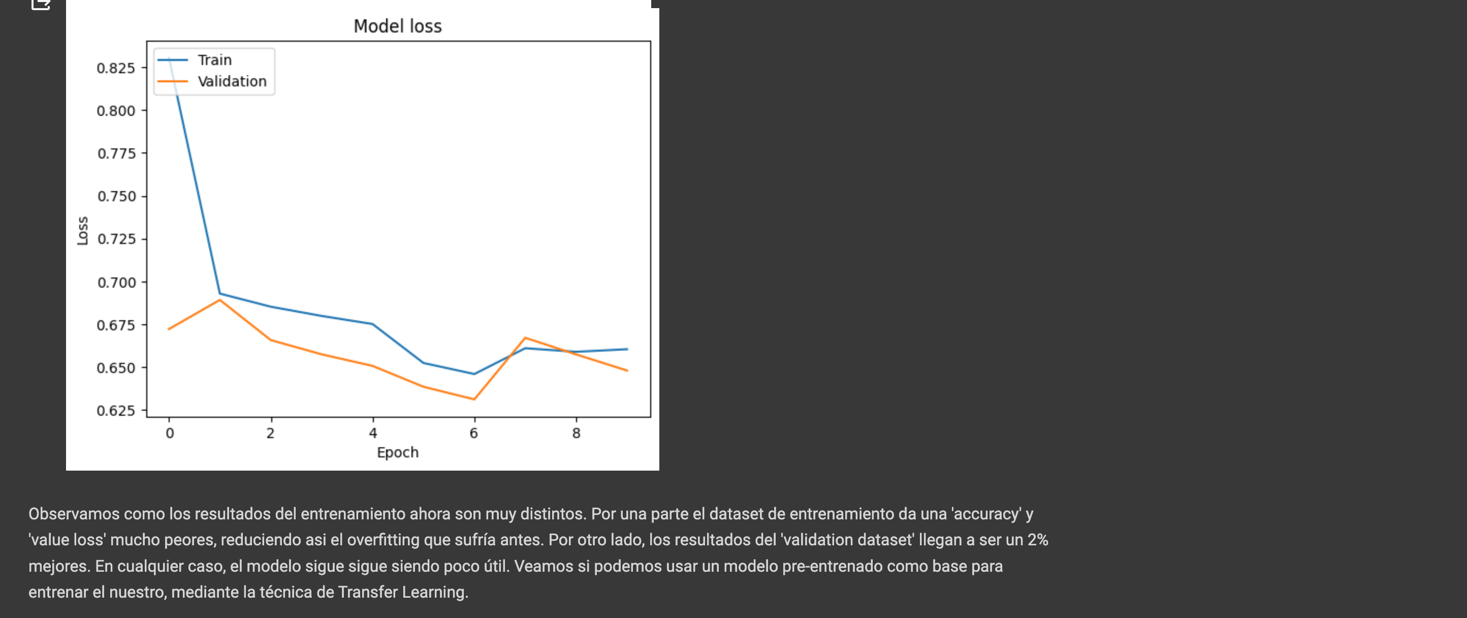 Tras probar 3 métodos de entrenamiento (datasets originales; data augmentation+dropout; transfer learning), no hay duda de que el más efectivo es Transfer Learning. No es sorprendente, teniendo en cuenta que hemos aprovechado el poder del modelo de Keras EfficientNetV2, el cual tiene más de 5 millones de parámetros entrenados. La capa que le hemos puesto por encima apenas tiene 2000.