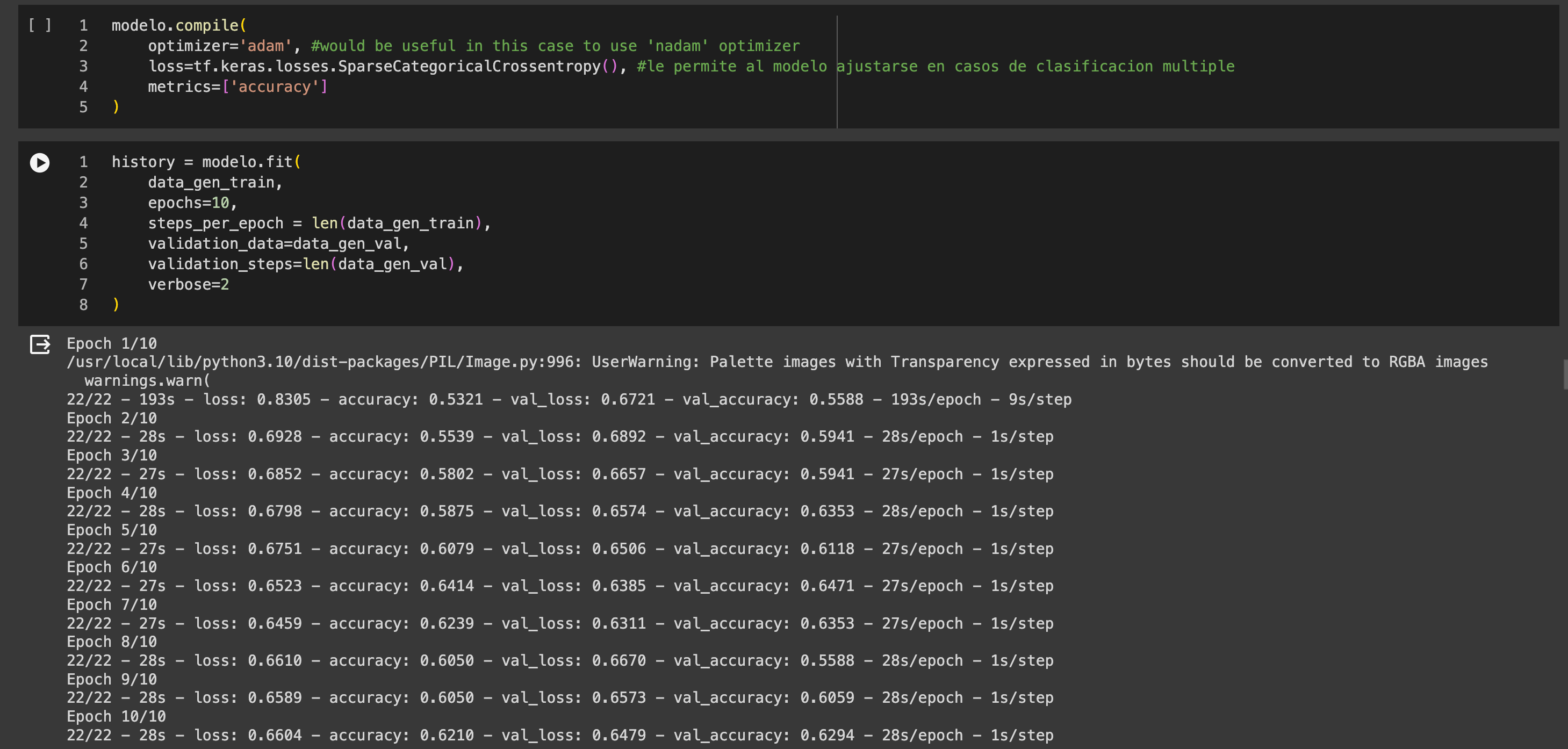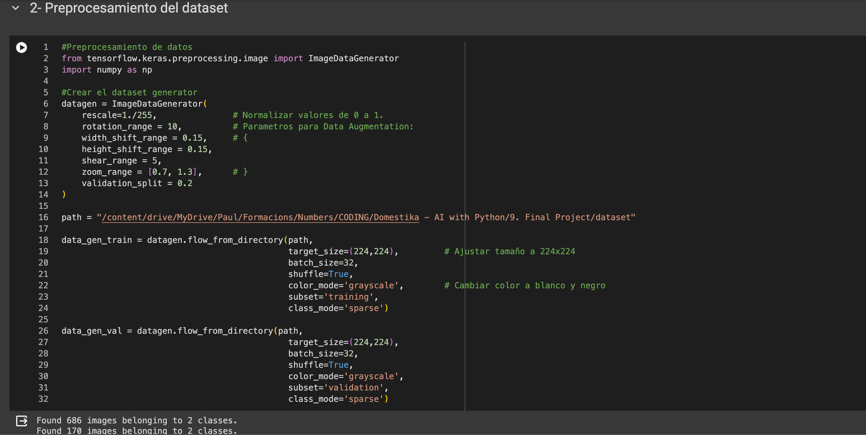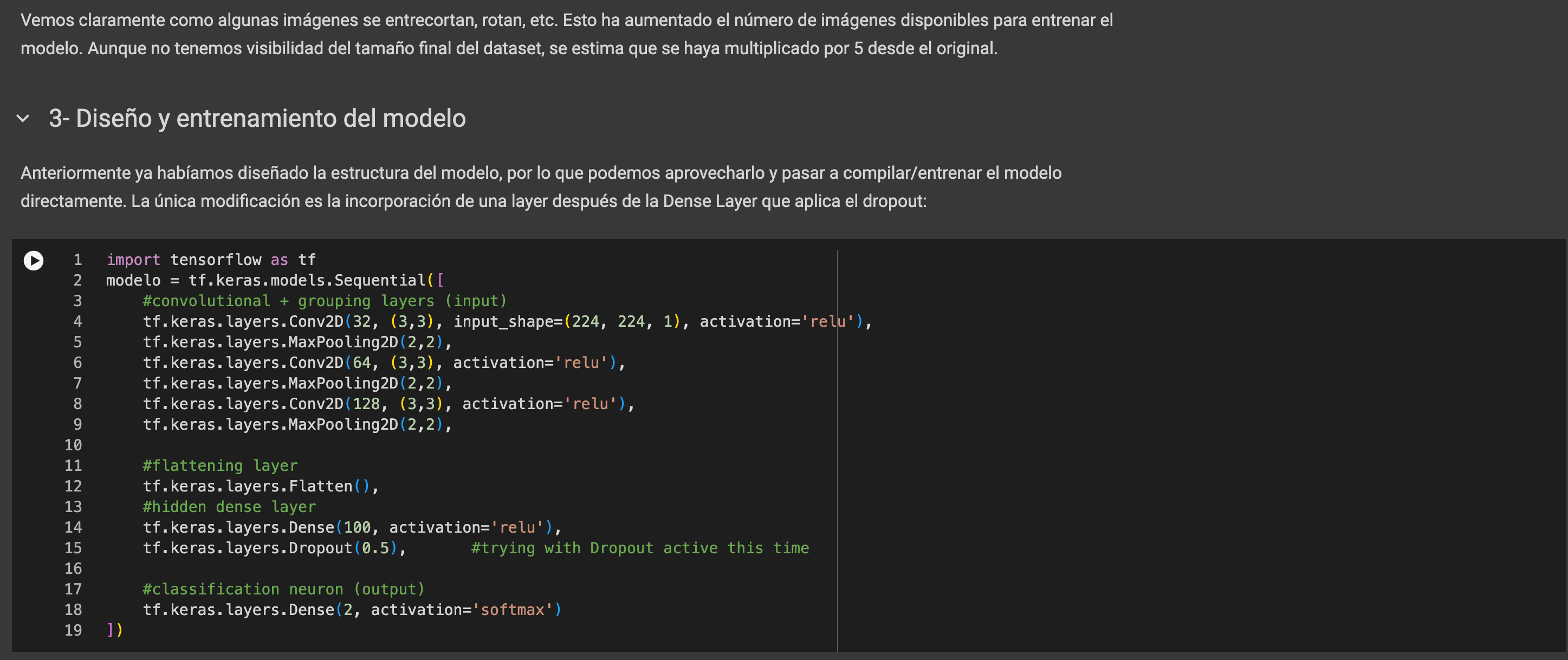 b) Enhanced data preprocessing: importaremos los datasets igual, pero antes de entrenar el modelo aplicaremos Data Augmentation para incrementar los datasets. A su vez, aplicaremos Dropout al modelo para que sea más versátil.