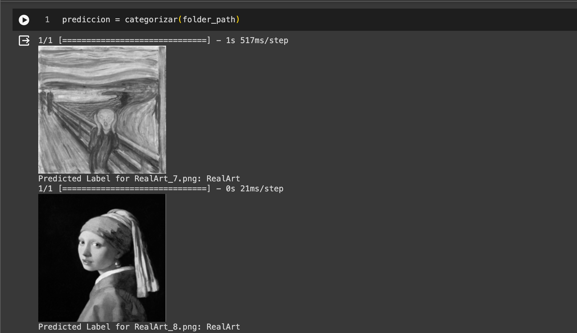 Los resultados que hemos obtenido con el modelo (versión 3) no defraudan: ha clasificado correctamente 9 imágenes de 12. De hecho, en el grupo de imágenes AIArt del test dataset sólo ha fallado una. El modelo podría ser optimizado mucho más aún si invirtiéramos tiempo en probar cambios en los hiperparámetros, funciones de activaciones, optimizadores, etc.