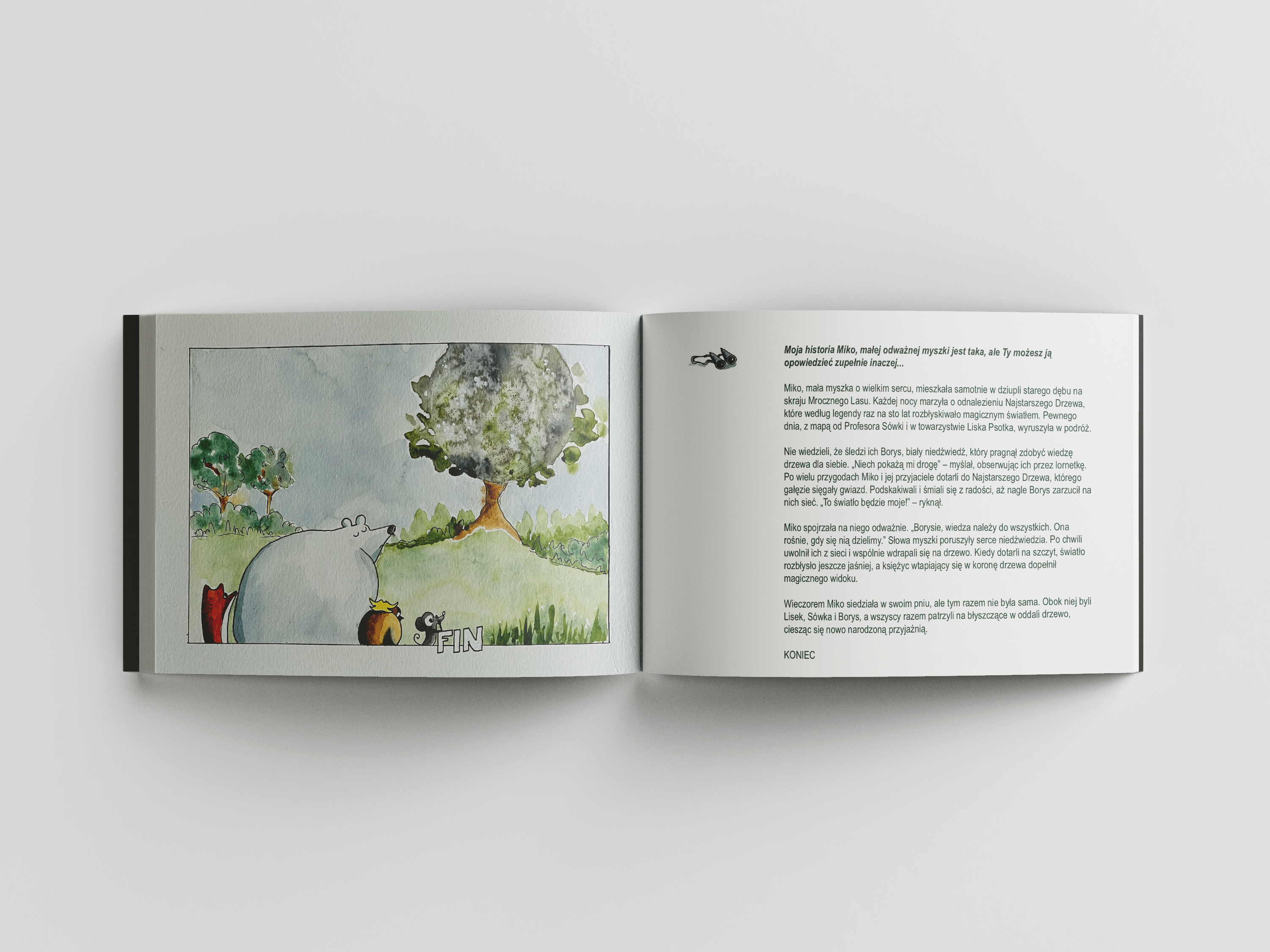 Miko, a little mouse with a big heart, lived alone in the hollow of an old oak tree on the edge of the Dark Forest. Every night, she dreamed of finding the Oldest Tree, which, according to legend, glowed with magical light once every hundredOne day, armed with a map from Professor Owl and joined by Fox Psotek, she set off on her journey.What they didn’t know was that Borys, a white bear, was secretly following them. He longed to claim the tree’s knowledge for “Let them lead me to it,” he thought, watching them through his binoculars. After many adventures on bumpy roads, between thi...Miko and her friends finally reached the Oldest Tree, its branches stretching up to the stars. They jumped and laughed witMiko looked at him bravely. “Borys, knowledge belongs to everyone. It grows when it’s shared.” Her words touched the bear’s hWhen they reached the top, the light shone even brighter, and the moon, blending into the tree’s crown, completed the magical