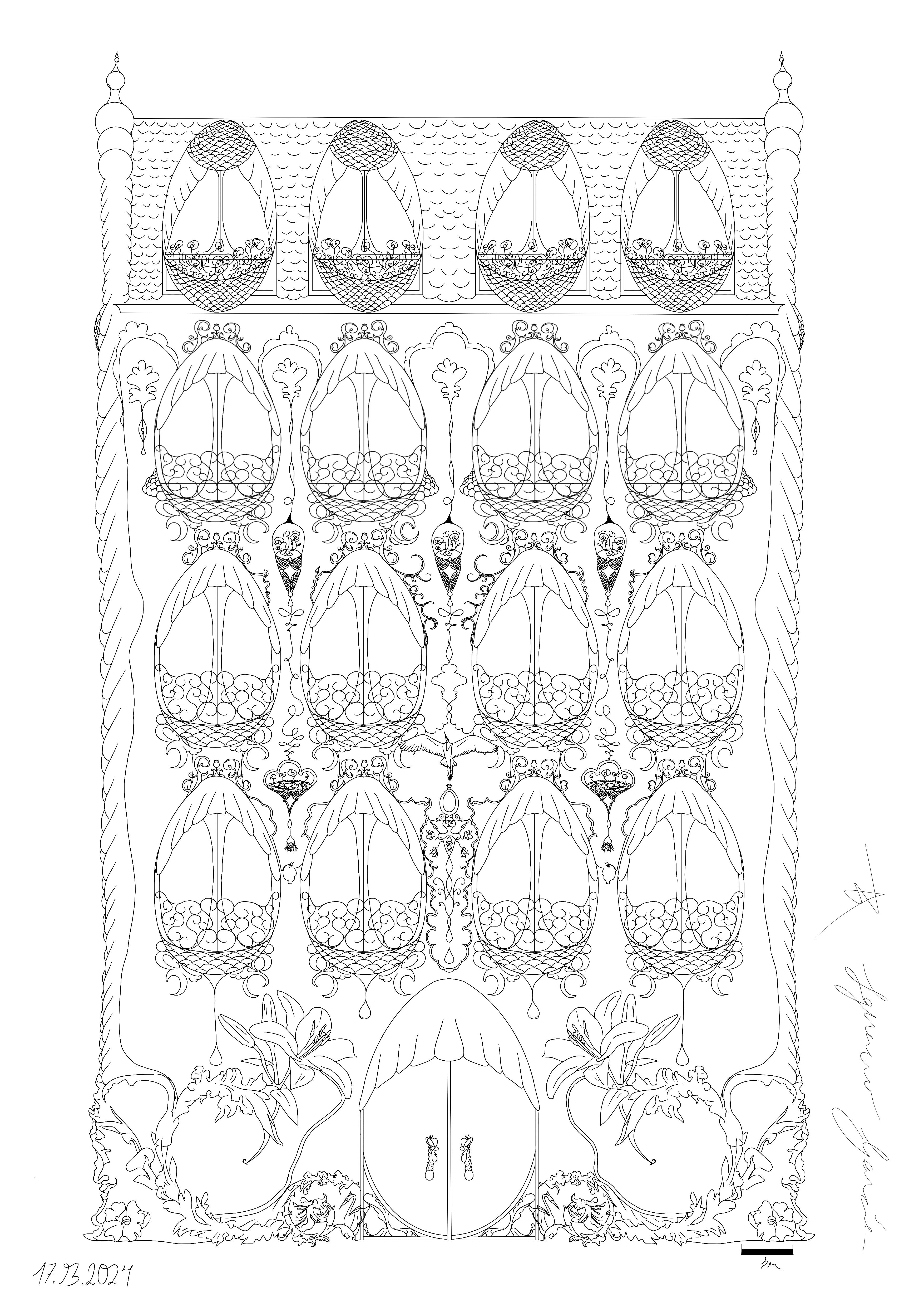 Sketch of an Art Nouveau house inspired by the white heron of the Mediterranean Levant. The facade combines floral motifs with ovoid-shaped balconies, evoking the elegance of a Fabergé egg.