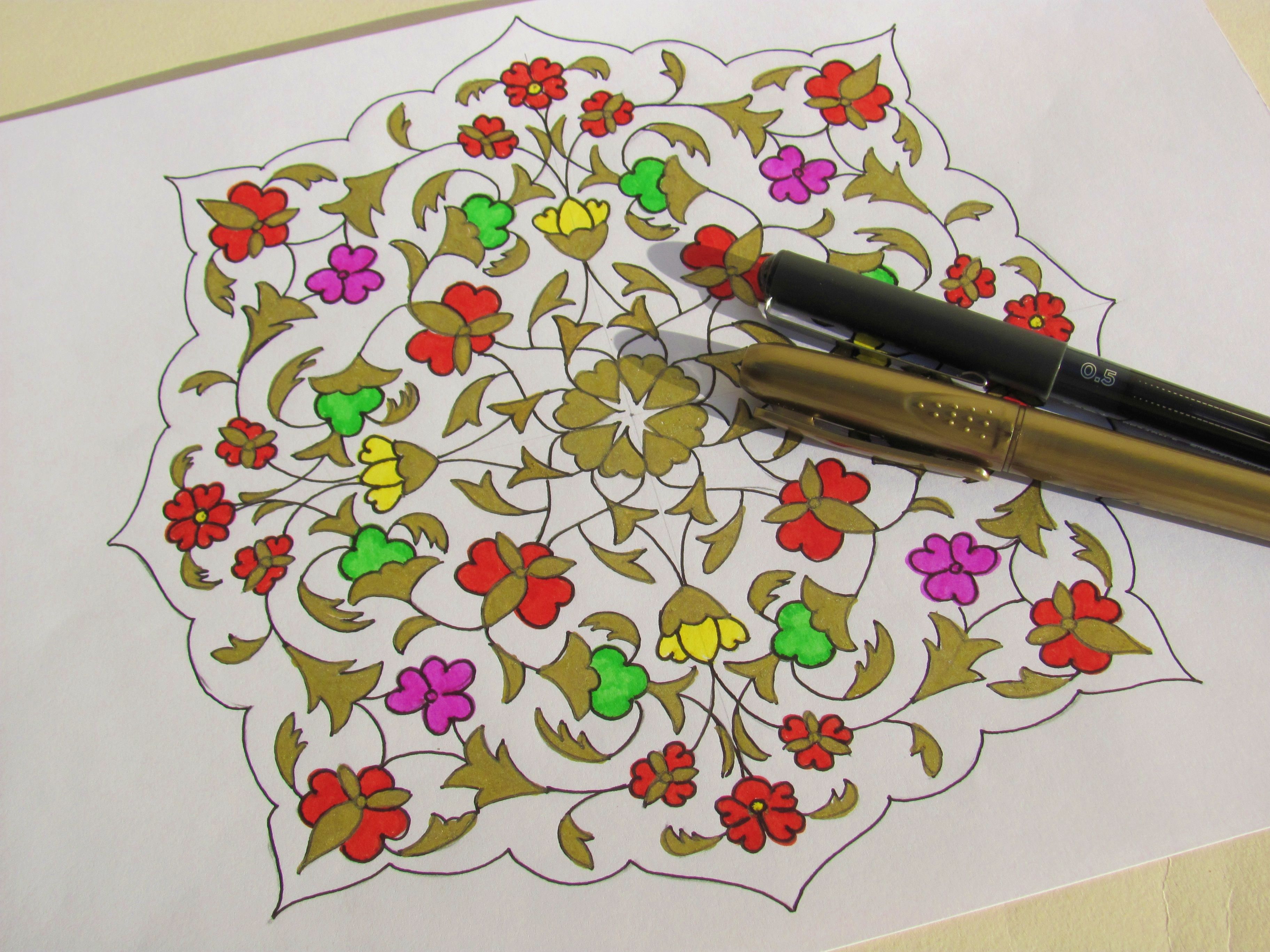 Foi utilizado matérias que tinha em casa. Caneta preta, caneta dourada e marcadores.