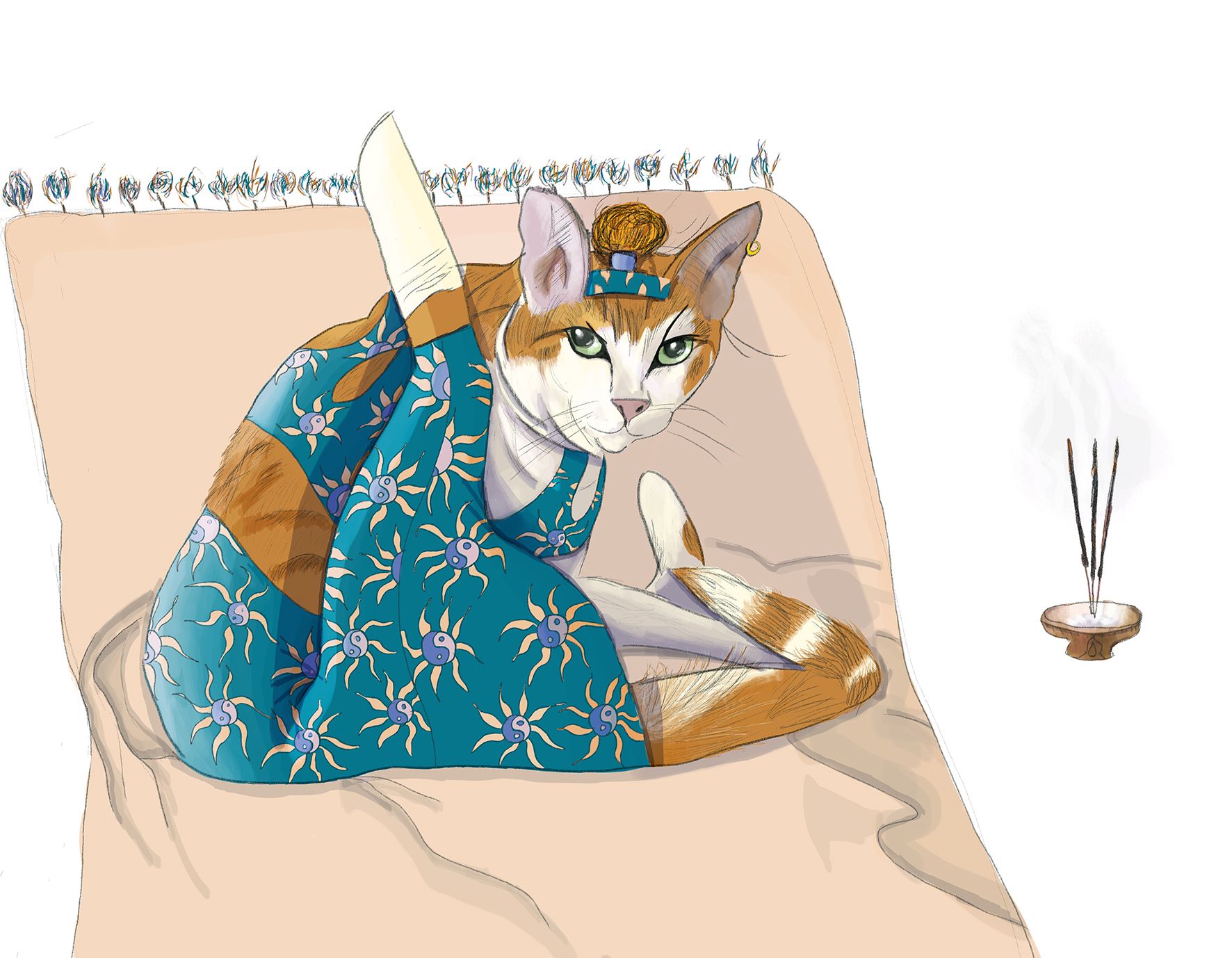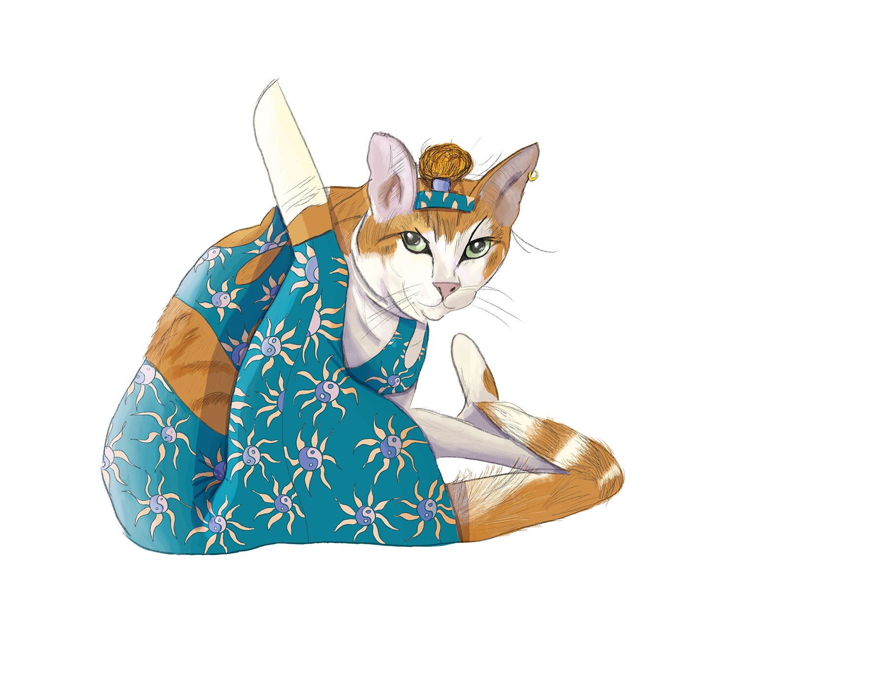 I tried to draw an anthropomorphic character inspired by the bendy poses of a cat. I thought at a guru yoga cat that tries to chill, but it's actually quite bothered by intruders observing her.