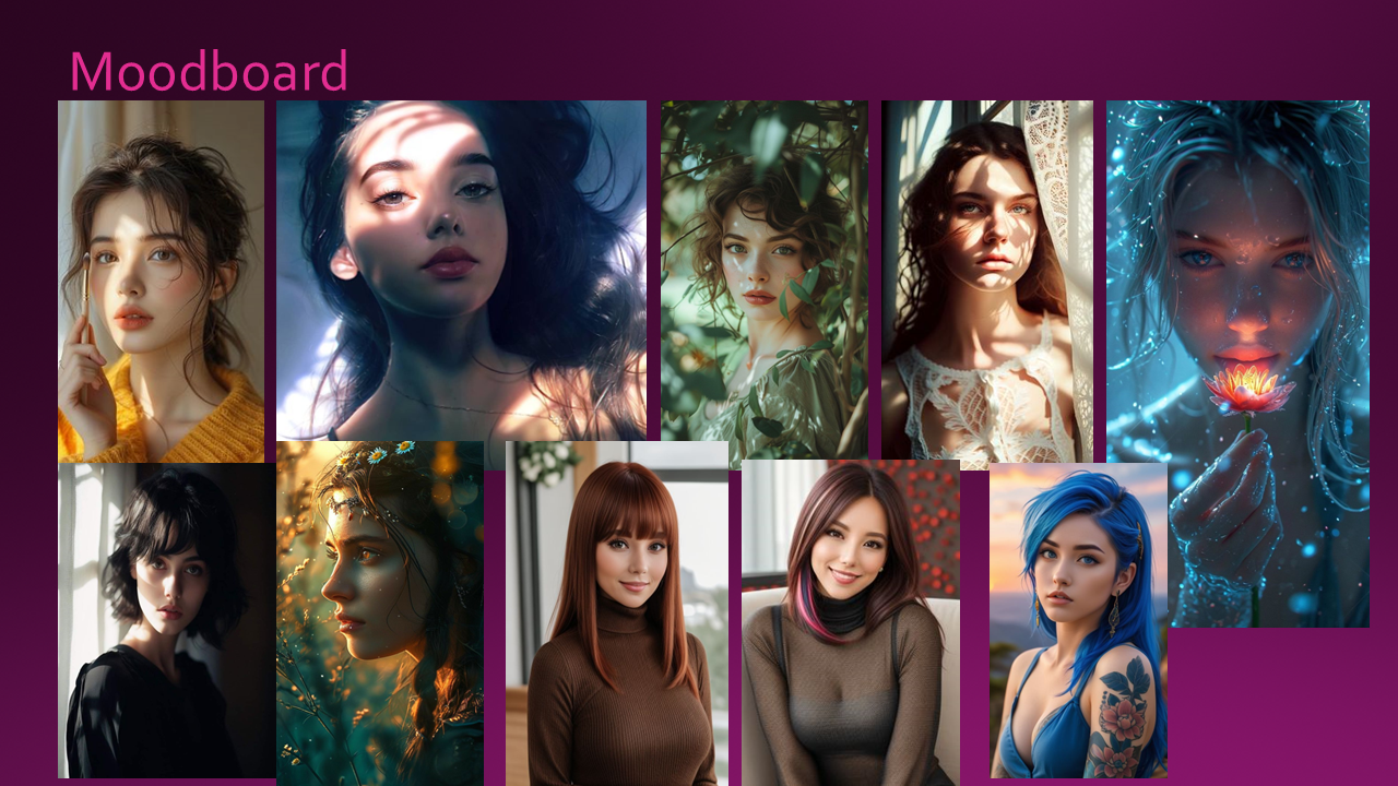Comienza con buscar diversas imágenes a modo de referencias para definir mi temática, tipo de iluminación , paleta de colores, composición , rasgos del rostro.