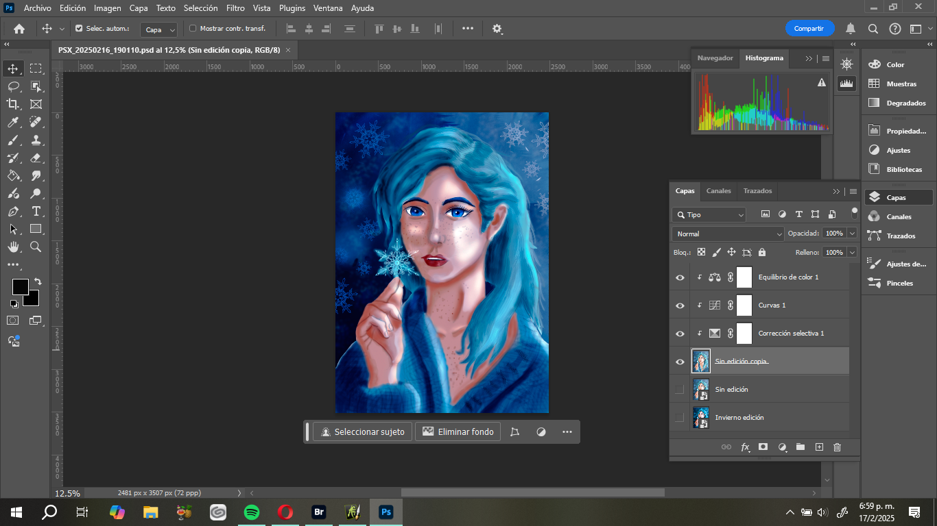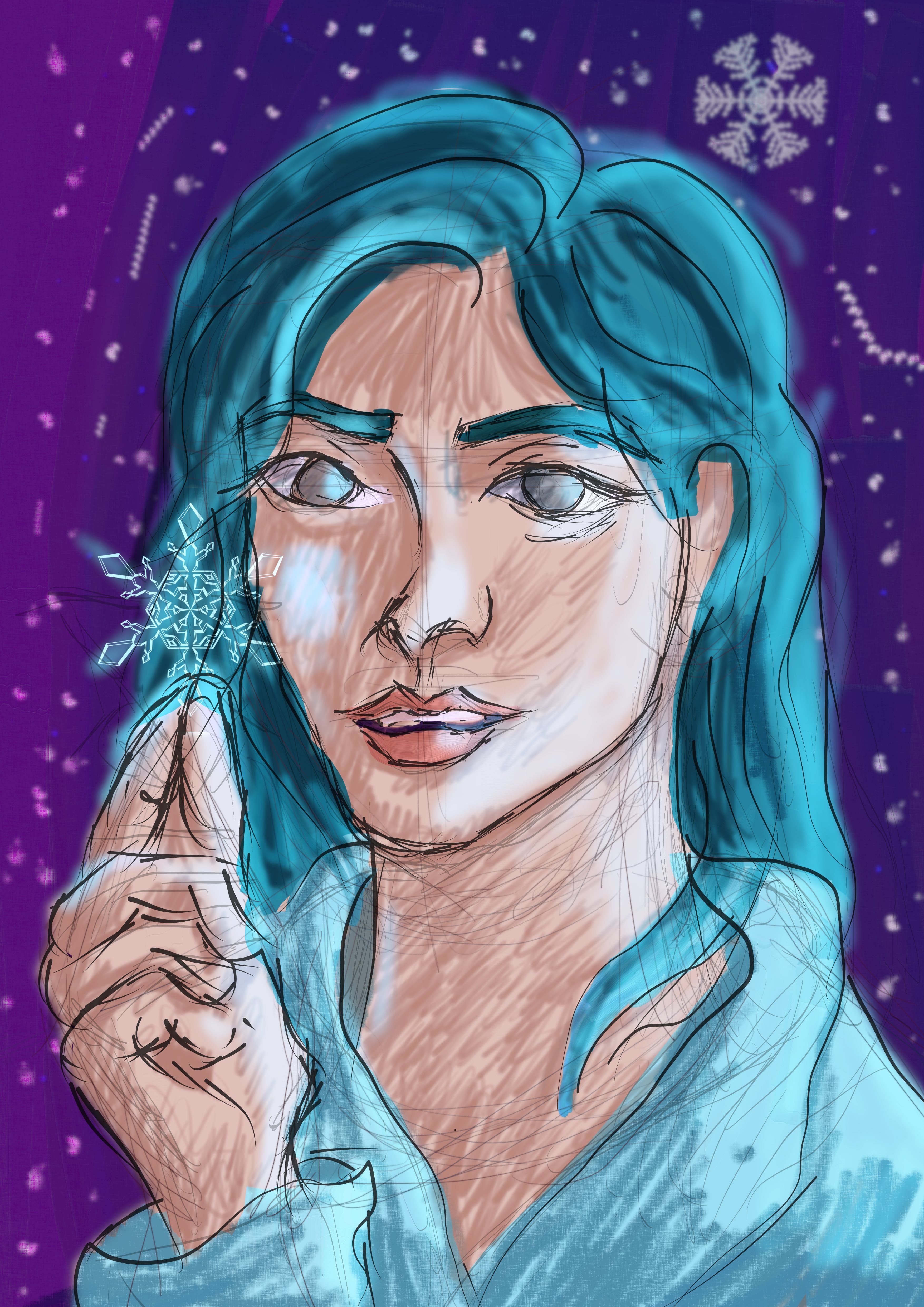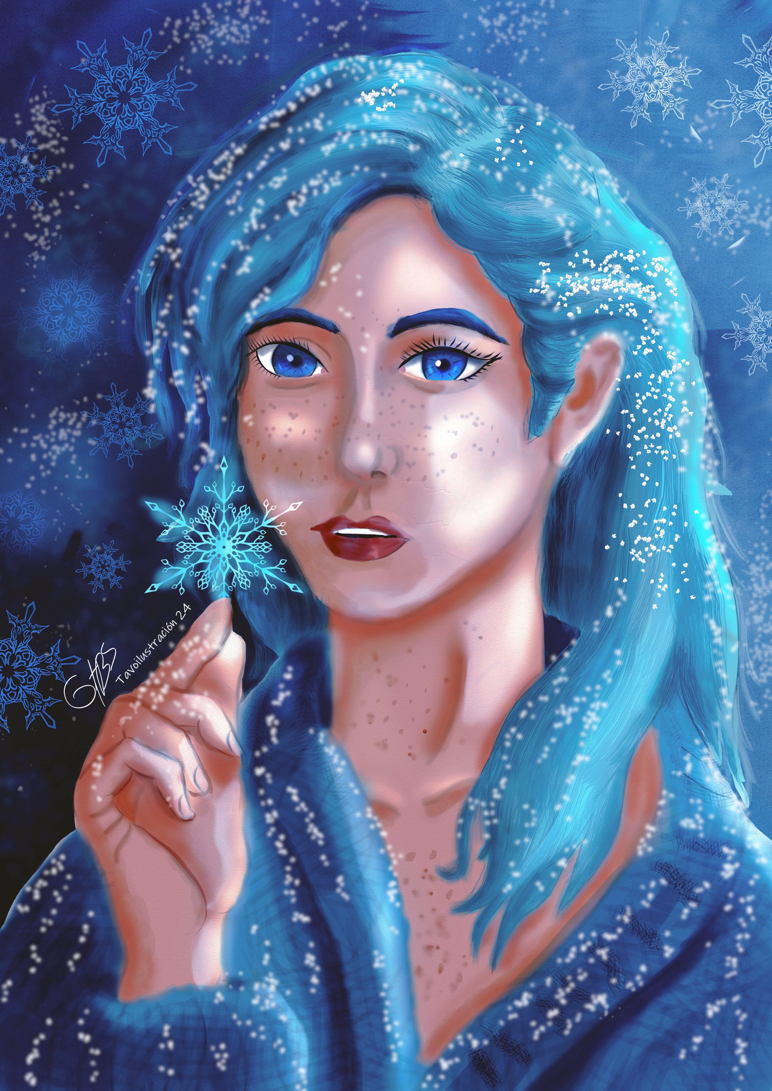 Una vez definido el coloreado base , procedo a definir la iluminación añadiendo un sombreado tenue como se explica en las lecciones del curso , con la finalidad de ir definiendo el volumen además de señalar la dirección de la luz. Como paso siguiente , una vez definida las sombras básicas; procedo a trabajar en los detalles de ojos , cabellos y el abrigo. Como parte del reforzamiento de la temática de un contexto de invierno , añado elementos como un copo de nieve y una nevada mediante las herramientas del programa ARTRAGE.