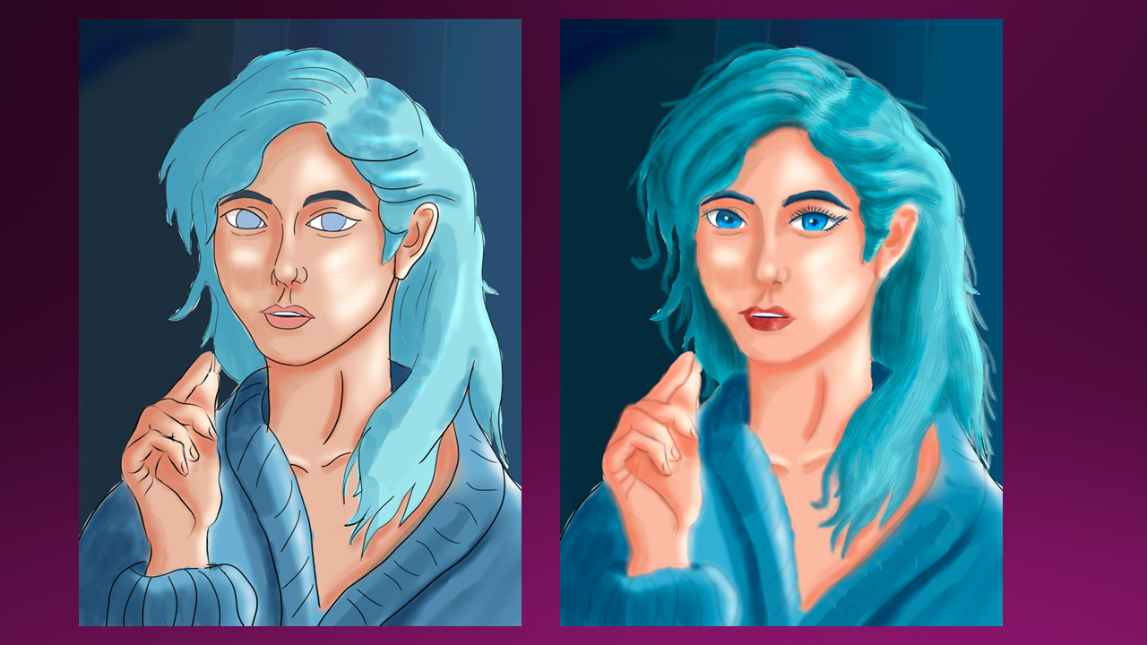 Una vez definido los detalles en Artrage ; pasamos la ilustración a photoshop, en dicho programa editamos los colores donde buscamos acentuar los tonos azulados ; adicional a esto reforzamos la iluminación.
