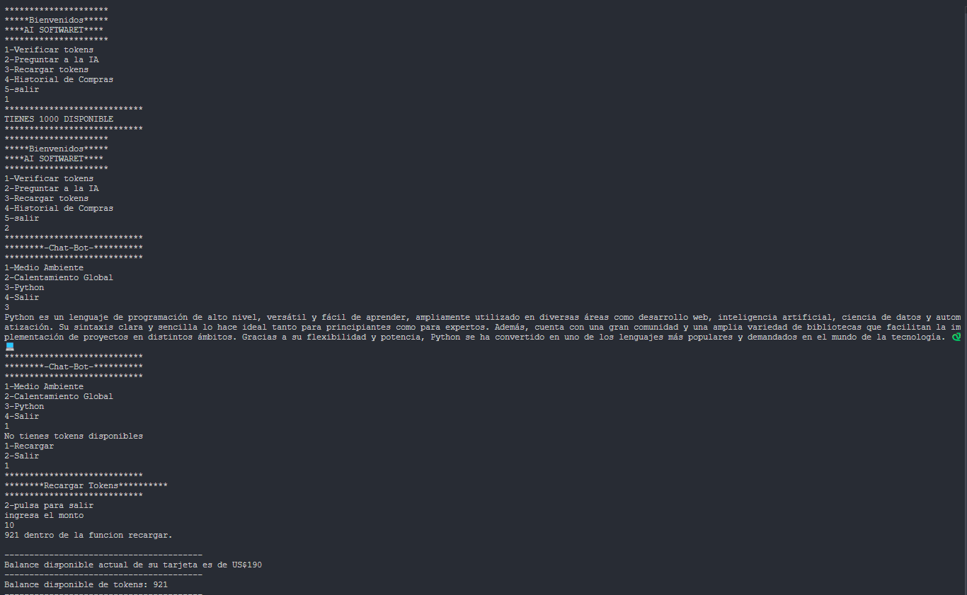 Chat bot, que consume tokens por cada petición , donde también puedes recarga los tokens en caso no contar con lo suficiente para lo requerido y con un historial de compras para llevar un control.