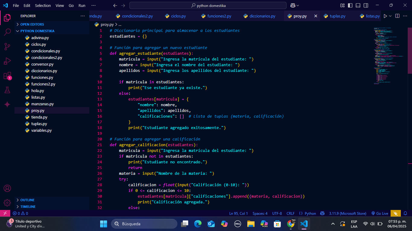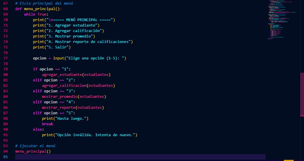 Este proyecto es un Gestor de Estudiantes y Calificaciones desarrollado en Python que permite administrar una pequeña base de datos desde la consola. Su propósito es ofrecer una práctica integral de programación utilizando estructuras que fueron abarcadas a lo largo de este curso tales como diccionarios, listas y tuplas, además de aplicar funciones, ciclos y condicionales