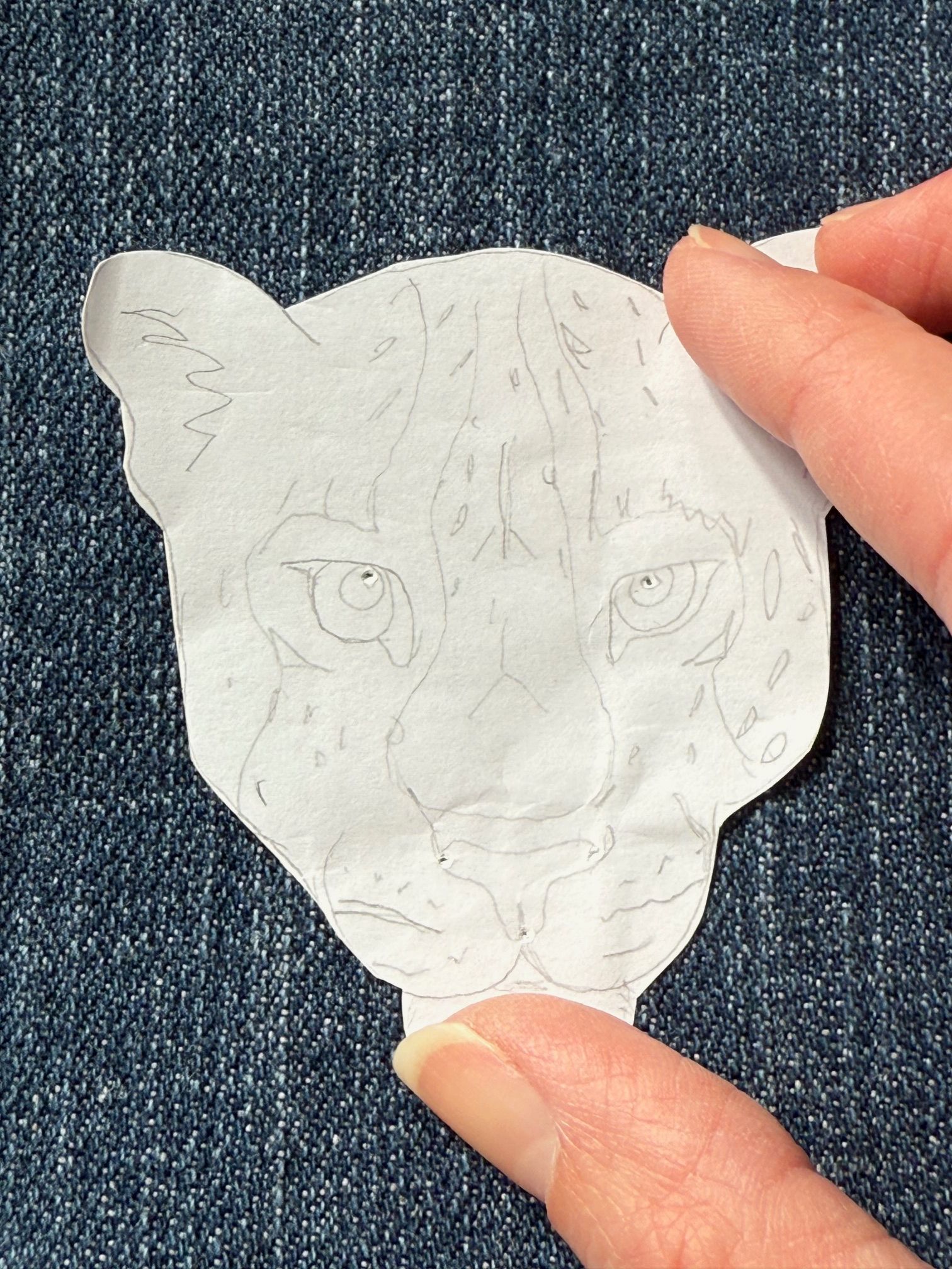 I had an inspiration board on Pinterest of embroidery artists and work that I was drawn to and inspired by. I decided for this project that I wanted to make a practical object embellished with embroidery. I have previously made needle books embellished with sashiko embroidery, so I decided on an embroidery that I could use for a needle book cover. I wanted to try a different type of embroidery inspired by my Pinterest board. I decided on a leopard head. I searched for appropriate reference images until I found some good ones that I used to make a rough sketch in Procreate.