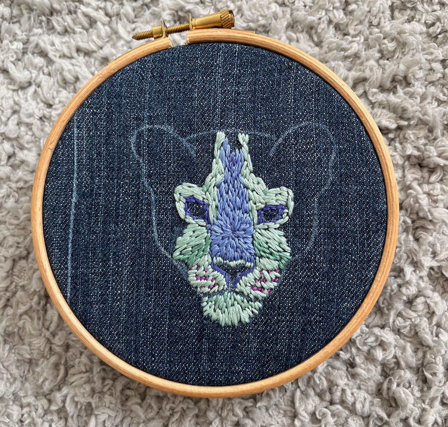 I decided to start embroidering the lightest areas first. I made a decision to use 6 strands of floss because I wanted the leopard head to have a chunky, almost sketch-like quality to it. In hindsight, I could have probably achieved the same effect with 4 strands, which would have allowed me to blend the individual stitches better. Lesson Learned!