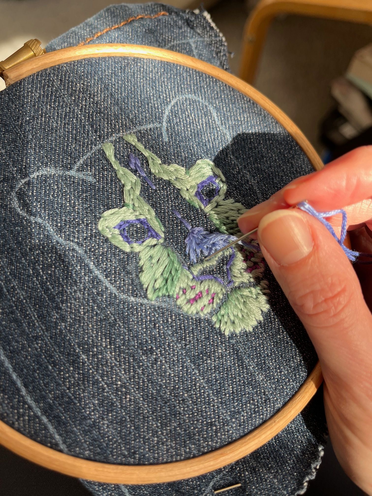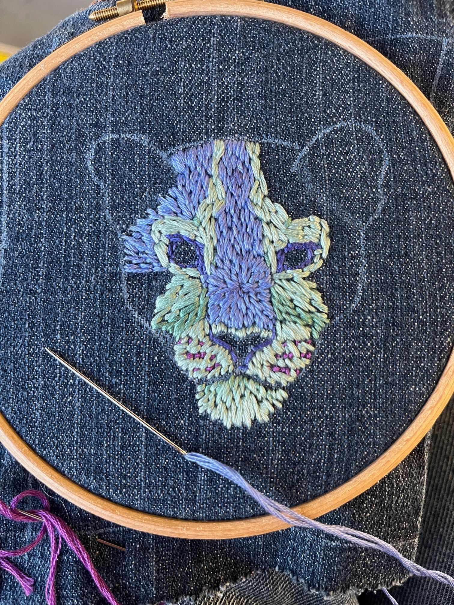 I then worked on the ears. I used my fabric pen to roughly mark out the transition between the light and shadowed areas and then stitched in the dark areas first. This is because I wanted the light stitches to overlap the shadowed areas. I graded out the dark stitches to the lighter blue on the edge of the ear by using long and short stitches that interlinked. For the pale fur in the ear I used 3 strands of floss because the fur here is longer, more wispy and delicate and 6 strands wouldn't have conveyed that very well. I used different values of the green hue to give the fur some depth. I had 2-3 needles threaded at the same time here so that I could change between them easily.