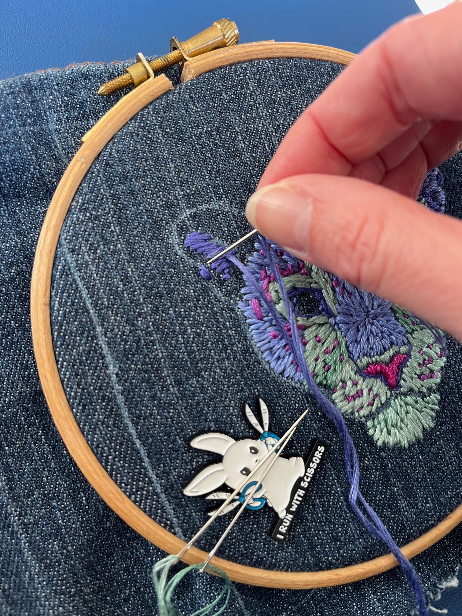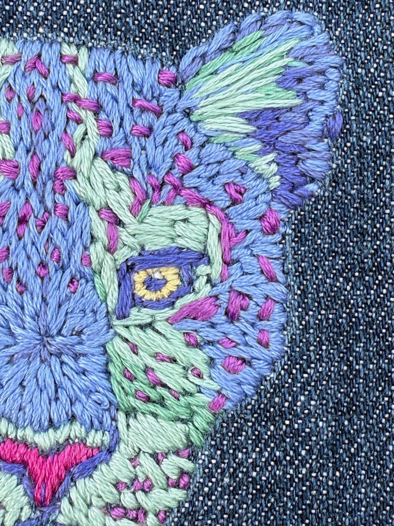 Linked to my original goals, was the desire to play with colour. I wanted to try using colours that were not true to life, but that could still be understood by the viewer. To do this I started by choosing a limited palette of around 3-4 colours. I tried a couple of variations, but ultimately chose a palette with blue as the main hue. I selected magenta/purple as a contrasting hue for the nose and spots, and yellow for the eyes because I wanted them to stand out. I mapped out these colours onto the initial sketch and then selected the closest colours I could find in my stash. I didn't want to buy anything new for this project so that I wouldn't be precious about using any of the supplies, so I decided to use an old pair of jeans as my fabric.
