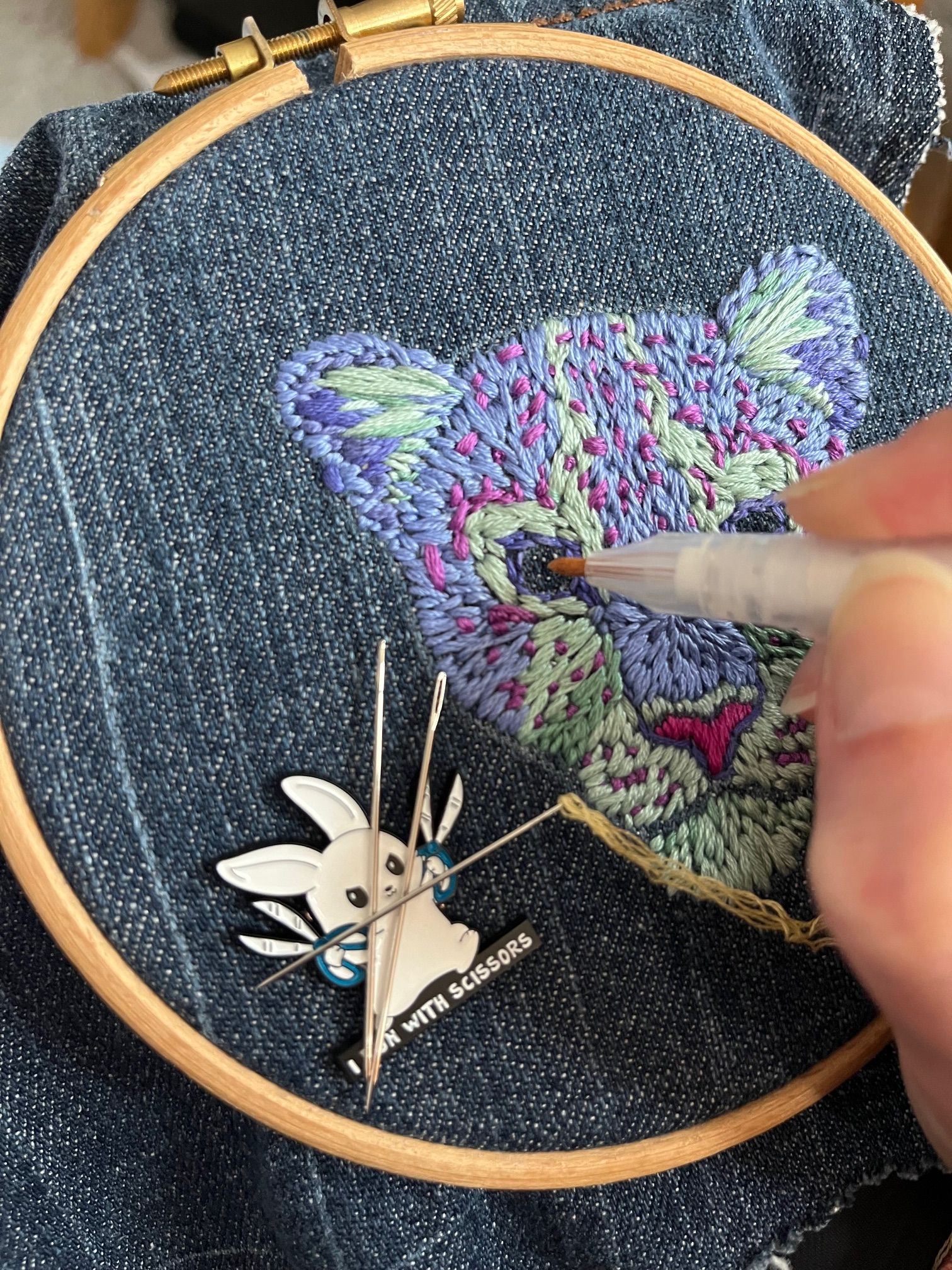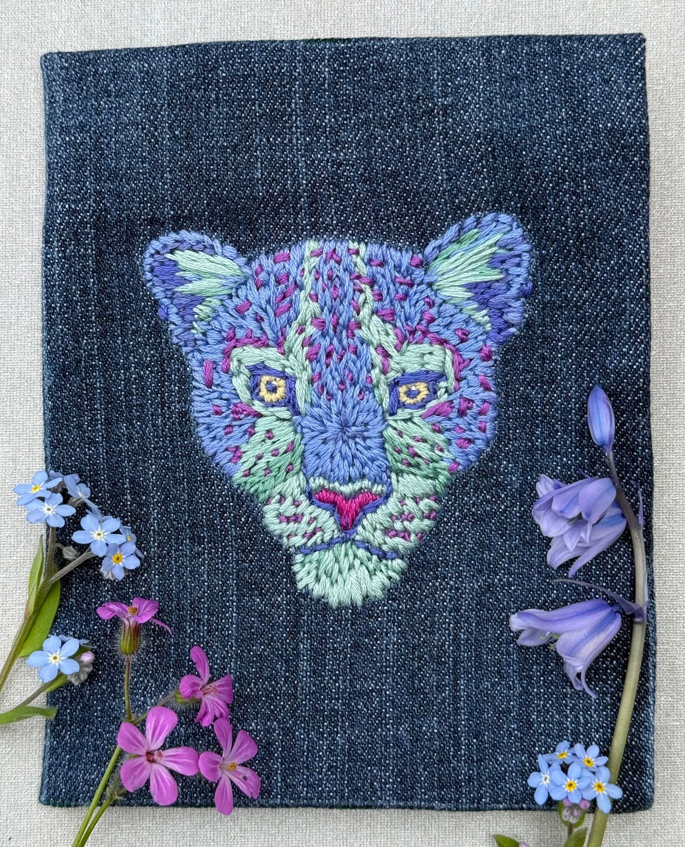 When I took the leopard out of the embroidery ring, I used a little bit of water on my fingers to wash away any fabric pen that was still visible. I then covered the embroidery with a clean, dry muslin and ironed the denim flat. It is now ready to be used as a cover for my next needle book.
