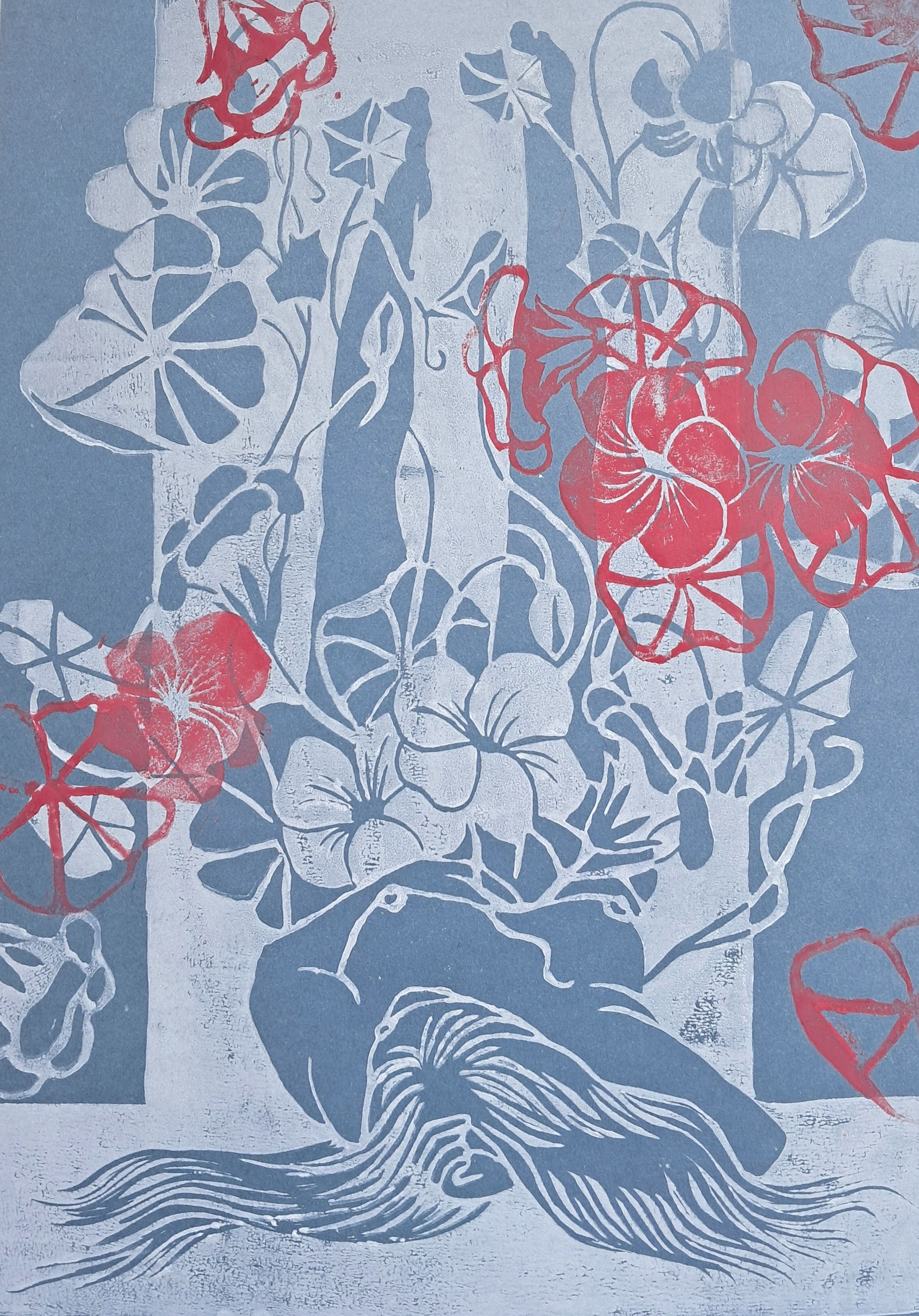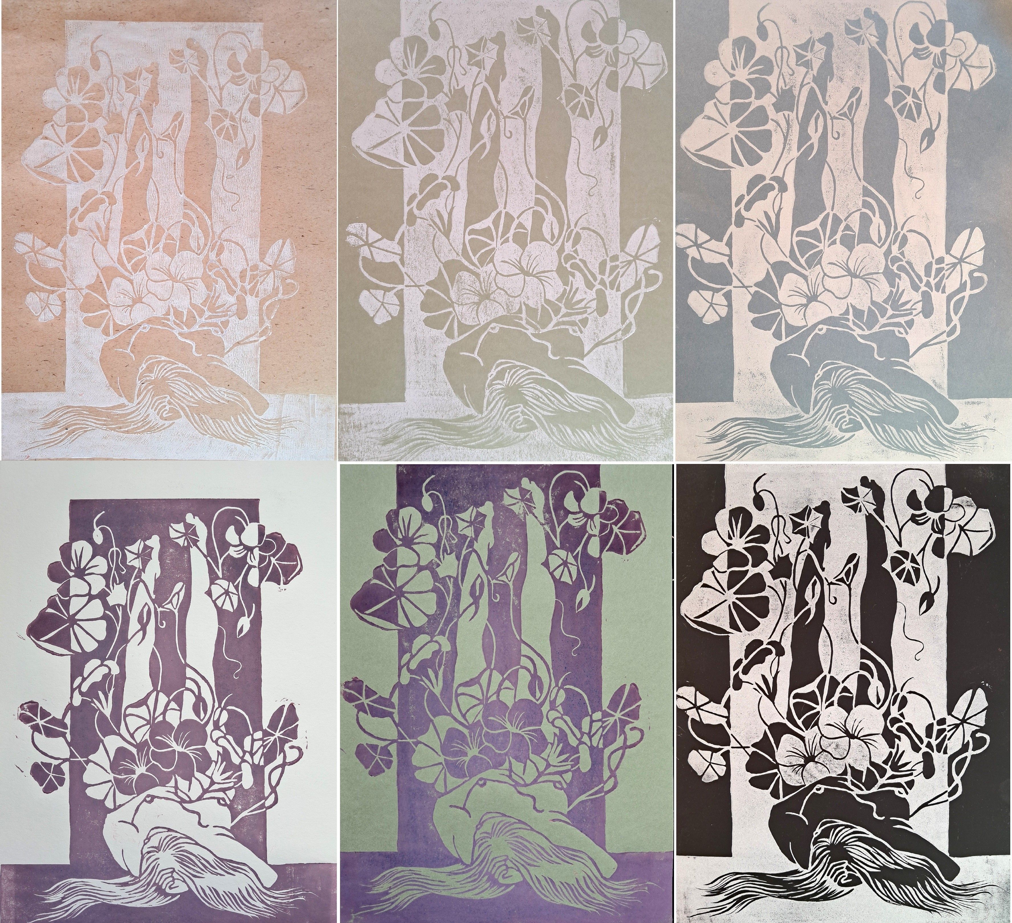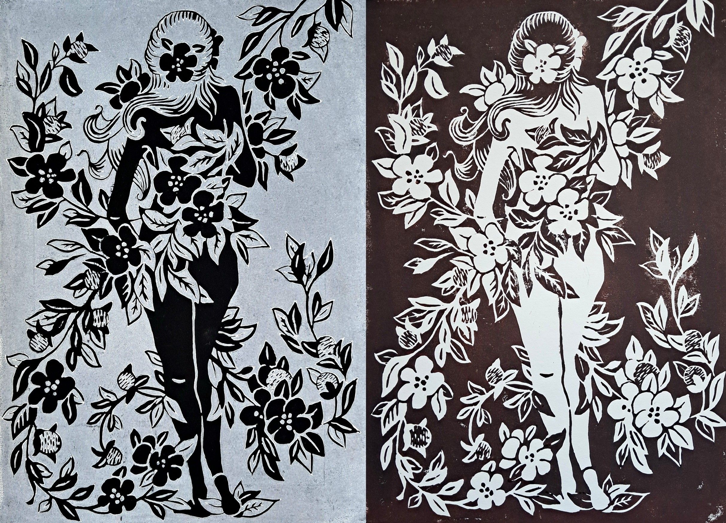 Stworzyłam dwa linoryty. "Sara w kwiatach" i "Raja i nasturcje".