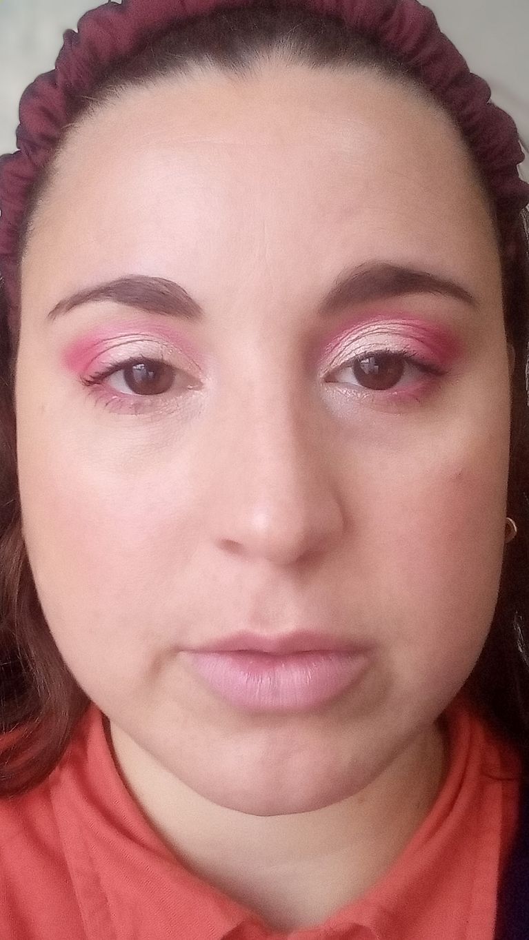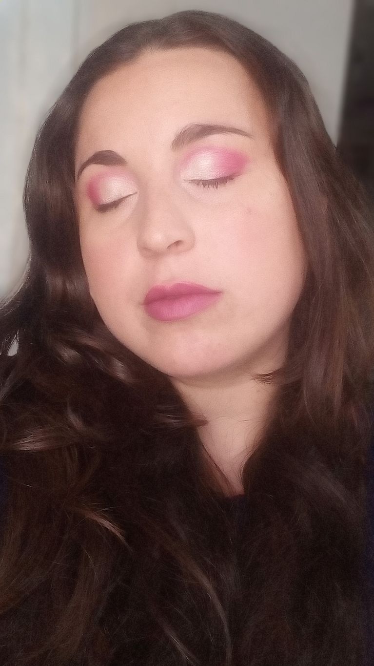 Realicé el cut crease en tonos rosados, en degradé de claro a obscuro, con iluminador cerca del lagrimal, la misma sombra obscura en el parpado inferior y mascara o rimel en las pestañas