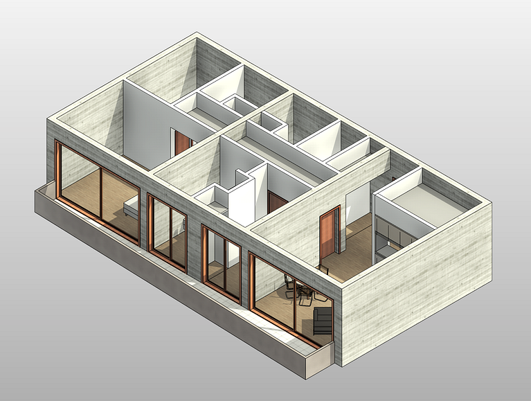 Para el exterior se usó el concreto tableado, porcelanato de madera y cerámico gris. Revit 2024.