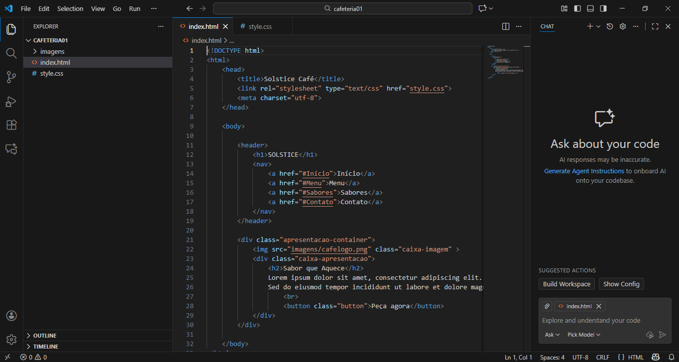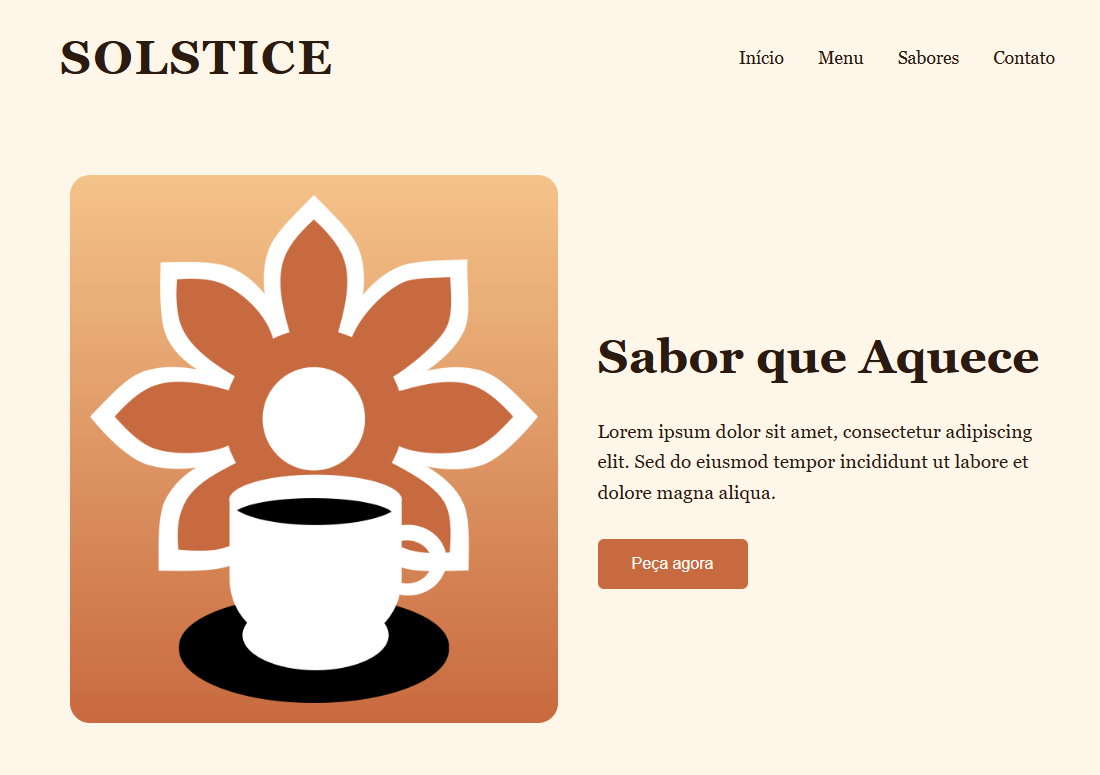 Neste projeto desenvolvi o layout de um site para uma cafeteria fictícia chamada “Solstice Café”. A ideia central foi criar uma identidade visual acolhedora, com tons quentes, inspirada no clima convidativo de um café artesanal. Busquei transmitir sensações de conforto, proximidade e sabor — elementos essenciais para uma cafeteria que deseja se comunicar com o público de forma cativante.