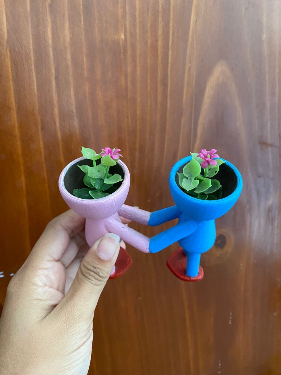 El proyecto consiste en la creación de una figura decorativa formada por dos personas tomadas de la mano, diseñada con una cavidad en la parte superior de sus cabezas para colocar una flor artificial. El diseño combina estética y funcionalidad, convirtiéndose en un objeto decorativo y, al mismo tiempo, en un pequeño organizador para colocar controles u otros accesorios