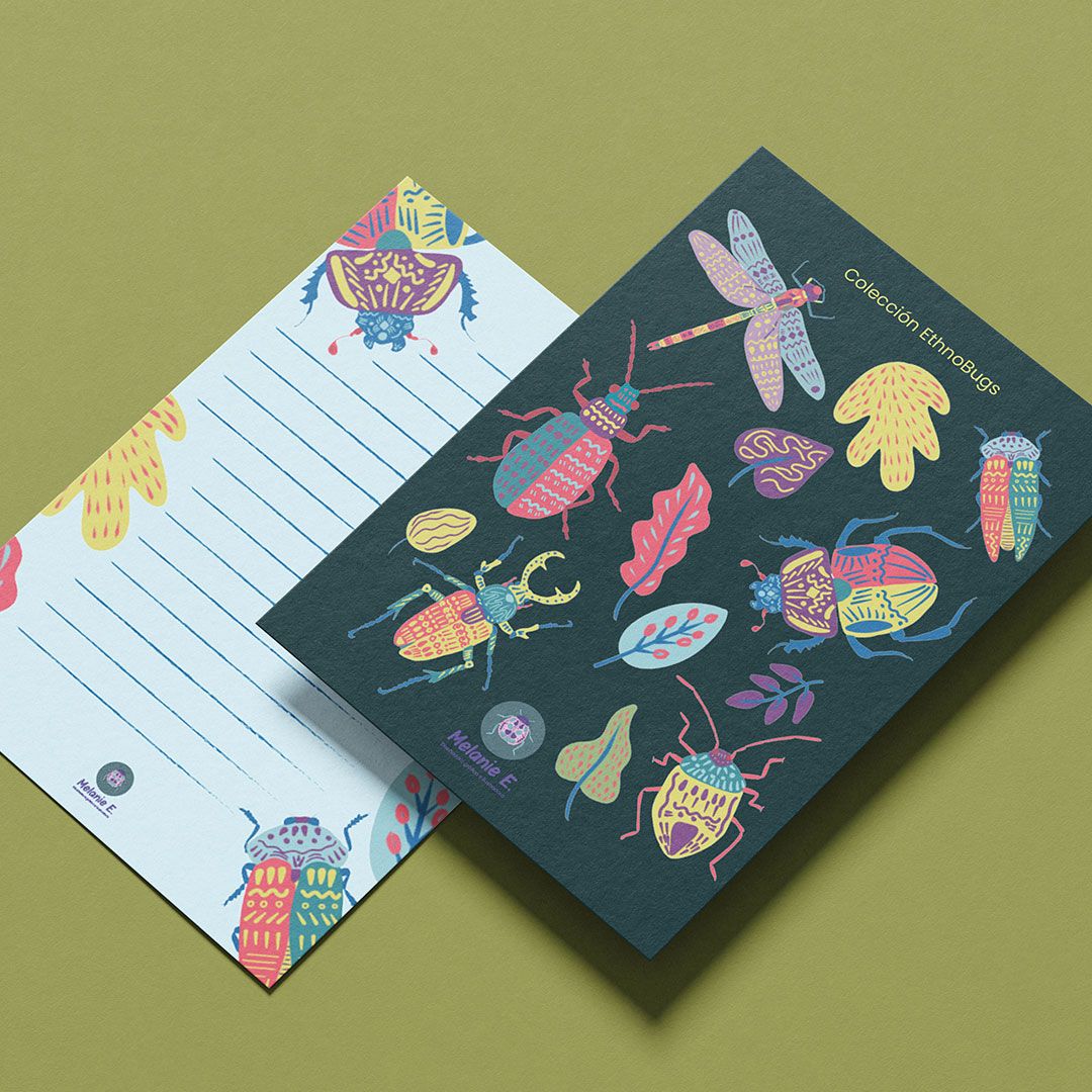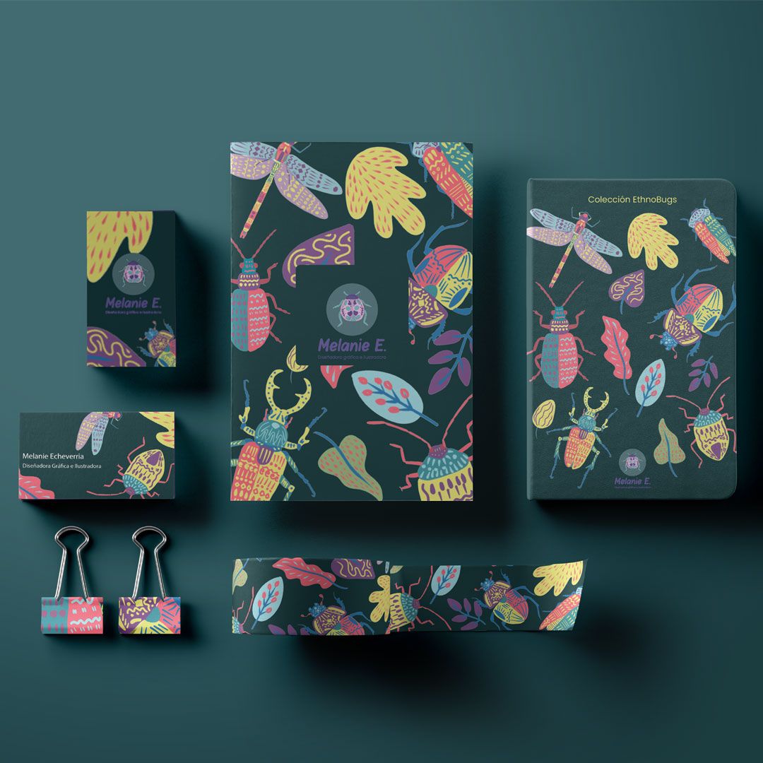 Me encantan los insectos, sus colores, sus formas. Decidí ilustrar varios de ellos y me gustó combinar lineas estilo tribal y étnico, utilice colores contrastantes para resaltaran sobre fondo oscuro.