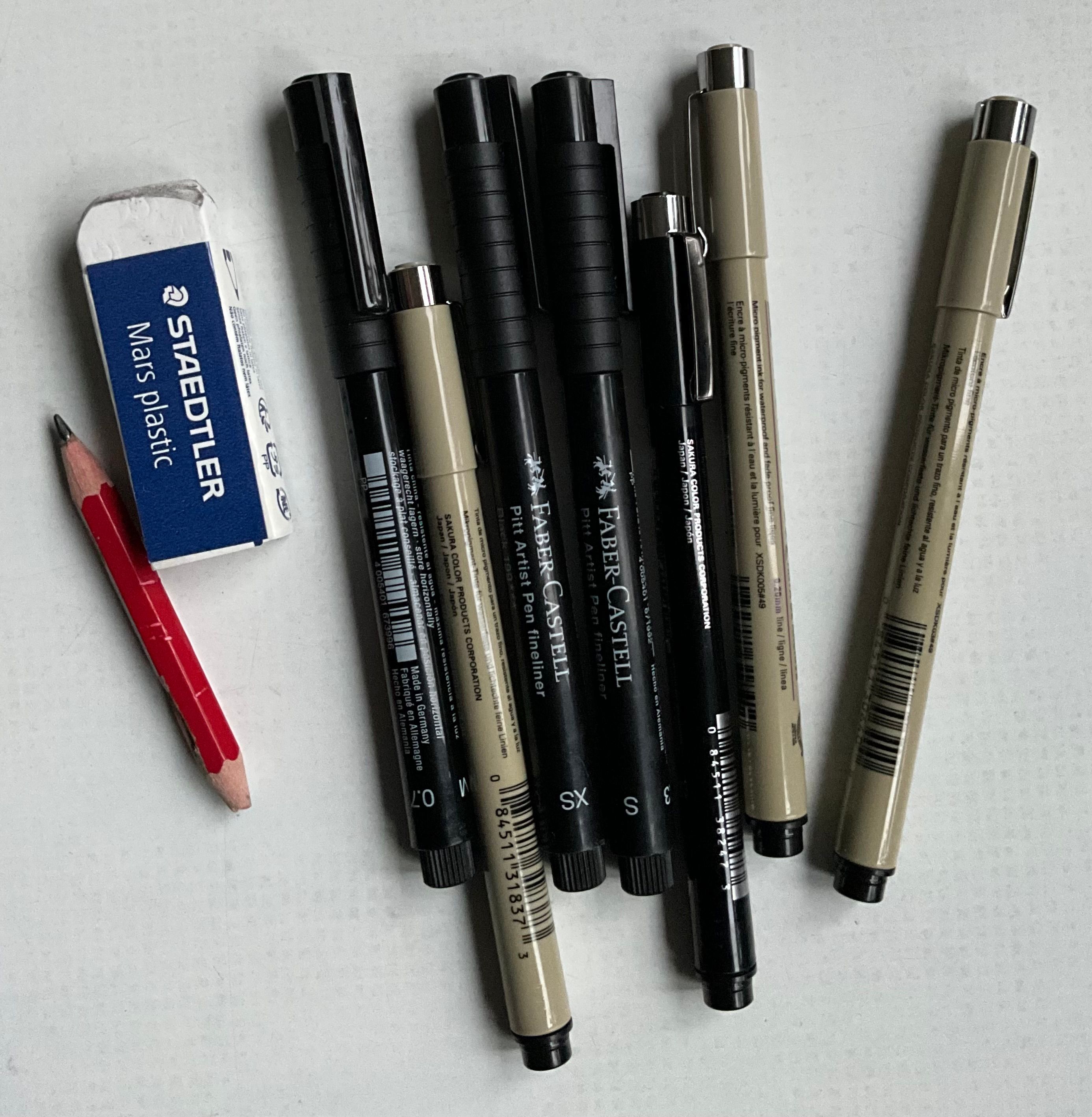 Ich habe für dieses Projekt ein Projektbuch der Firma Kunst & Papier verwendet, Bleistift, Radiergummi und Fineliner verschiedener Marken in den Stärken 0,3 bis 0,05.