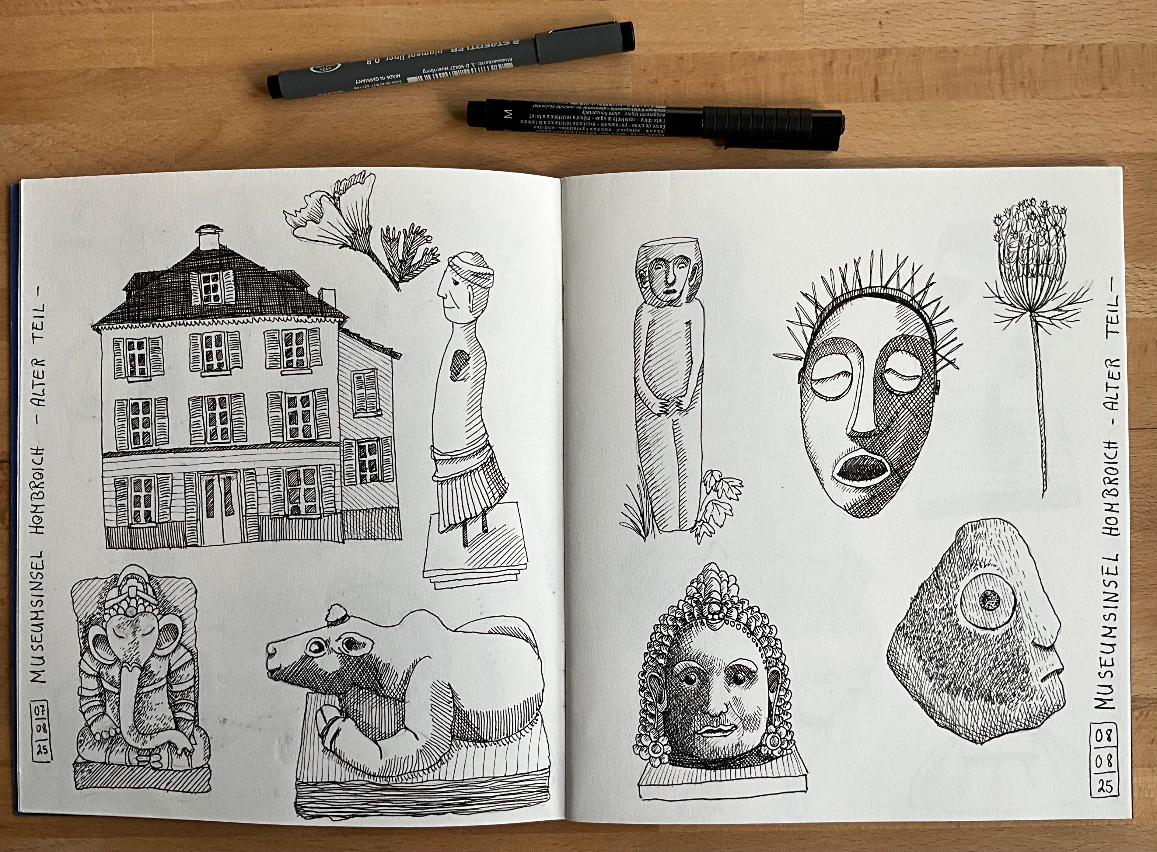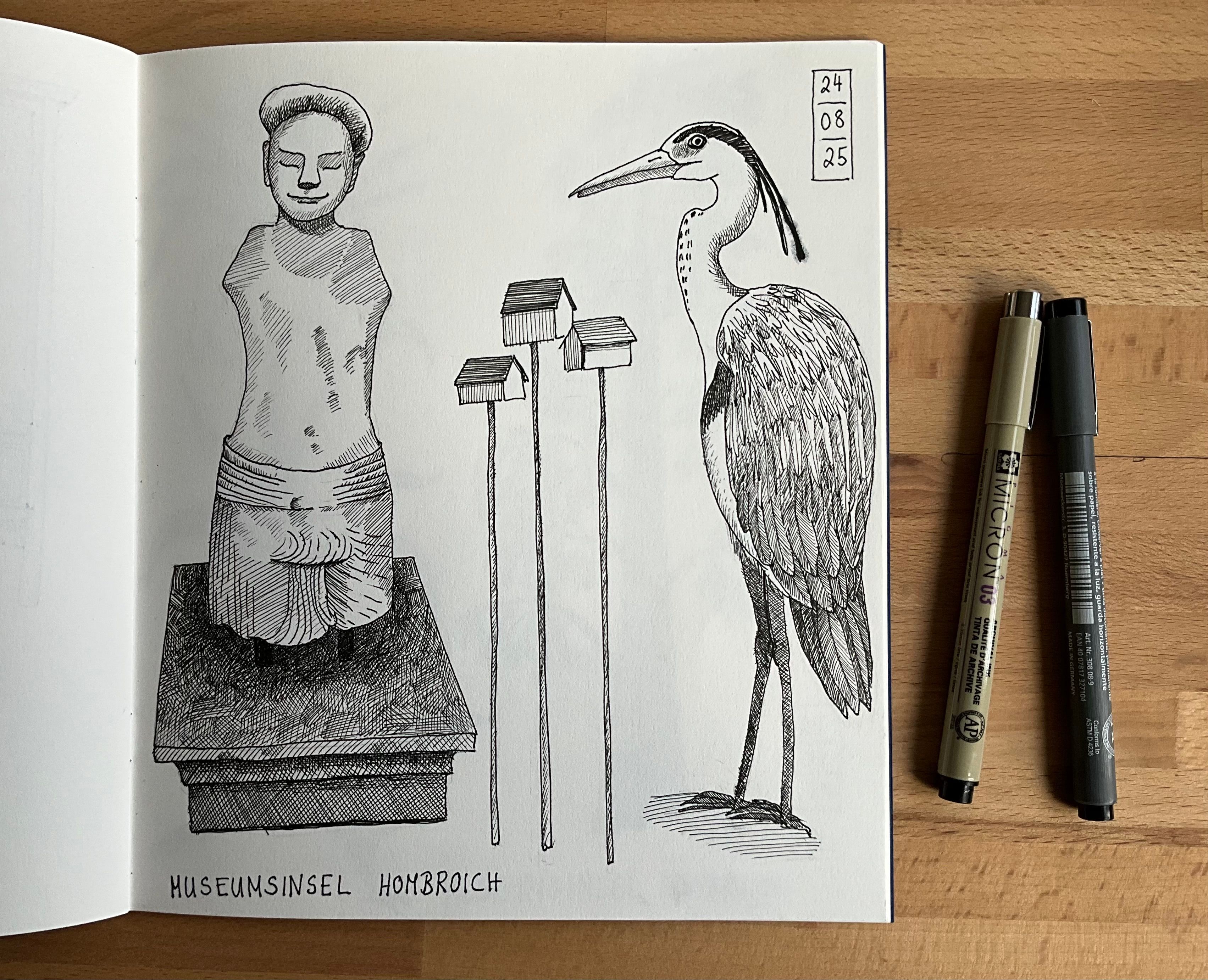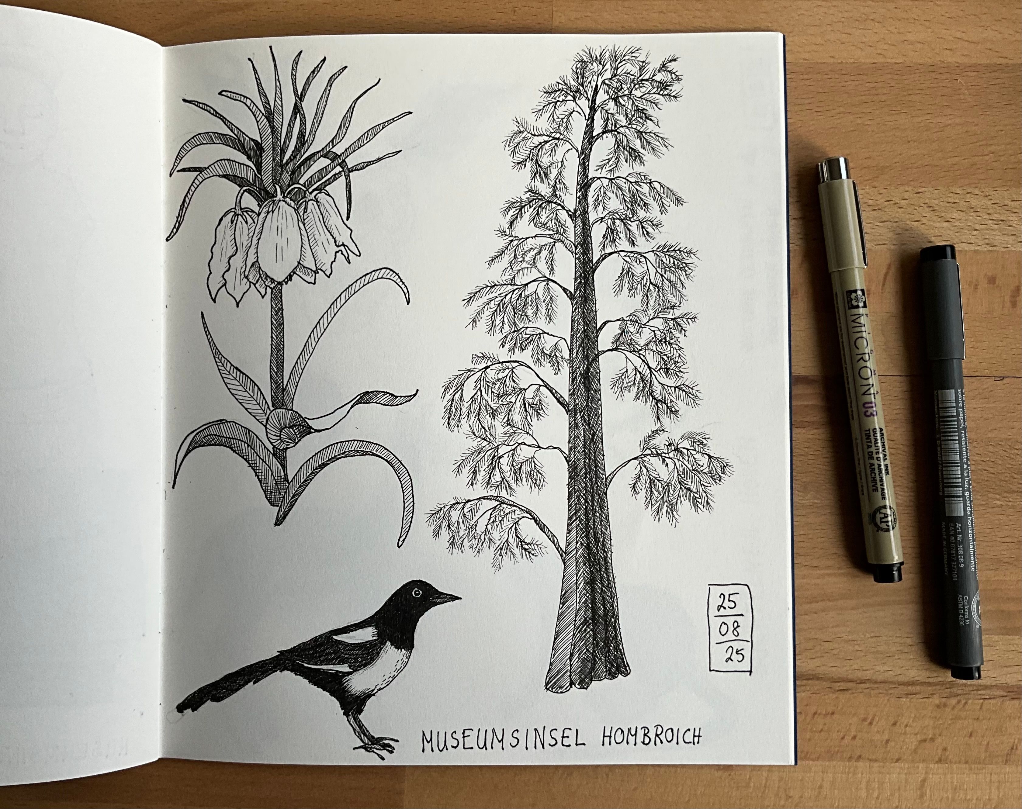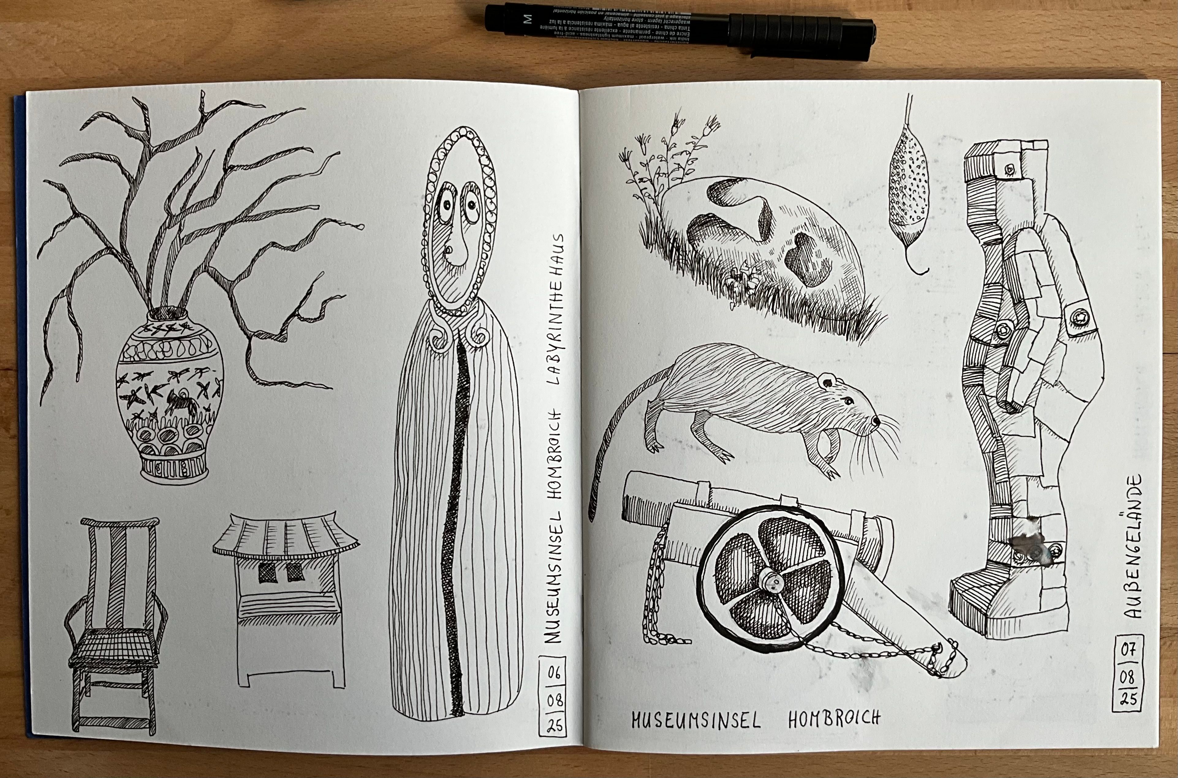 Als Projekt für diesen Kurs habe ich ein Zeichenheft mit Zeichnungen angelegt. Mein Thema war die Museumsinsel Hombroich. Hier verbindet sich Natur und Kunst.
