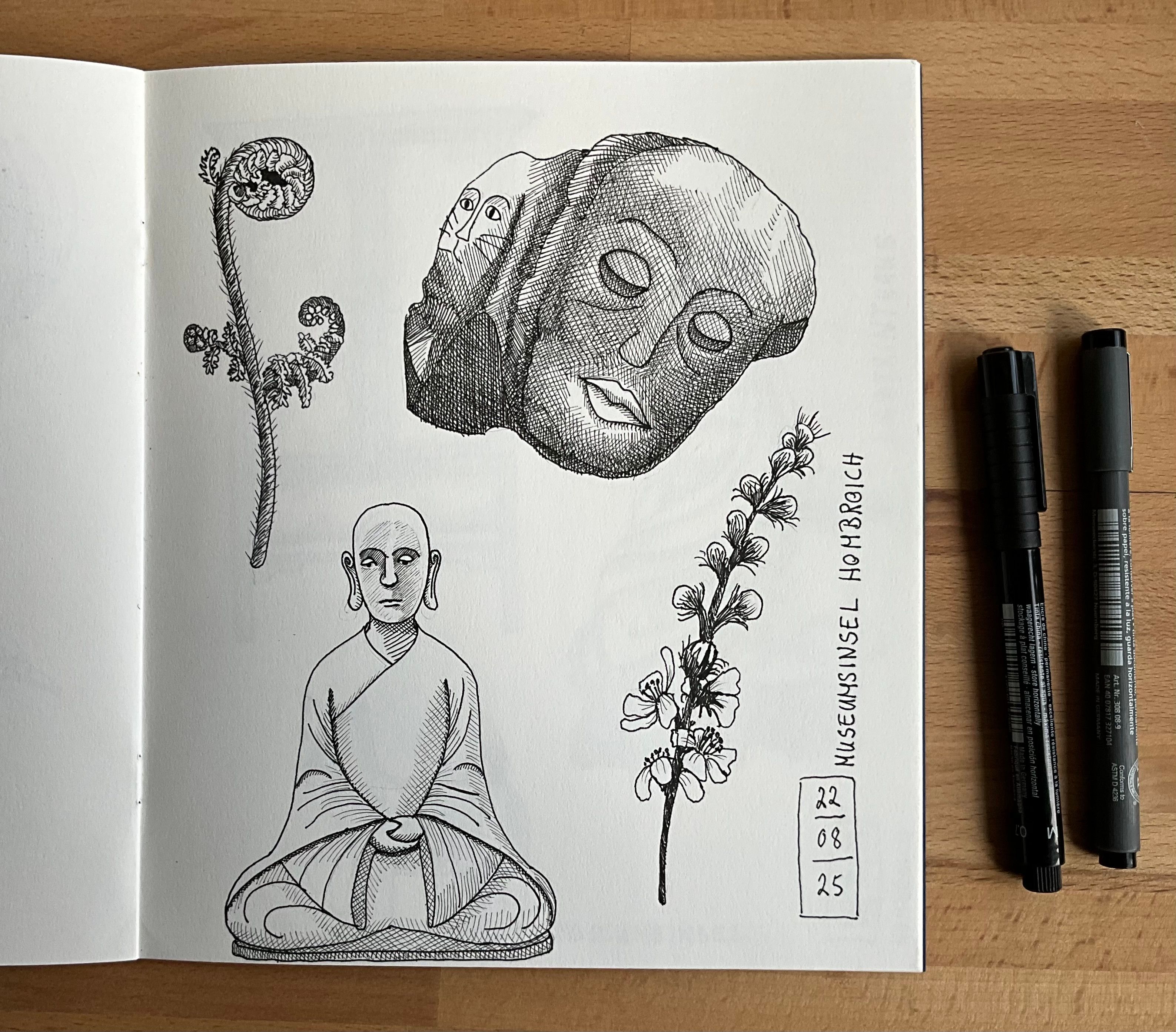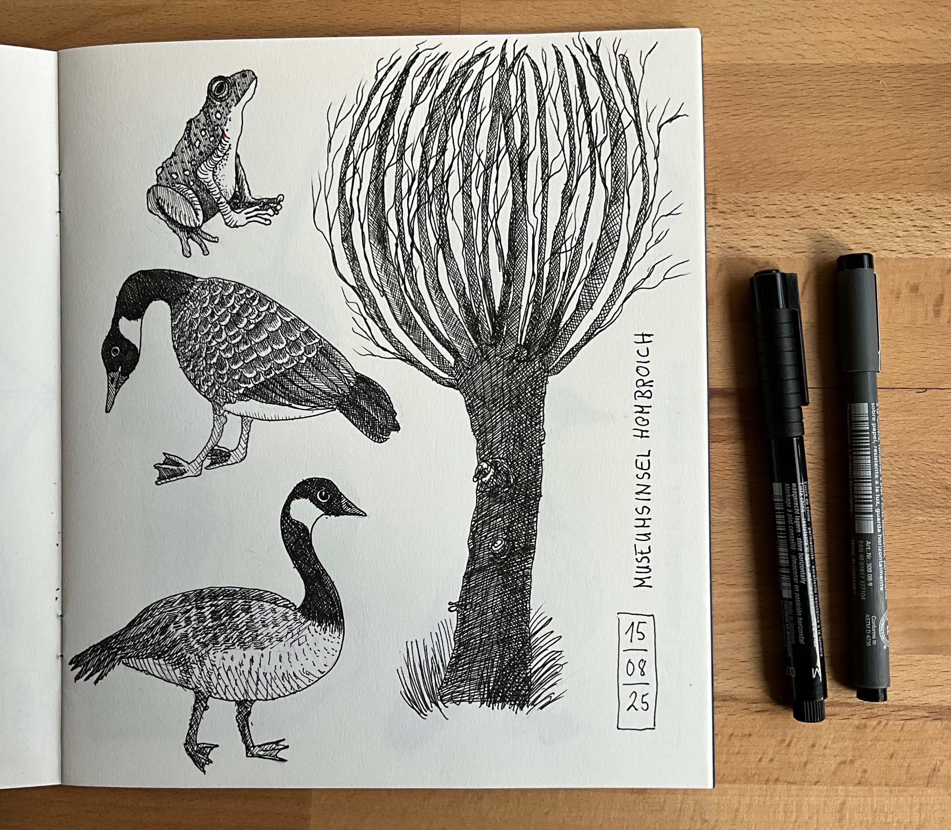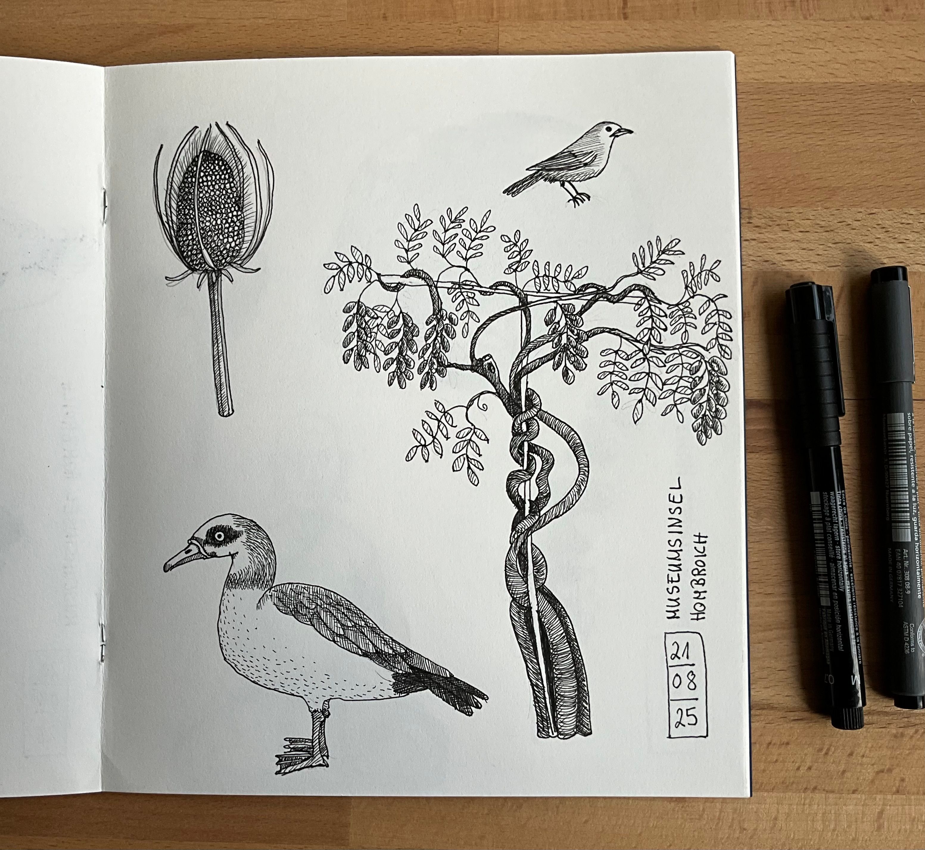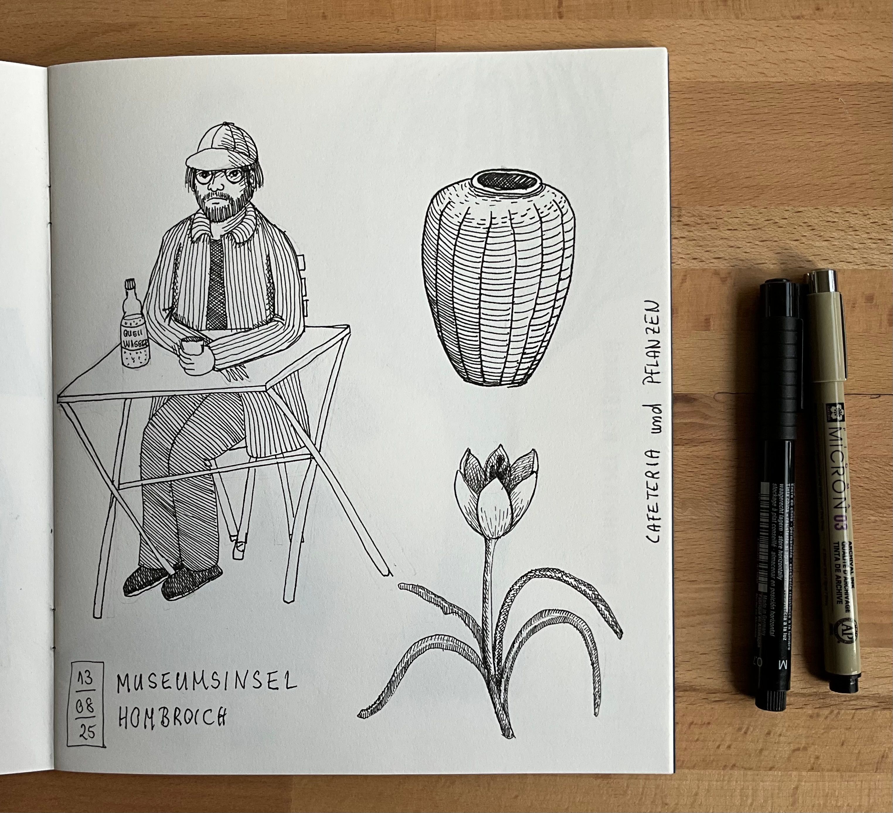Als Projekt für diesen Kurs habe ich ein Zeichenheft mit Zeichnungen angelegt. Mein Thema war die Museumsinsel Hombroich. Hier verbindet sich Natur und Kunst.