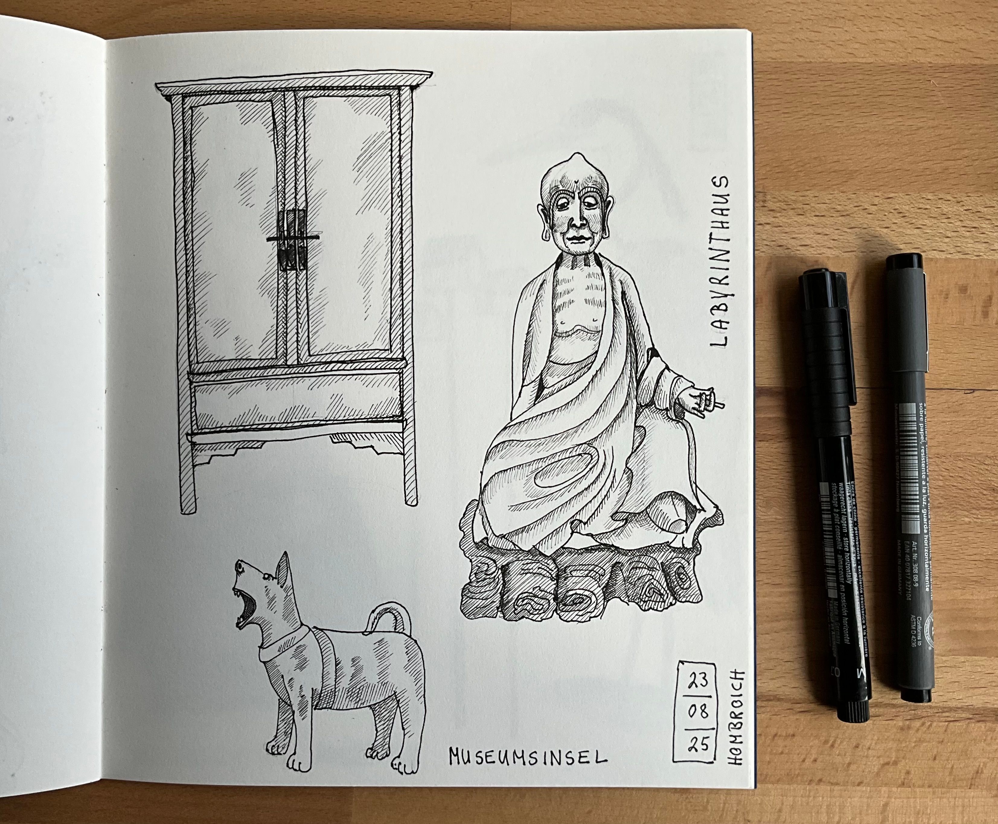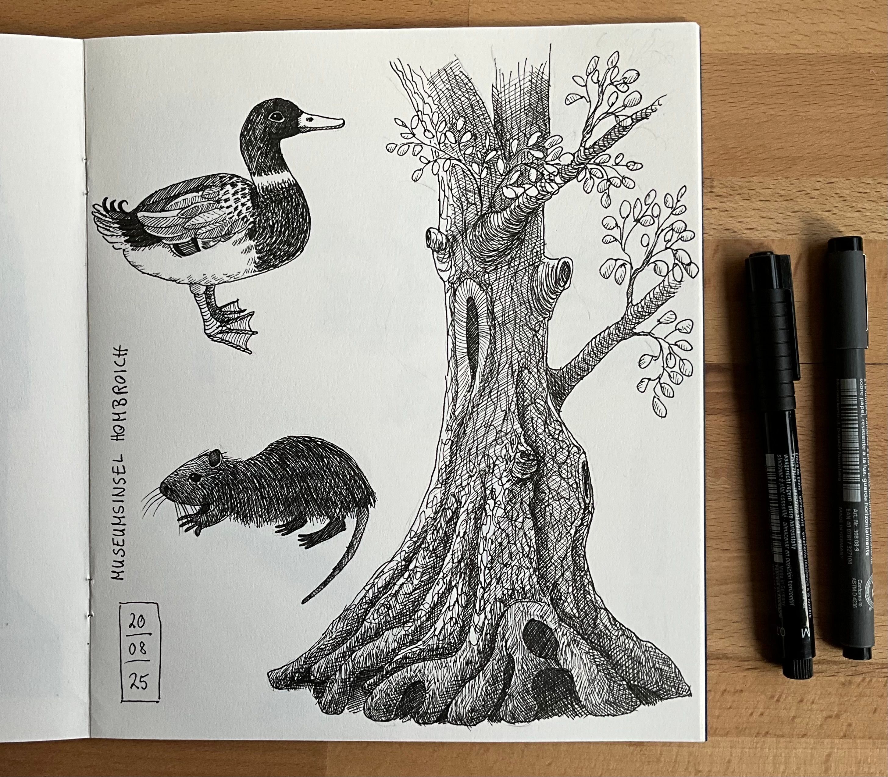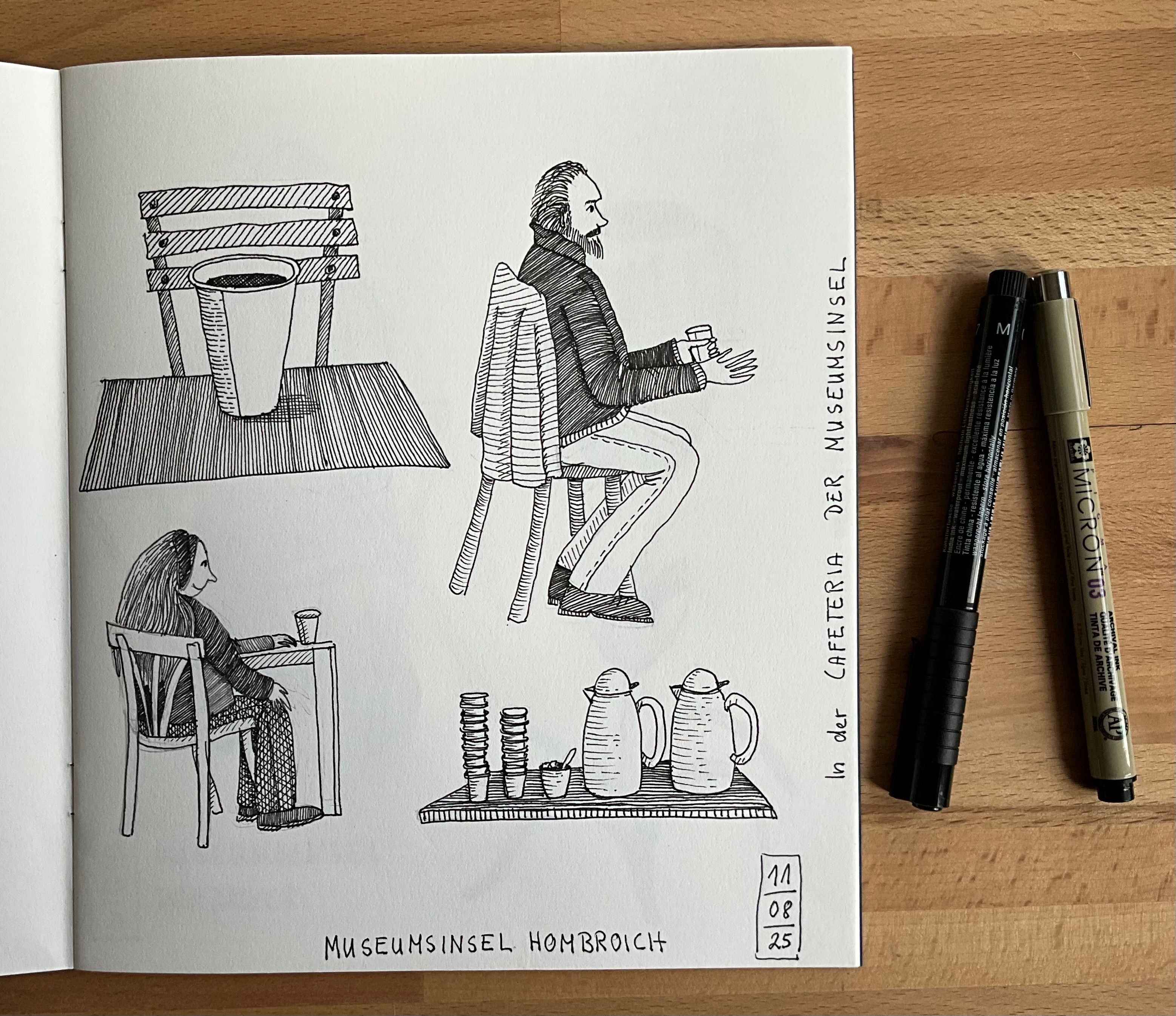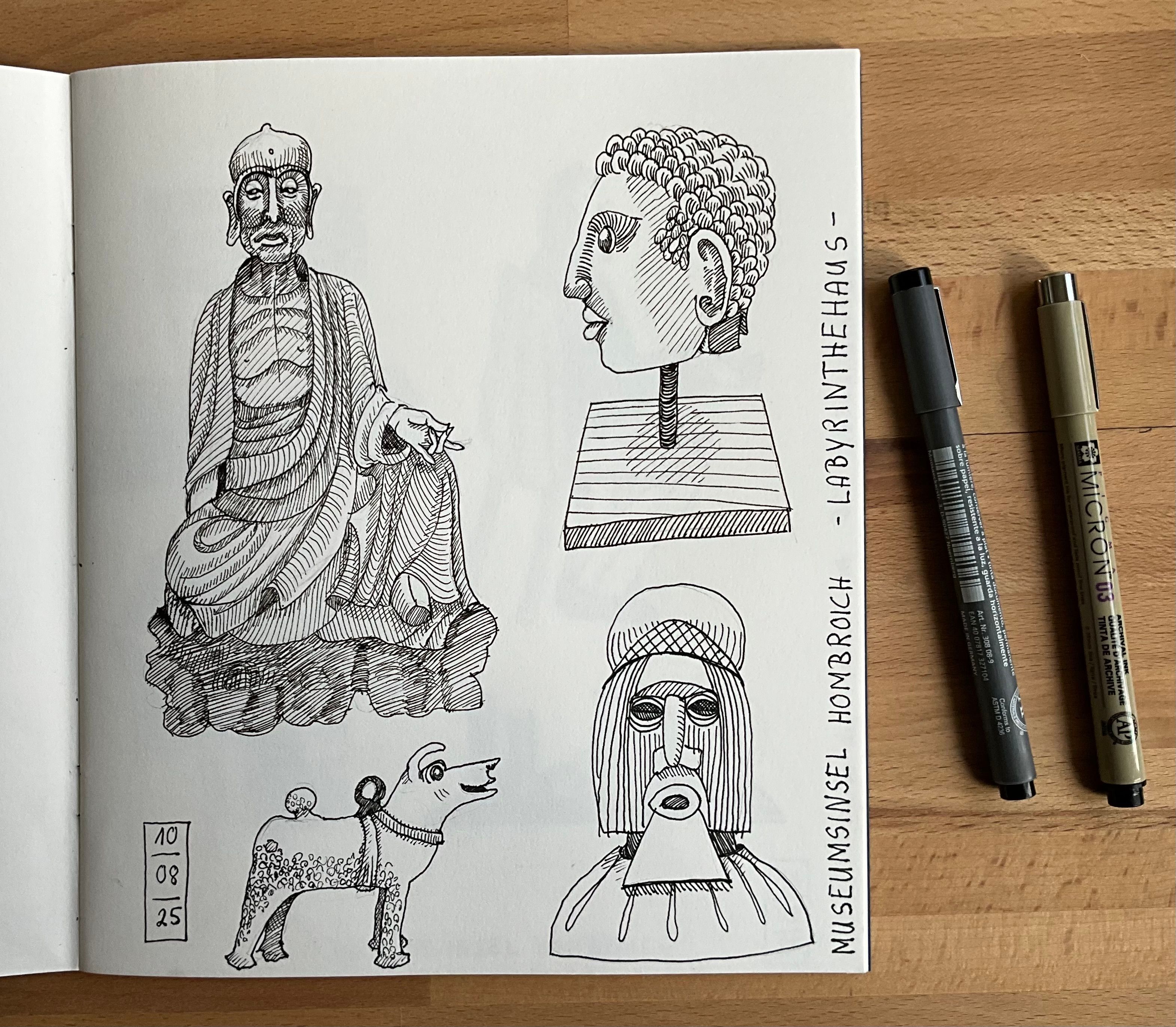 Als Projekt für diesen Kurs habe ich ein Zeichenheft mit Zeichnungen angelegt. Mein Thema war die Museumsinsel Hombroich. Hier verbindet sich Natur und Kunst.
