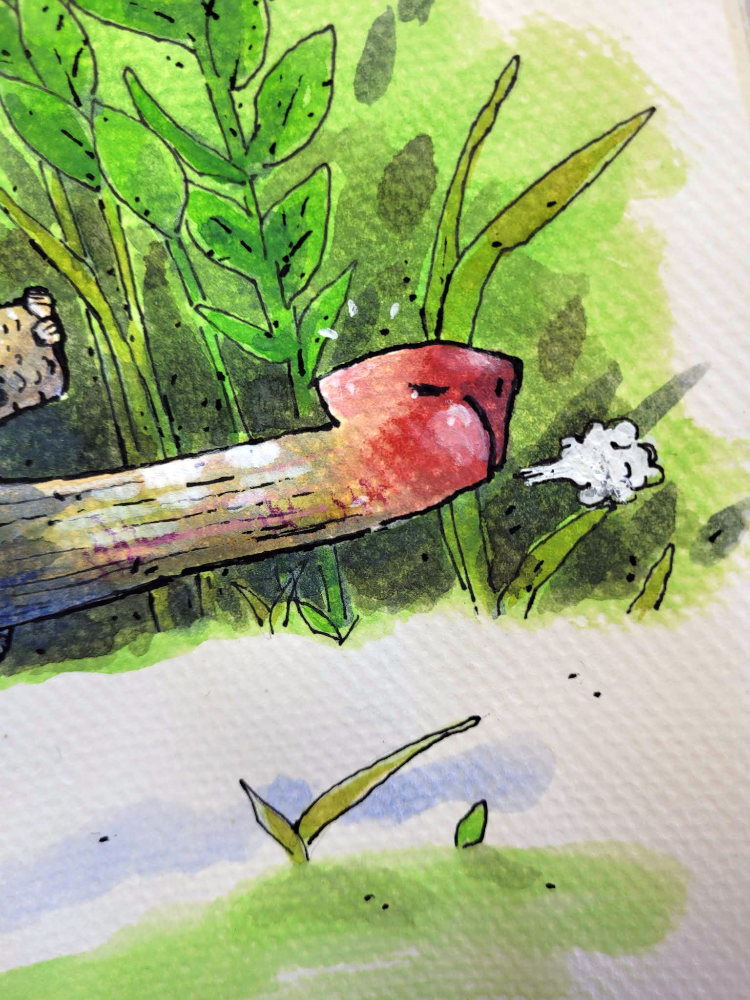 Untuk gambar ini, saya menggunakan cat gouache, media favorit saya. Untuk menonjolkan gradasi warna tertentu, pensil warna adalah alat yang bagus dan mudah digunakan. Untuk garis luarnya, pena Pilot hitam sederhana sudah cukup. Mengapa mempersulit sesuatu jika Anda bisa membuatnya sederhana?